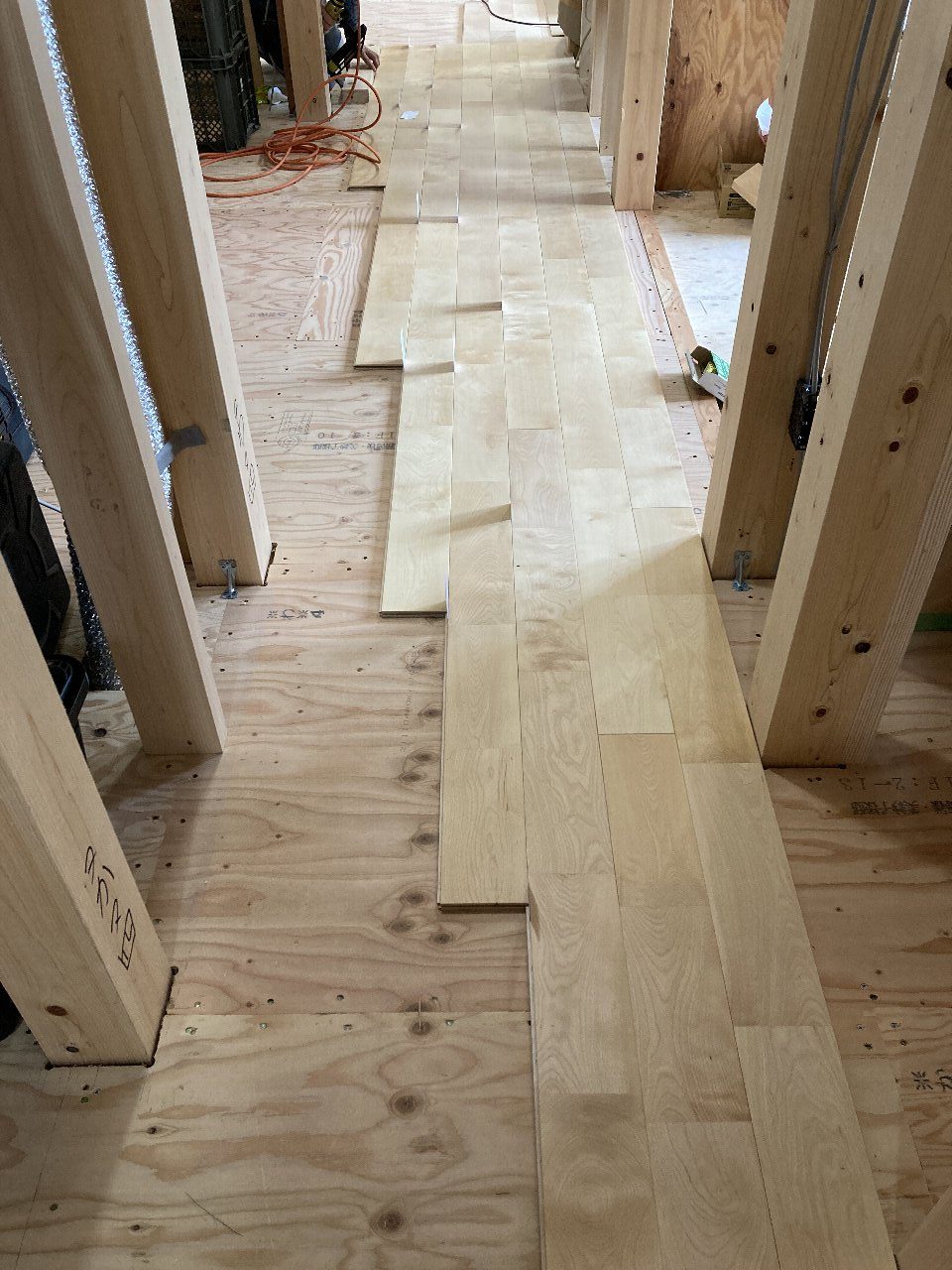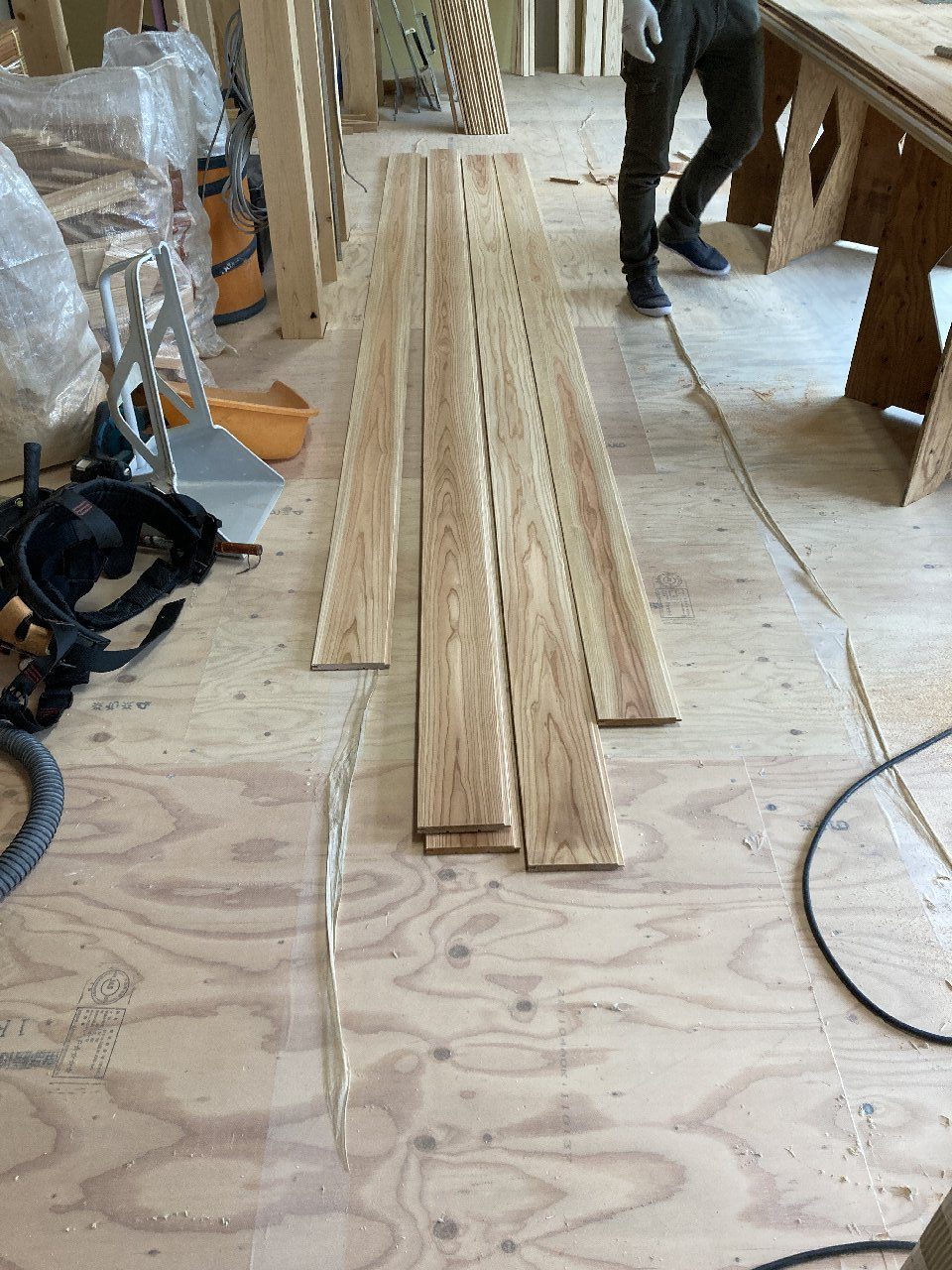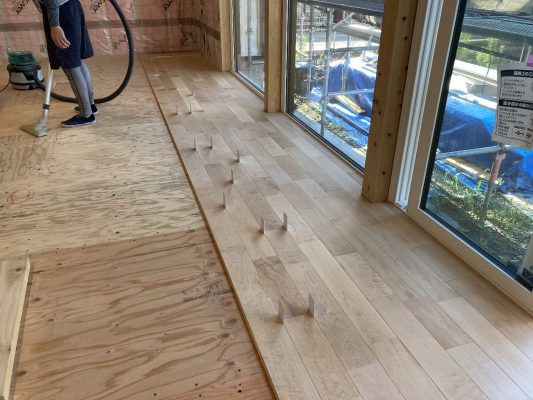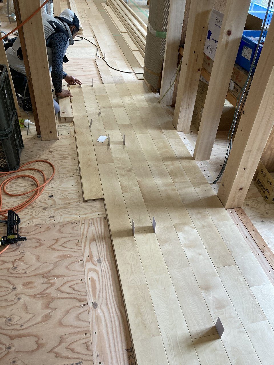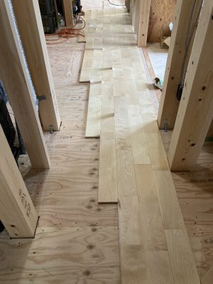 1階は、s井棟梁がLDKの床材を張り始めています。こちらは、幅広のメープル材。広い空間なのでとても見栄が良いです👍