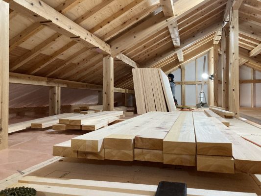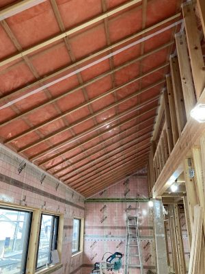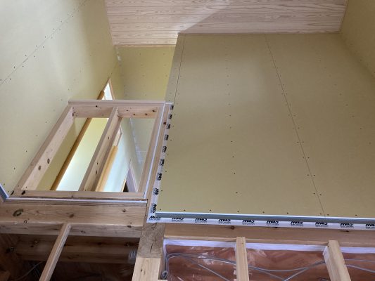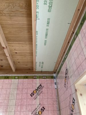 2階は、勾配天井の断熱材が施され、仕上げの羽目板の下地まで完了しています。また、2階の床にはプラスターボードも張られました。プラスターボードを床の仕上げ材の下に施す事によって、1階への遮音効果と2階への延焼防止効果があります。