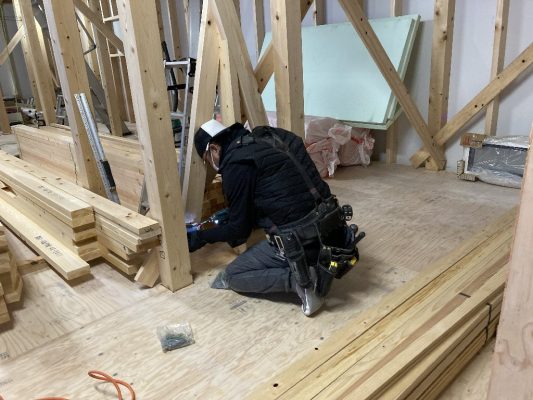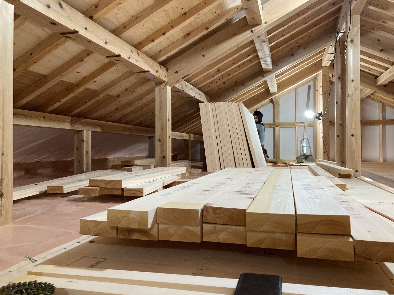 s井棟梁は、小屋裏収納の内壁下地に取りかかっています。こちらには、熱交換器付床下換気システム『澄家』のエコエアーシステムも設置される予定です。暖かい空気が上に上がる為、暖房時にその空気を床下に戻すシステムです。