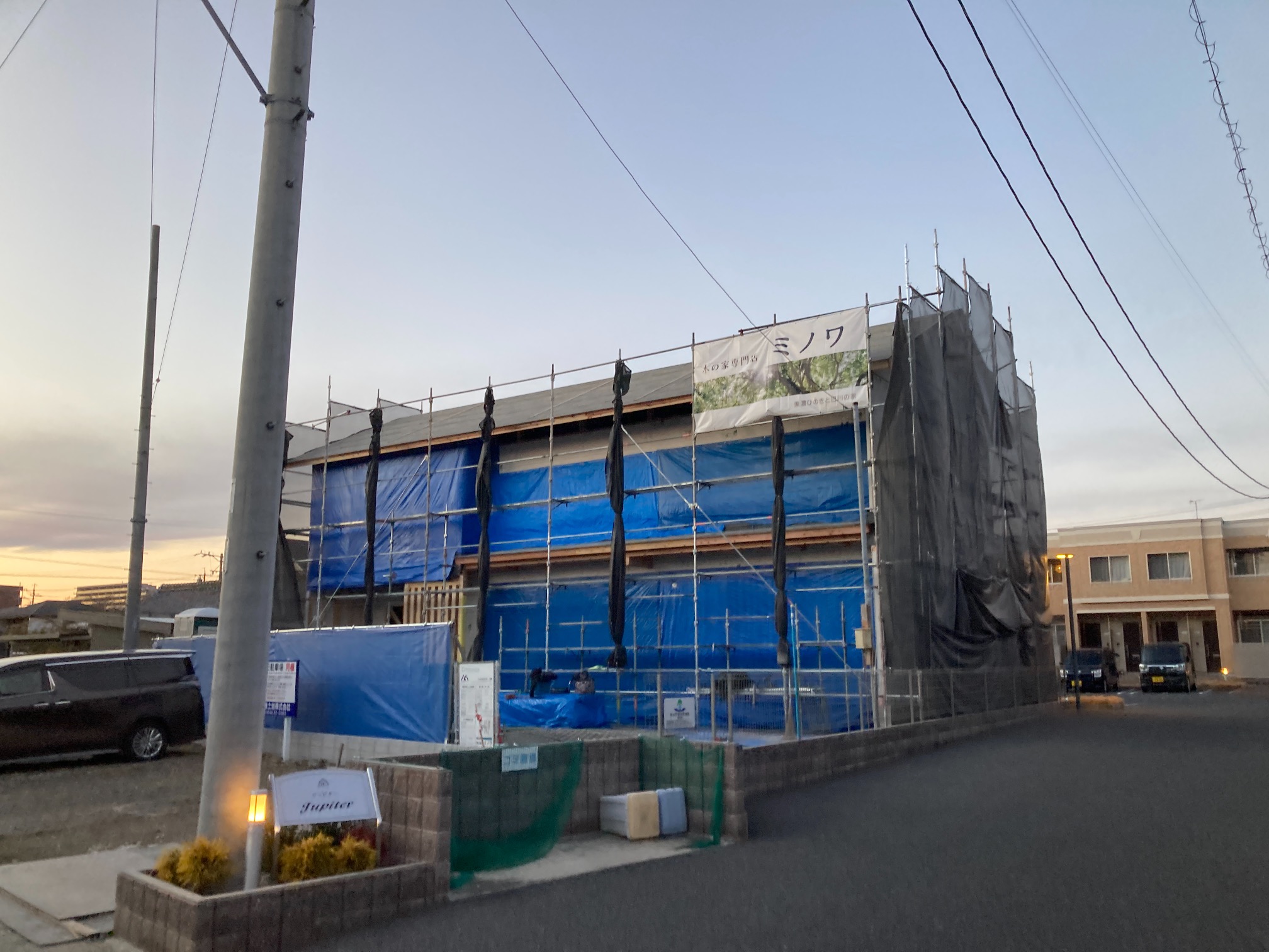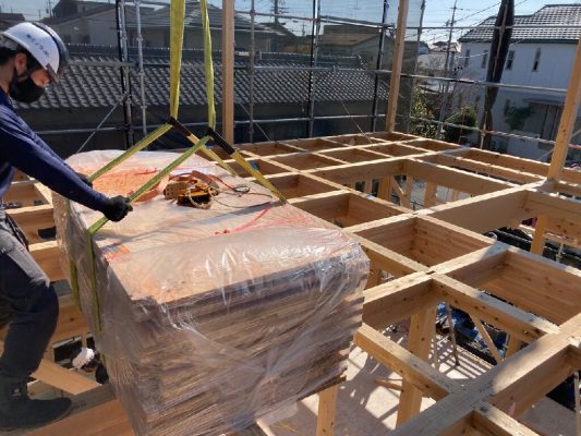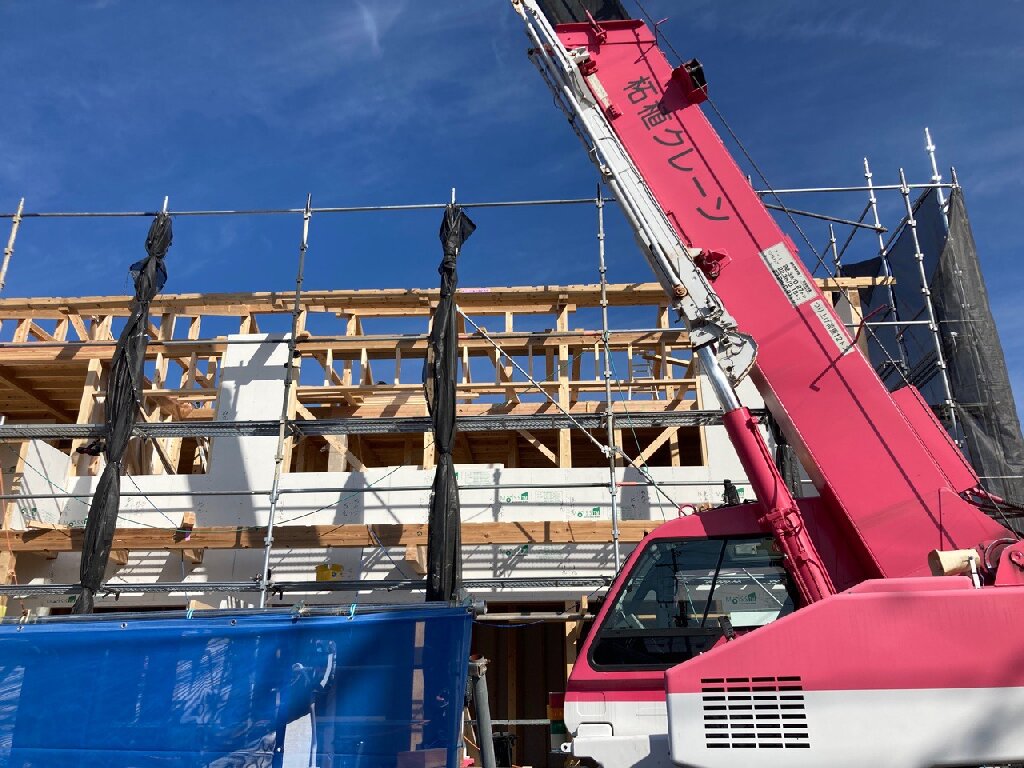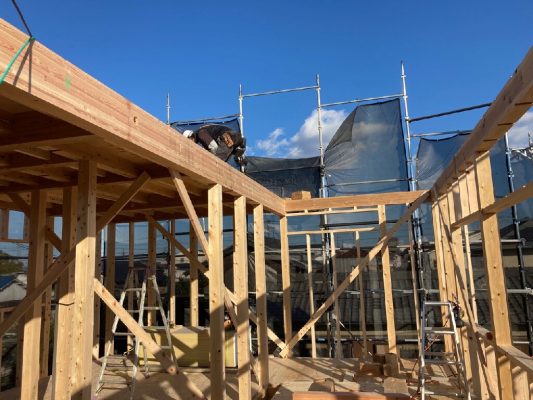 ミノワでは、1物件ずつ一人の大工さんが担当して仕上げていきますので、この建方時に大変な外周部の構造用面材の仮打ちまで一気に行う様にしています。屋根のルーフィングまで張ったら、建方完了です。kn様、mn様、上棟おめでとうございました。合板等材料が入らない等の関係で工期が少しずつ伸びてしまっていてごめんなさい💦完成までよろしくお願いいたします。