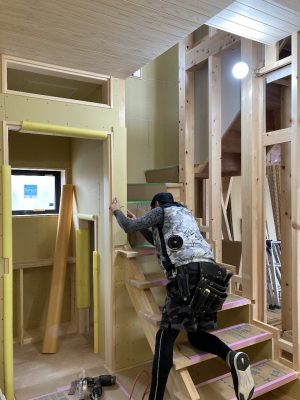 2階は、間仕切り壁がほぼ完成しつつあります。h谷川君は今日までで、来週からはk保木君にバトンタッチです。s井棟梁は、2階から踊り場までの階段を架け終えて、1階の枠材の取付を行っています。ここまで来たら後ちょっと。いよいよ、造作工事も終盤にさしかかってきました。