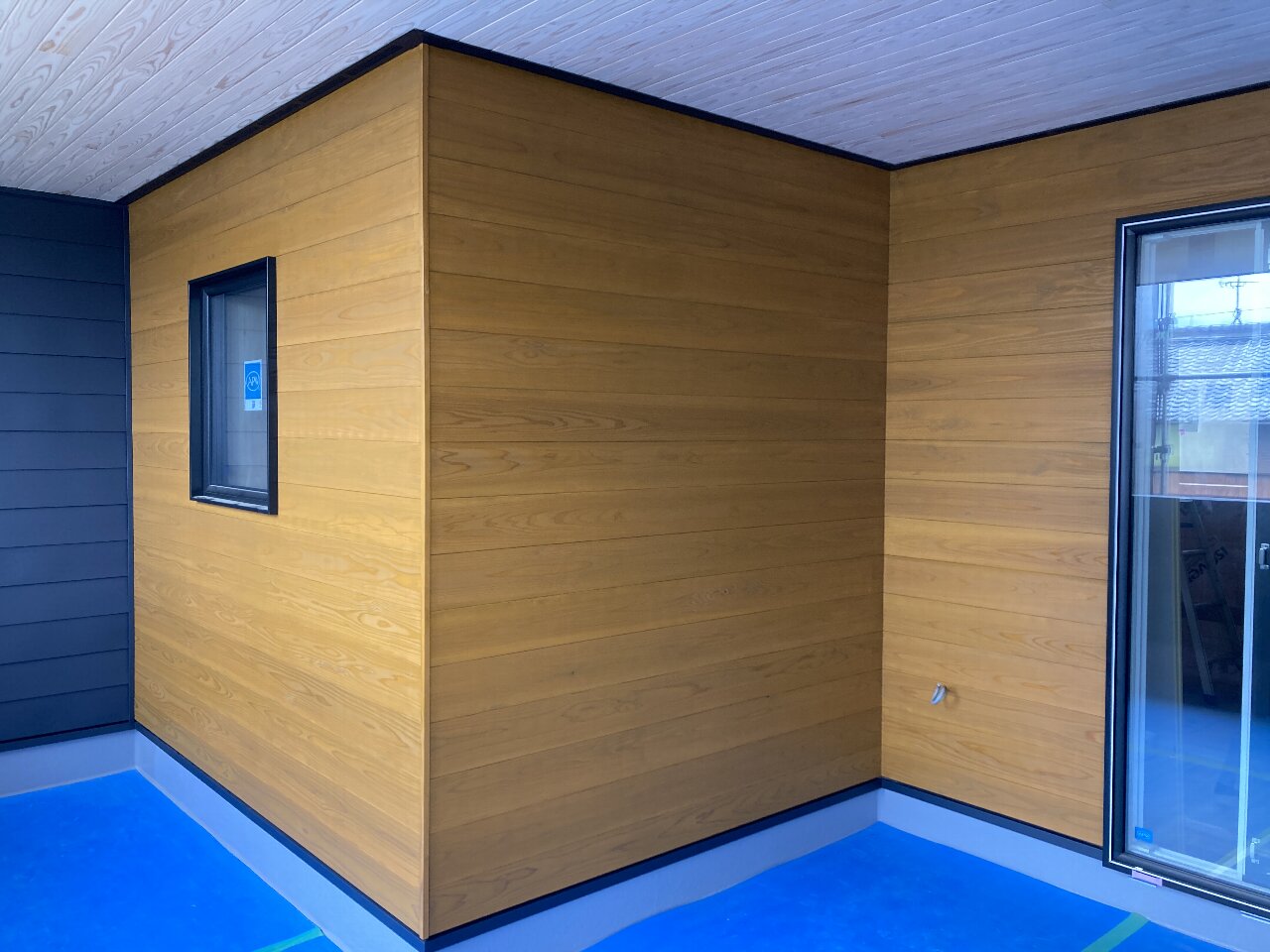 そして、外壁杉板部分も、h屋塗装さんによって塗装されました。黒い外壁やサッシがくっきり際立っていい感じですね。