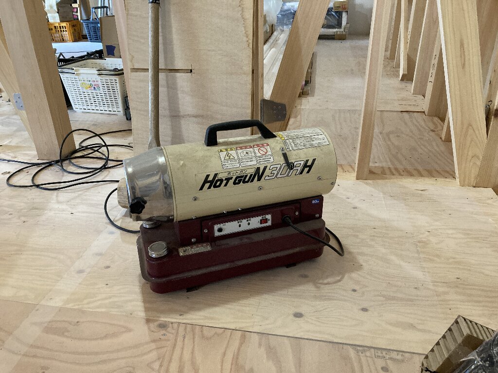 このホットガンと言う見慣れない機械は、ジェットヒーターだそうです。燃料がとてもかかるそうで、本当に寒い時にしか使わないそうです。確かに先週は寒かったですもんね~まだ断熱材が施されていないn様邸には必要でしたよね。