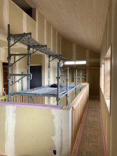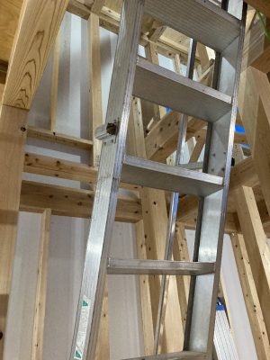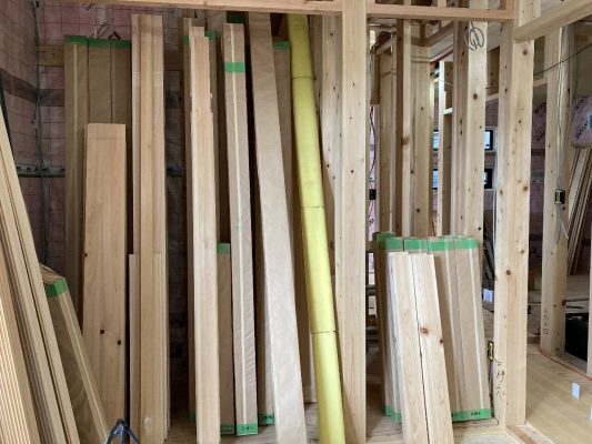 2階はそろそろ、吹き抜け部分の手摺を取り付ける準備に入っています。s井棟梁は1階の残りの石膏ボードを張っています。そして収納部分の棚板も運ばれて来ています。いよいよ木工事も終わりが見えてきました。