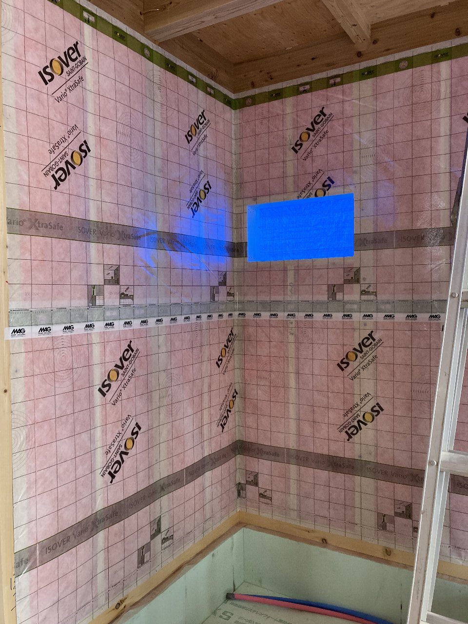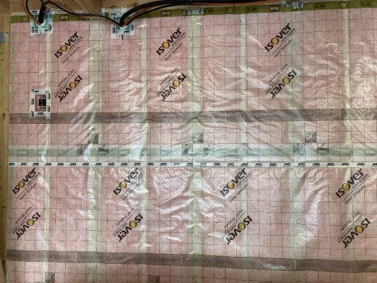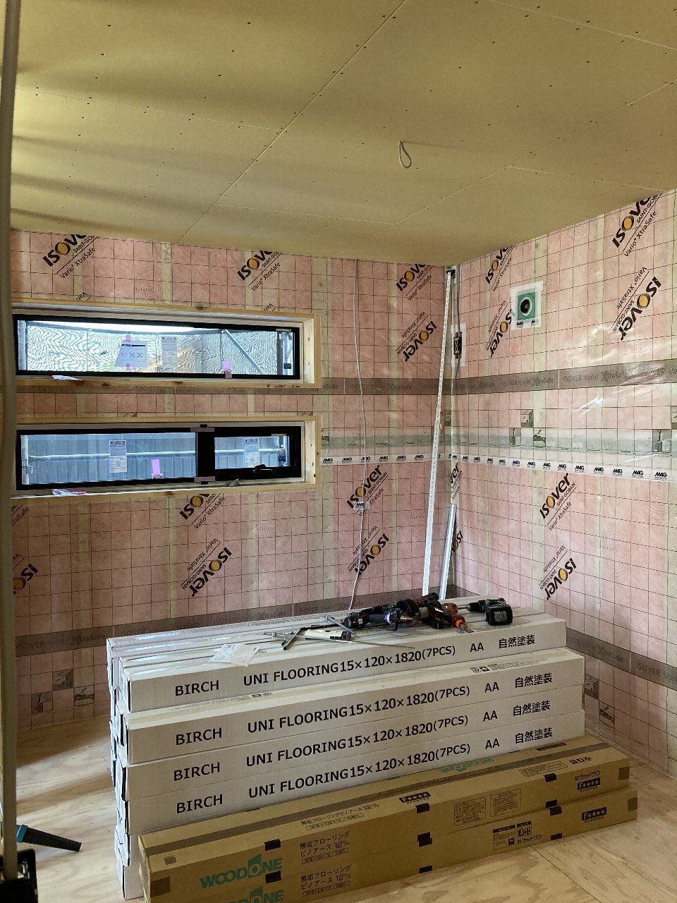 2階の調湿気密シートも張り終えています。今日は乾燥しているのでしょうか?パリッと張りがあります。お肌もこんな風になるといいです~💦