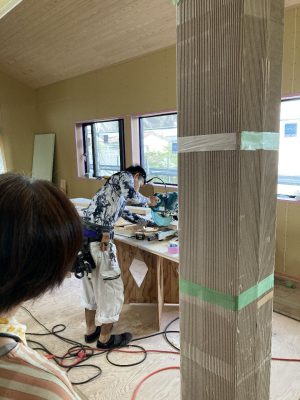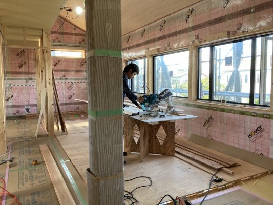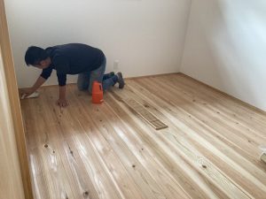 室内は、2階の杉フローリング張りが残り1部屋。今日はh谷川君が張っています。
