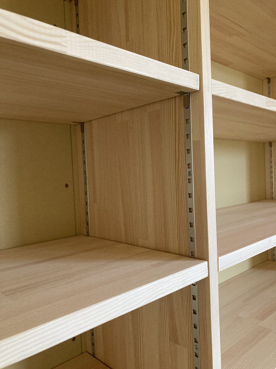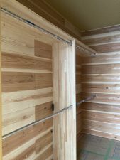 久しぶりにk保木君に会いました。収納部分の杉の相ジャクリ板を張っています。ミノワでは、扉を閉めたままの事が多い収納部分は、湿気がこもり易いため、調湿効果のある板を張る事をお勧めしています。板を張る事で、ご自身で帽子用のフックを取り付けたり、使いながら収納内部を充実させる事も可能なので、お勧めです👍