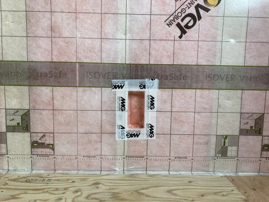 f井電気のh場さんが先日やってきました。外周部の換気穴やコンセント等が取り付けられるところは気密処理をしています。