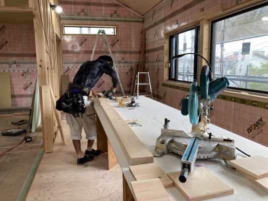 さて、内部は~木工事が大詰めです。k保木君は、パントリーの廻り子や巾木を取り付けています。s井棟梁は?