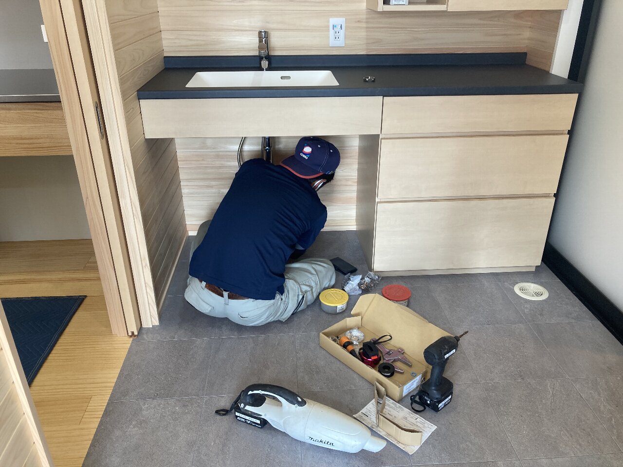 s間さんも、配管の繋ぎに来ています。一人は床下に潜って、上下で作業です💦