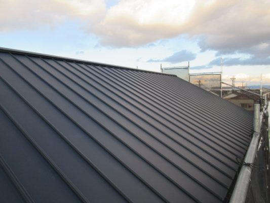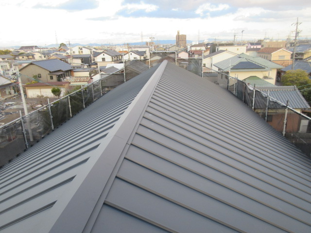 今回、kn様とmn様は、屋根をガルバリュウム鋼板立平葺きにされました。屋根の重みを軽くする事で、建物の頭が軽くなるので耐震に配慮されつつ、すっきりとしたイメージを好まれて決められました。この上には太陽光パネルが載る予定です👍