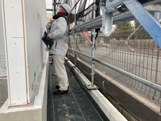 今日は、確認検査機関の中間検査とJIOの瑕疵保障検査を受けました。金物の取付確認、耐力壁の釘打ちピッチなど、細かくチェックされます。