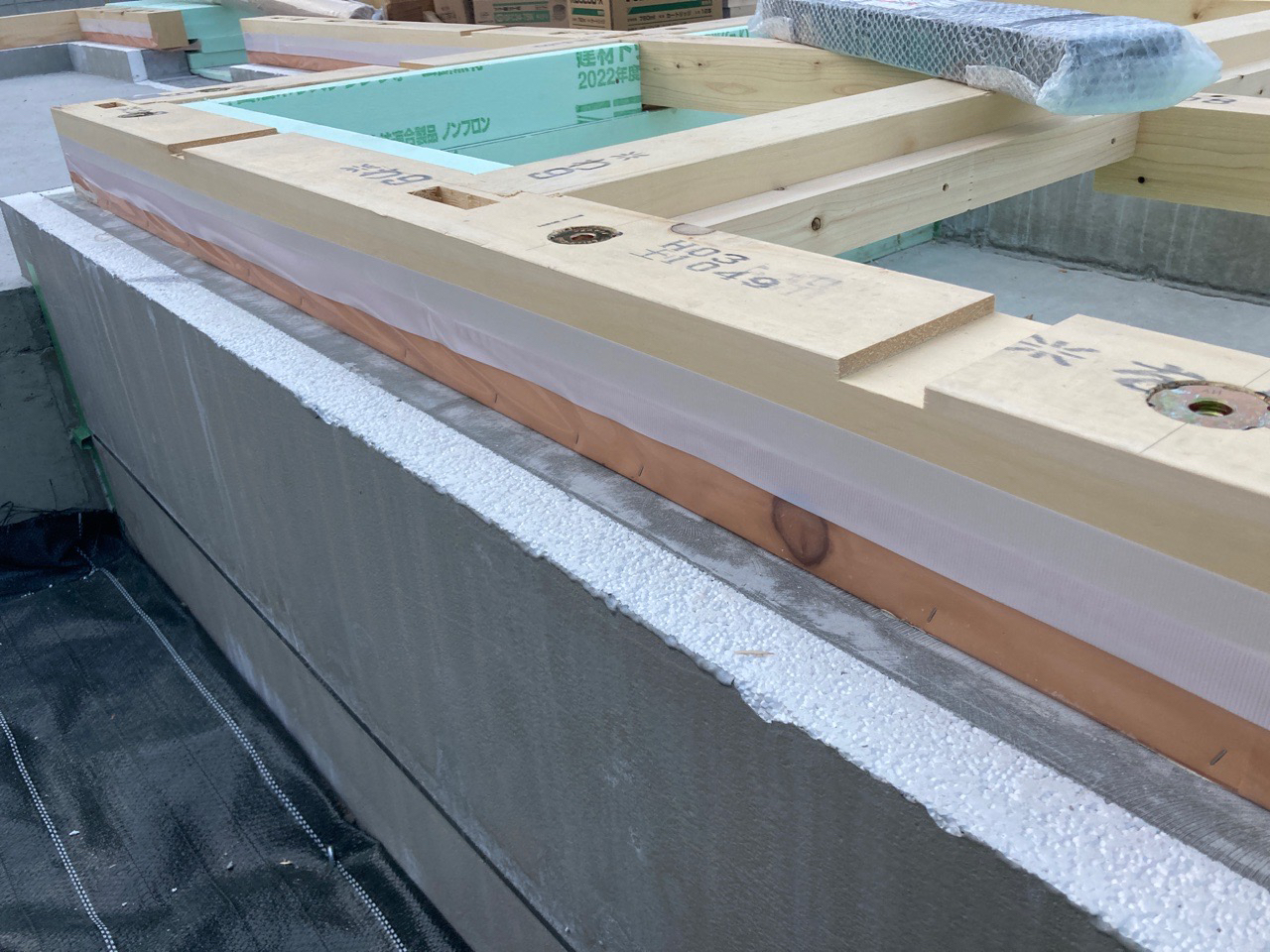 土台伏せが完了しました。基礎と土台の間にはシリコンを打ち気密シートを土台に貼り上げ、基礎からの湿気を遮断します。また、万一仕上げ材から雨水が入り込んでも基礎内側への侵入を防ぐ効果があります。