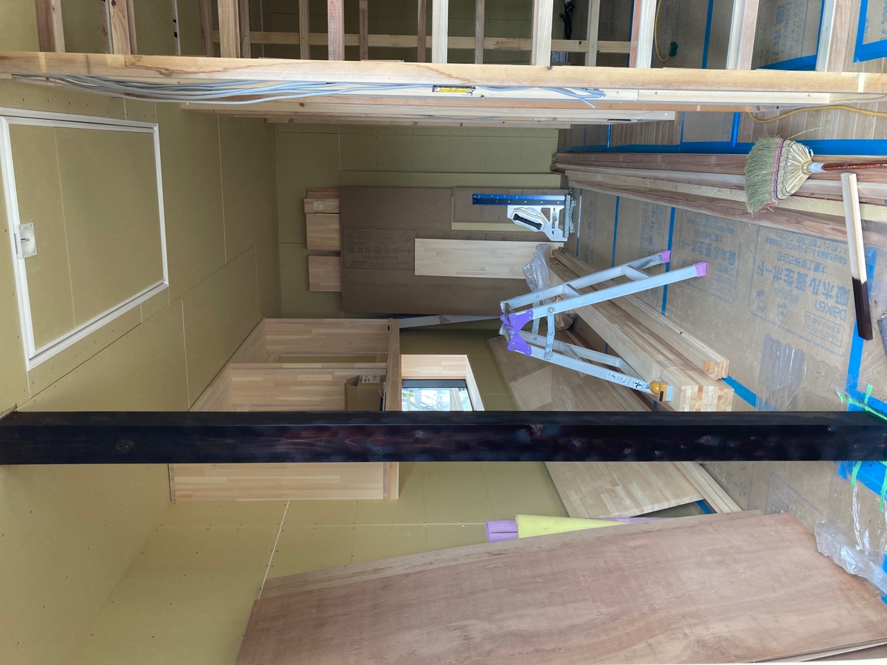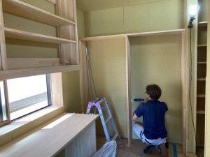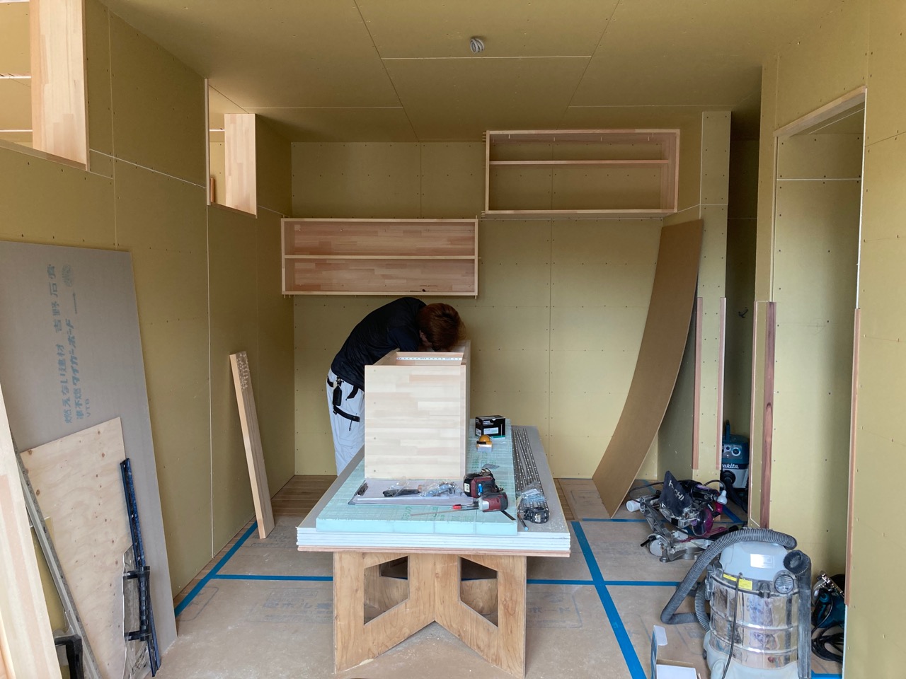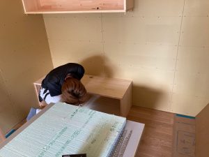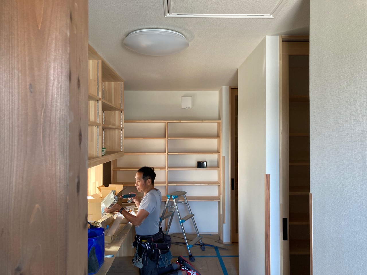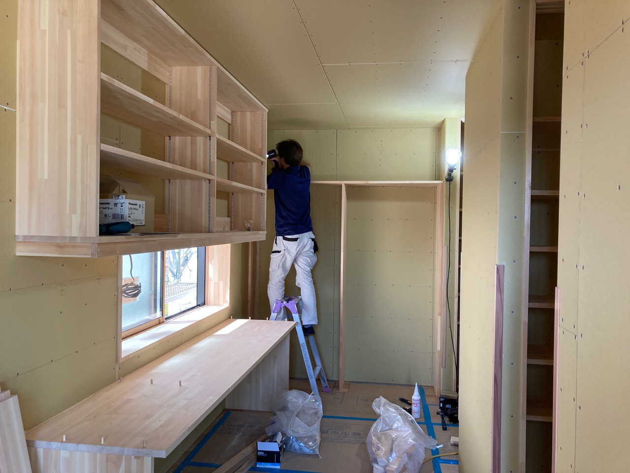 棟梁は各種棚板の組立取付中。だんだんと生活するための内装が整っていきます。
