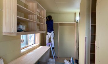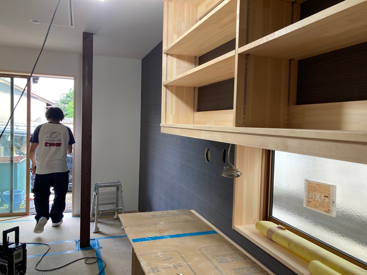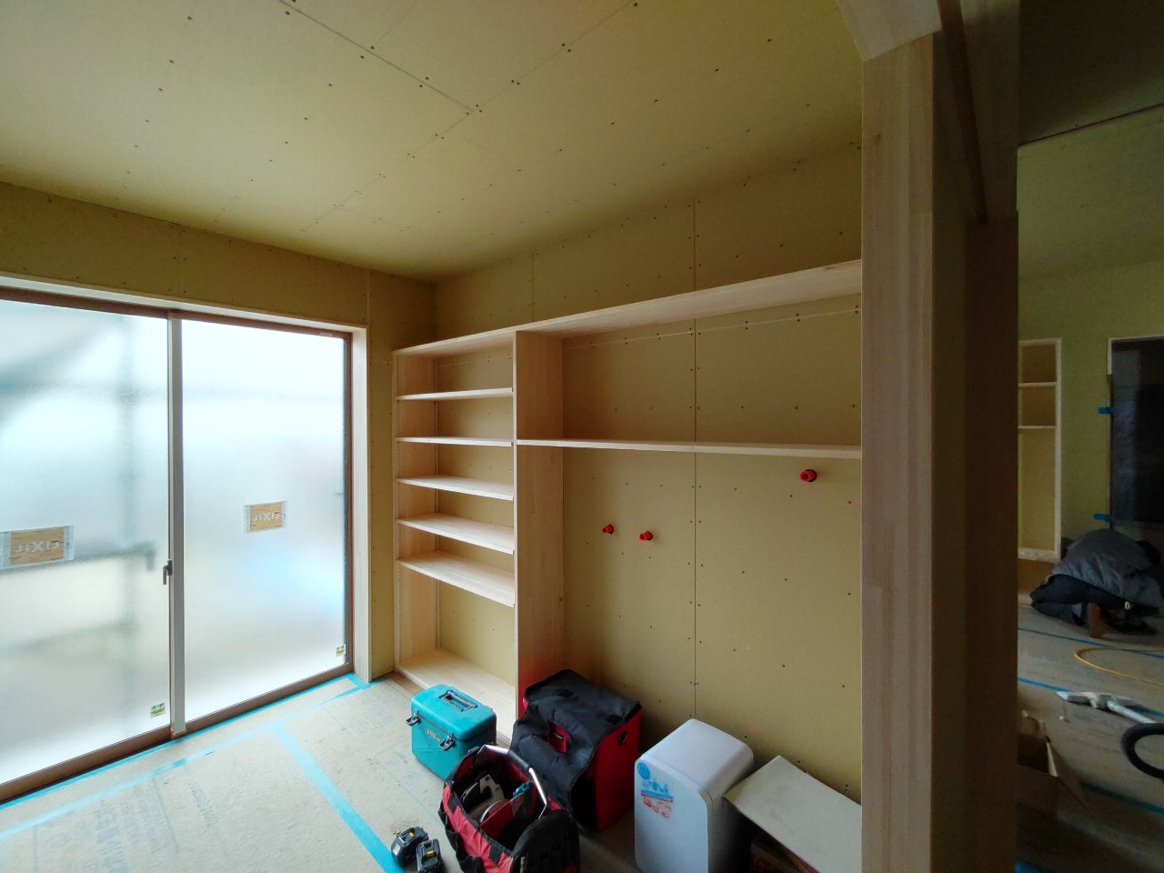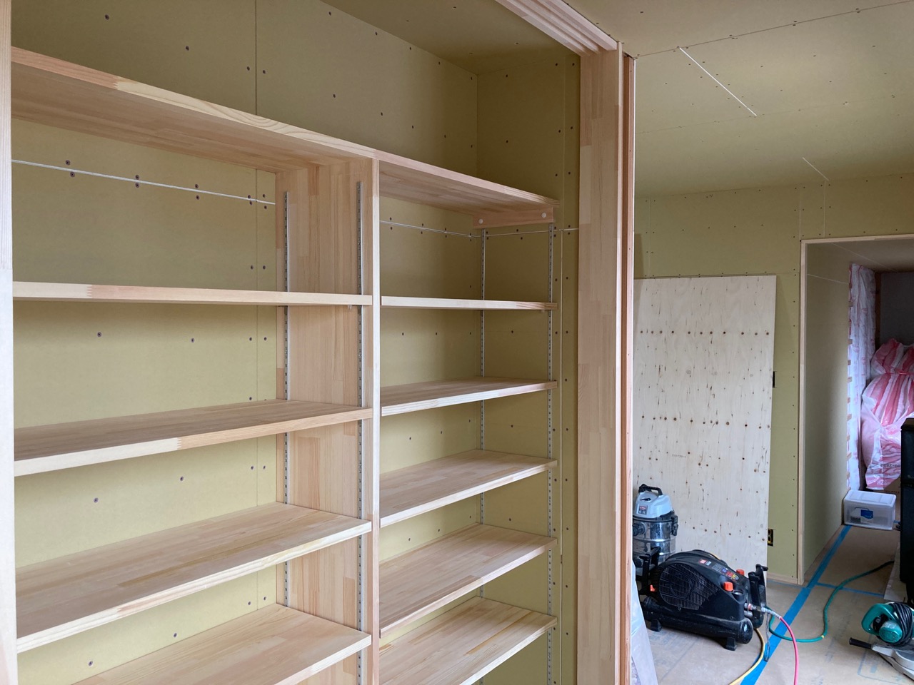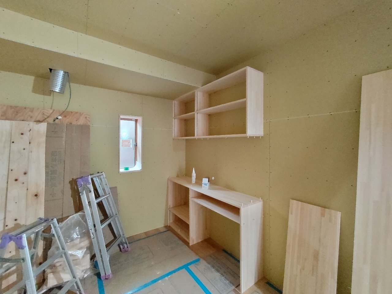 棟梁は各種棚板の組立取付中。だんだんと生活するための内装が整っていきます。