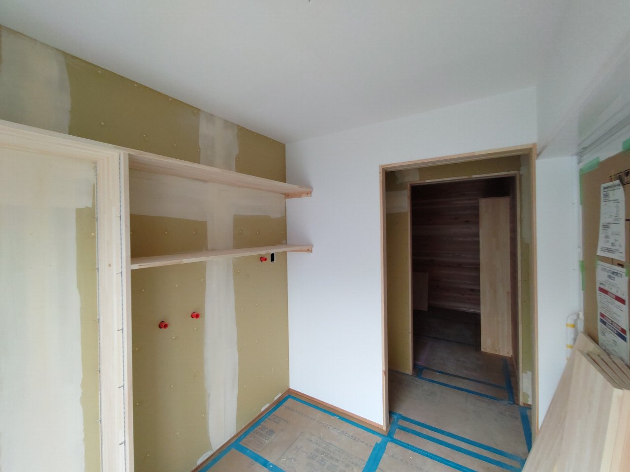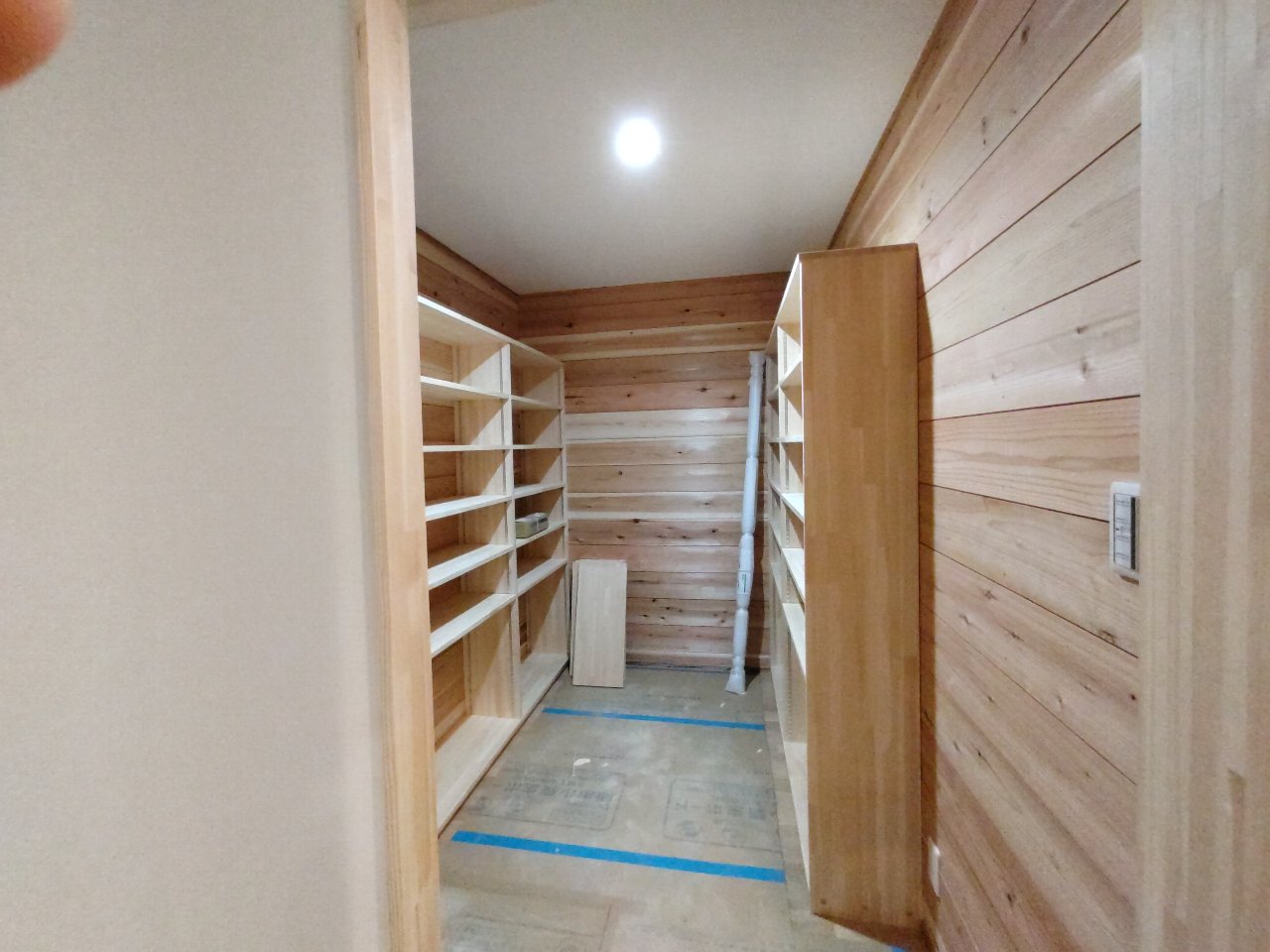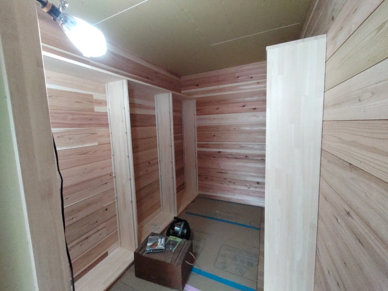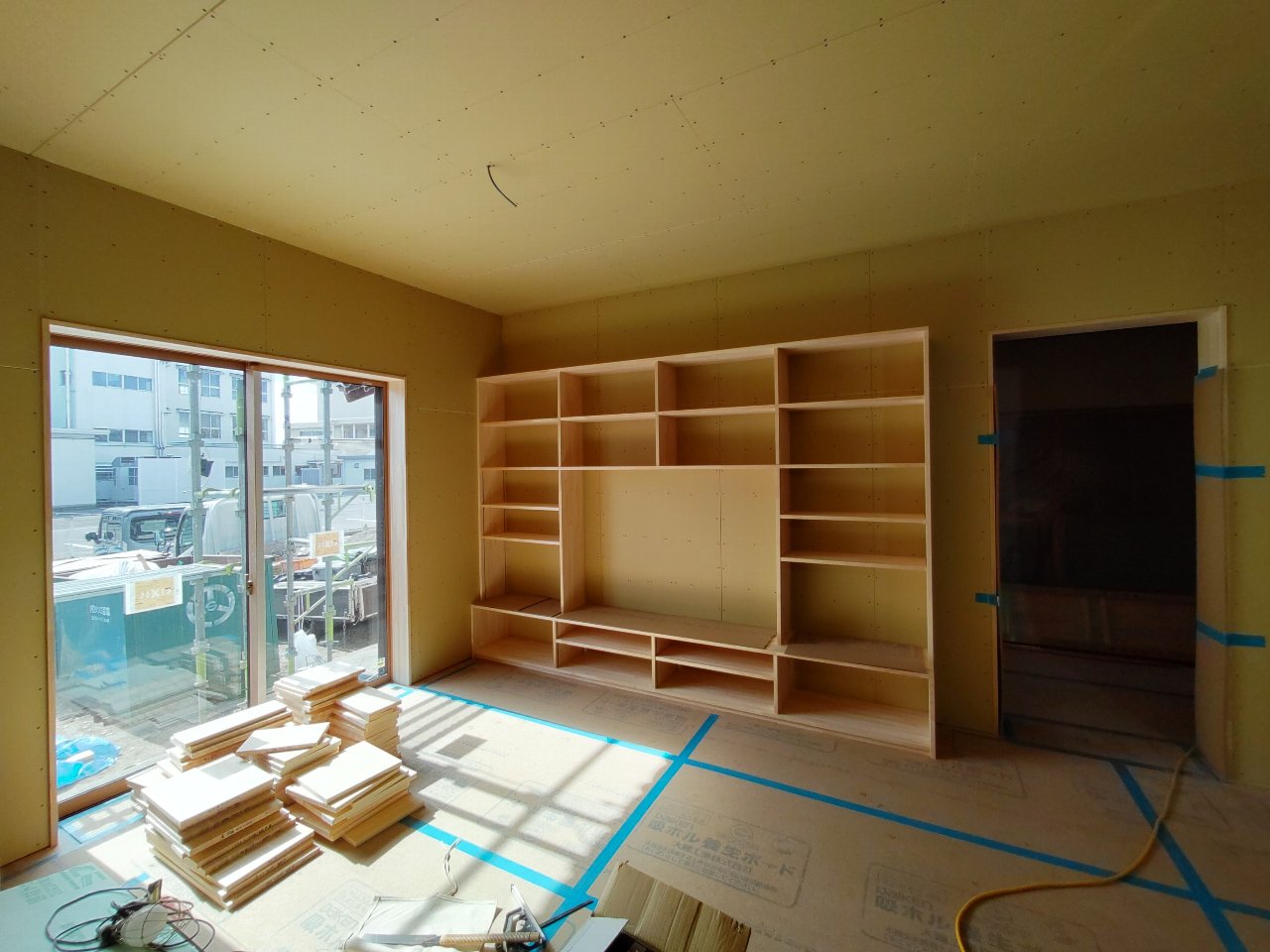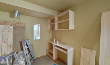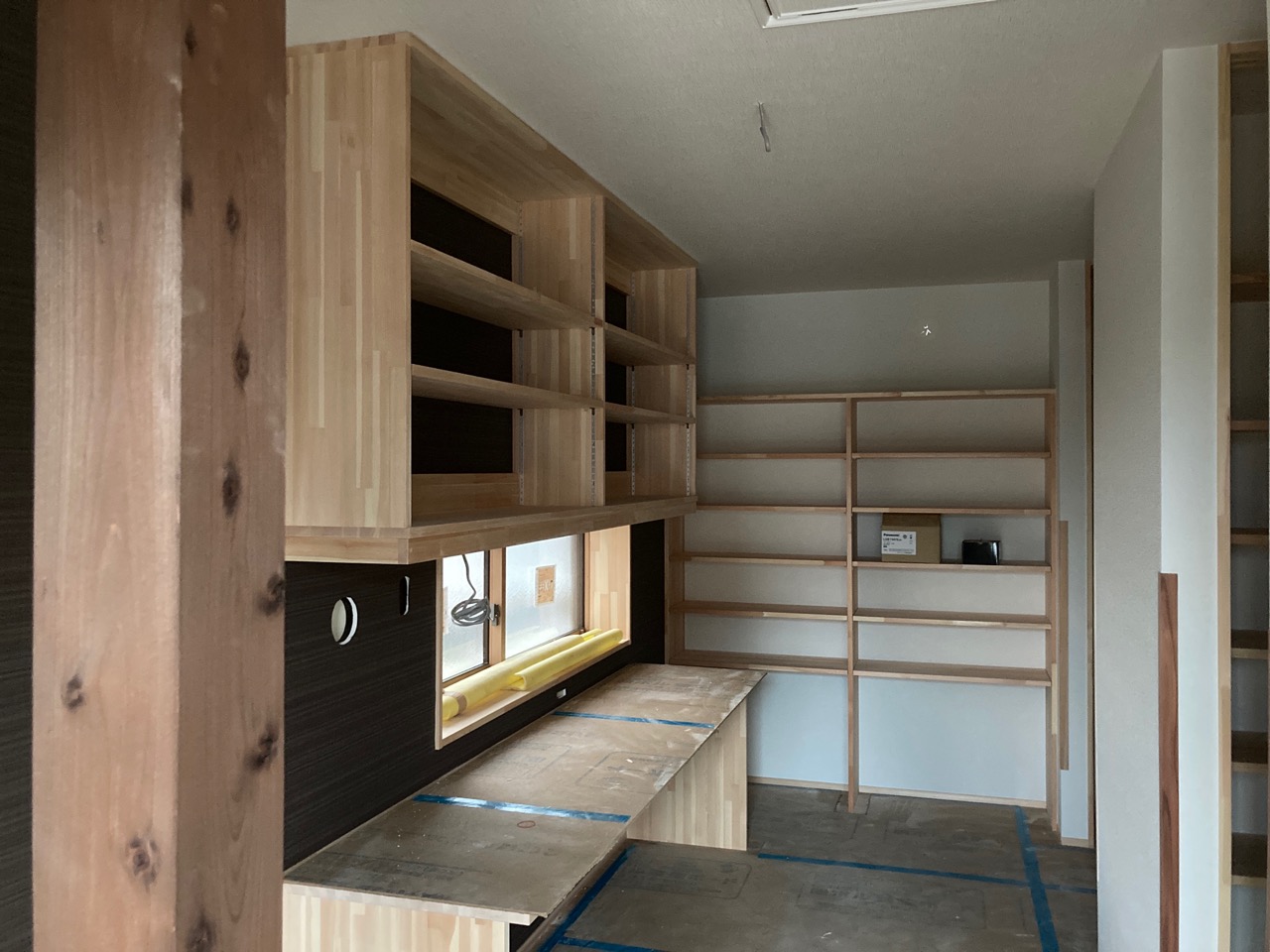 棟梁は各種棚板の組立取付中。だんだんと生活するための内装が整っていきます。