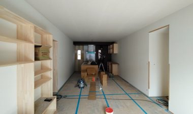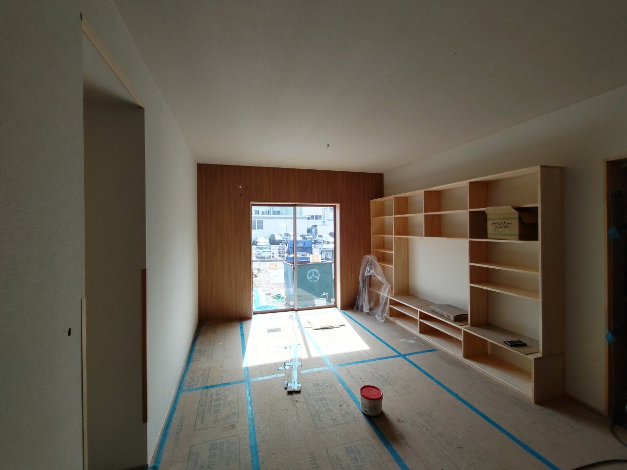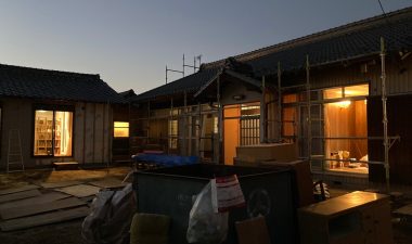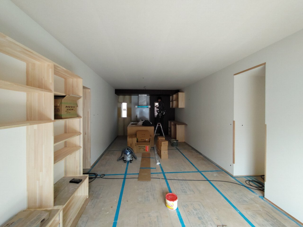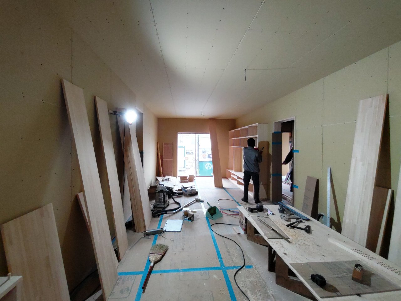 だんだんと日が短くなってきています。夕方に室内で作業を行おうとすると結構な暗さ。投光器を焚きながら細かい作業を行っています。もう少しで照明器具工事なども完了。夜でも明るい室内が待ち遠しい季節になってきました。