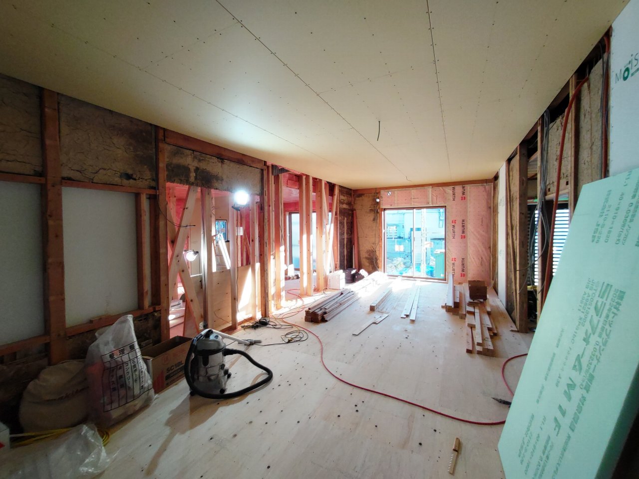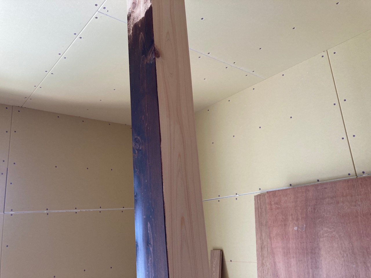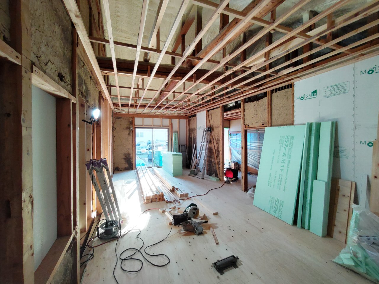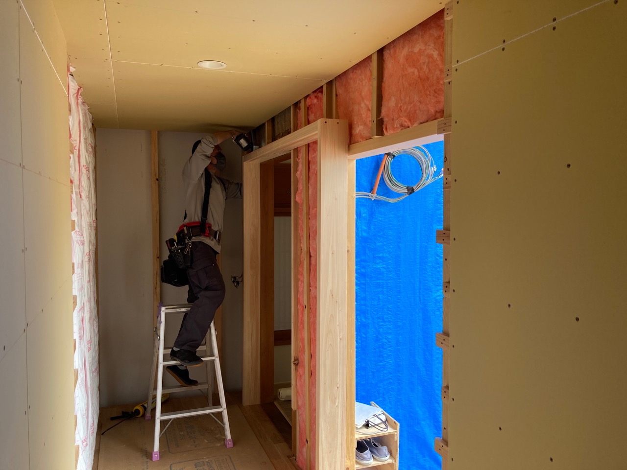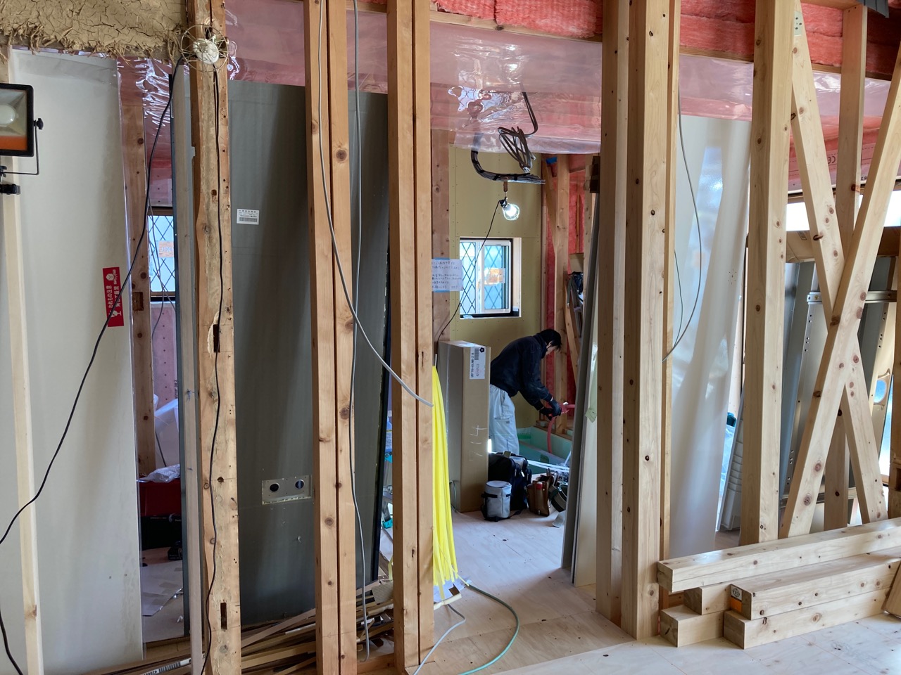 内装下地の上にクロス下地石膏ボードが張られ始めました。この段階まで来ると後の作業は新築工事とだいたい同じとなってきます。やっとこちらの土俵に乗ってきたという感覚です。
