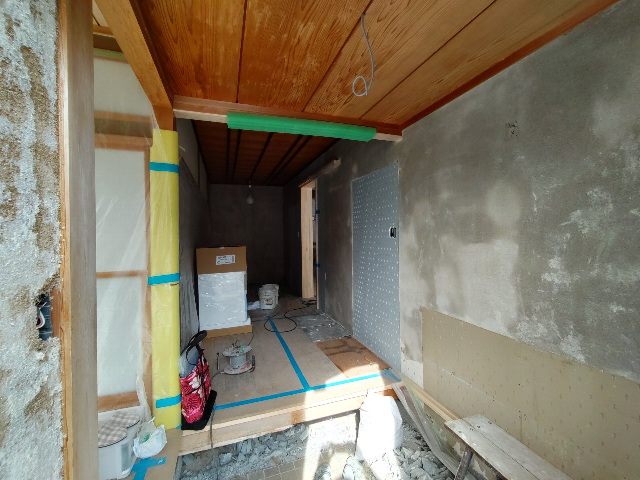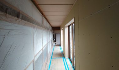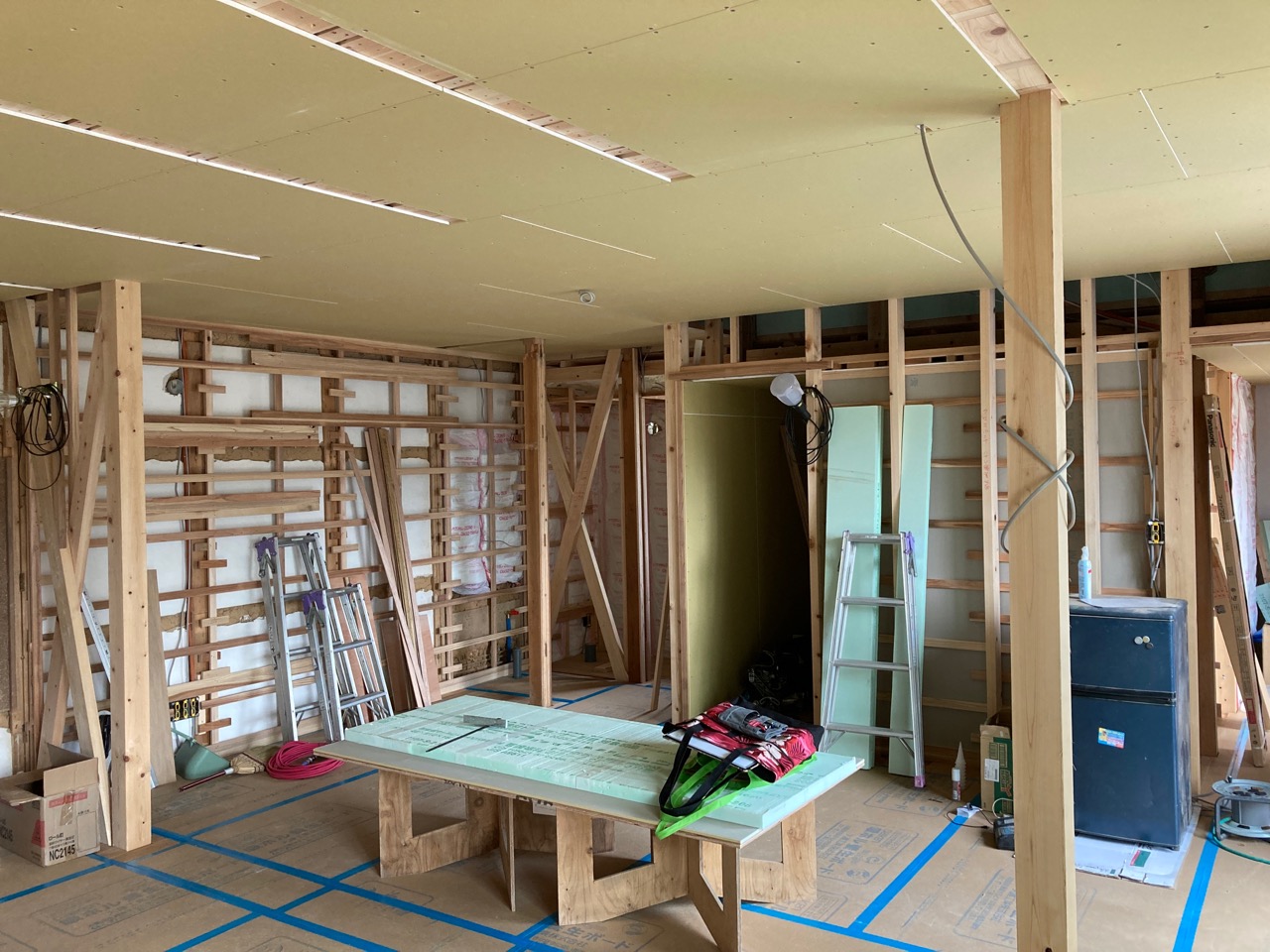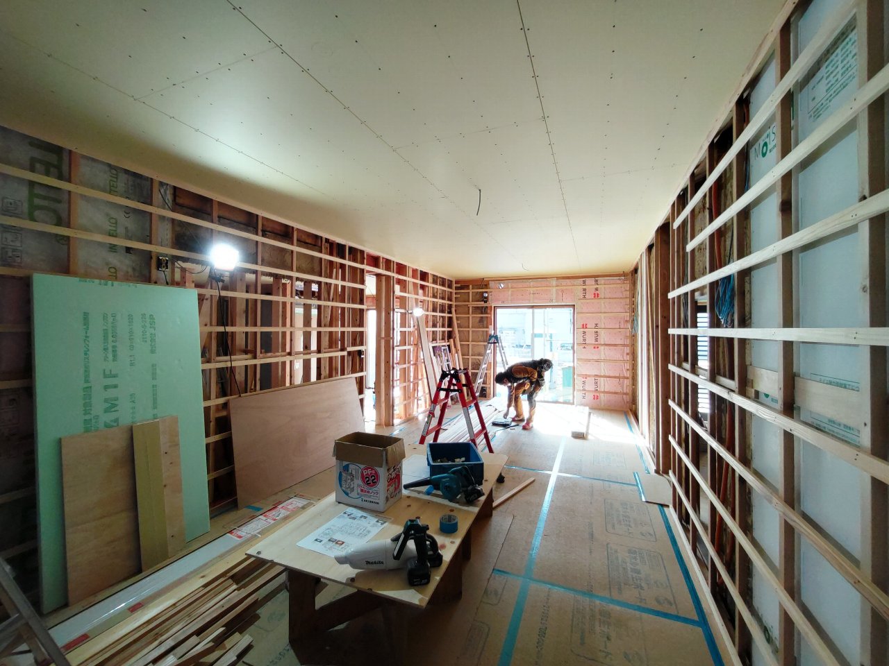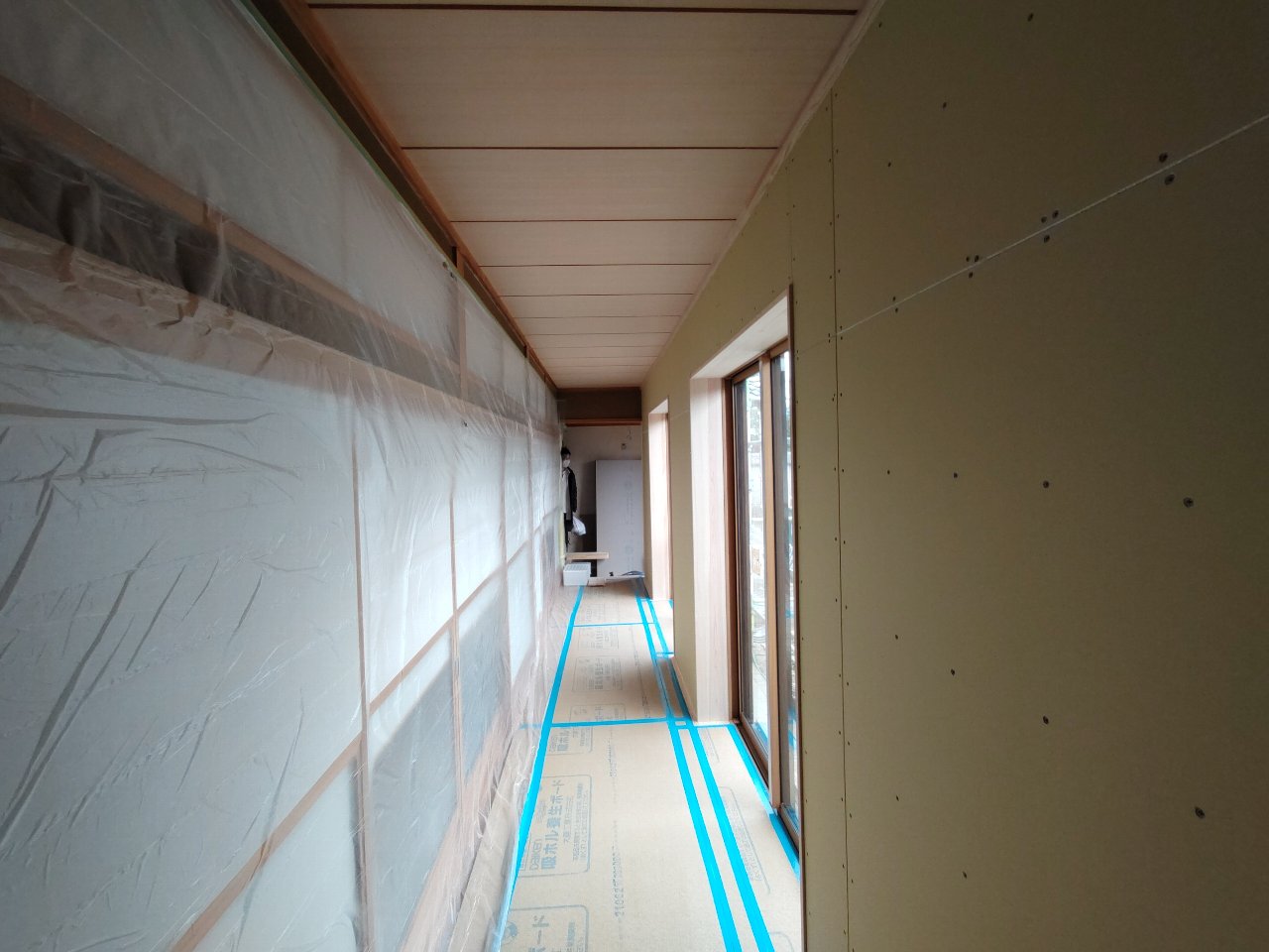内装下地の上にクロス下地石膏ボードが張られ始めました。この段階まで来ると後の作業は新築工事とだいたい同じとなってきます。やっとこちらの土俵に乗ってきたという感覚です。