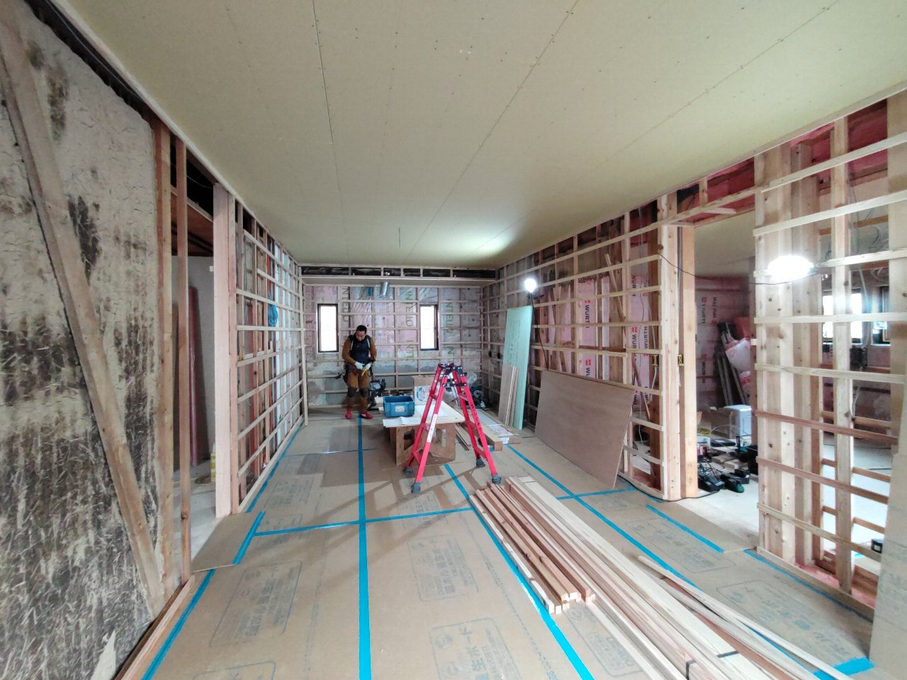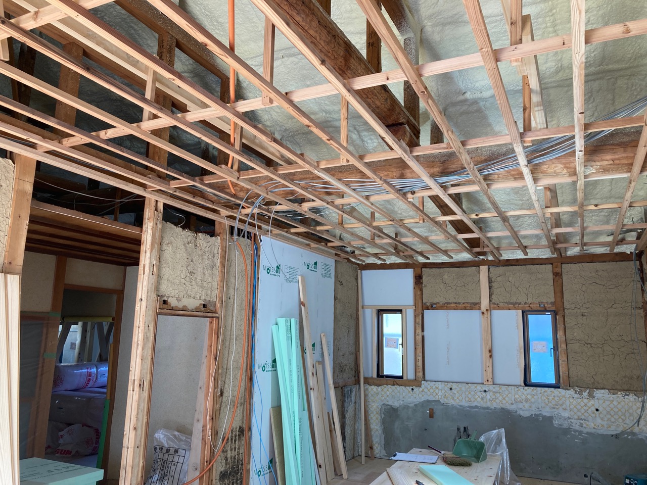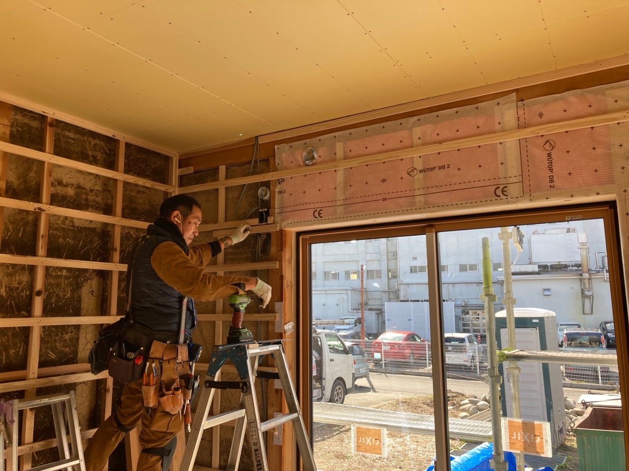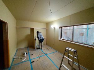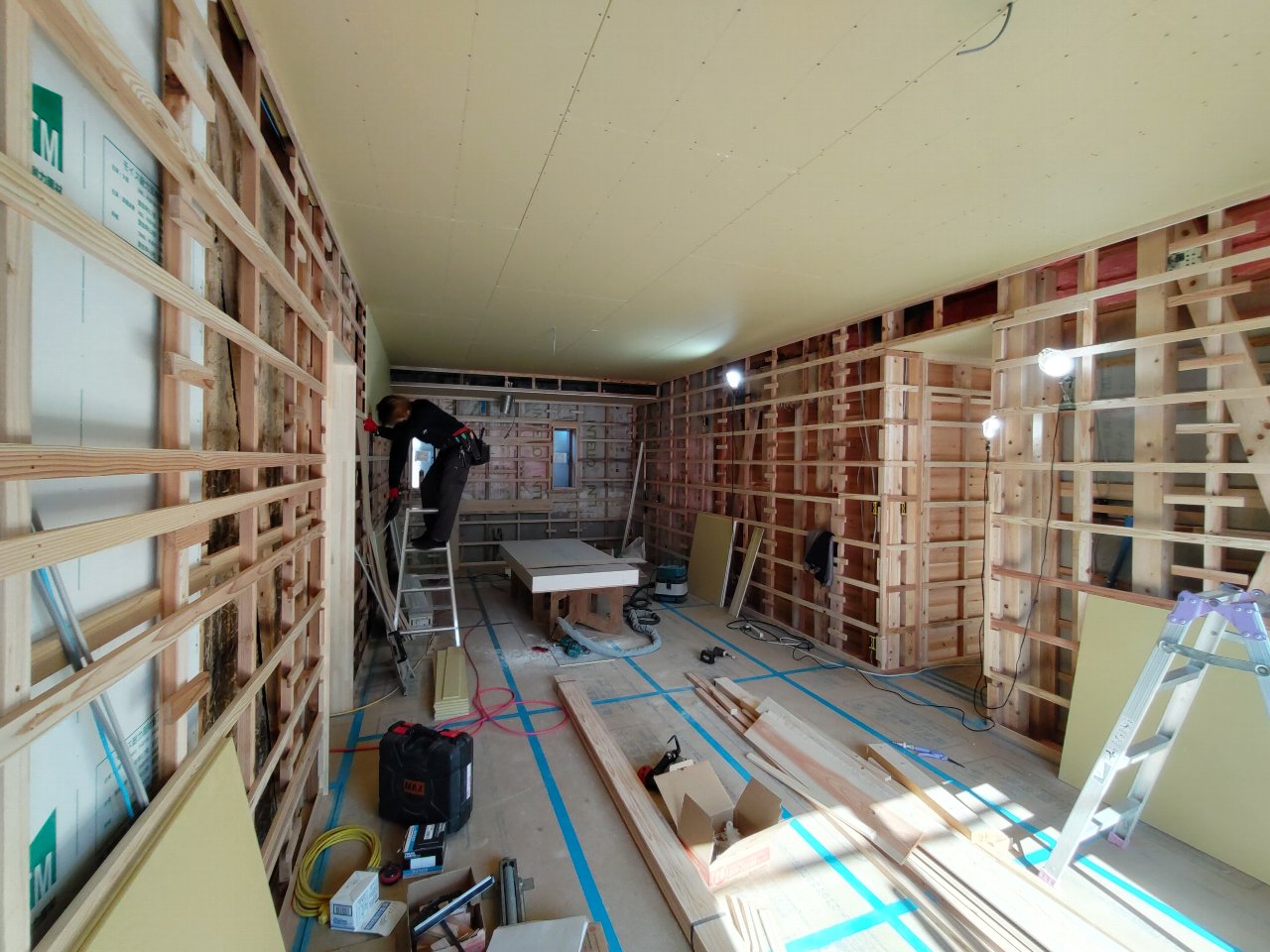 内装下地の上にクロス下地石膏ボードが張られ始めました。この段階まで来ると後の作業は新築工事とだいたい同じとなってきます。やっとこちらの土俵に乗ってきたという感覚です。