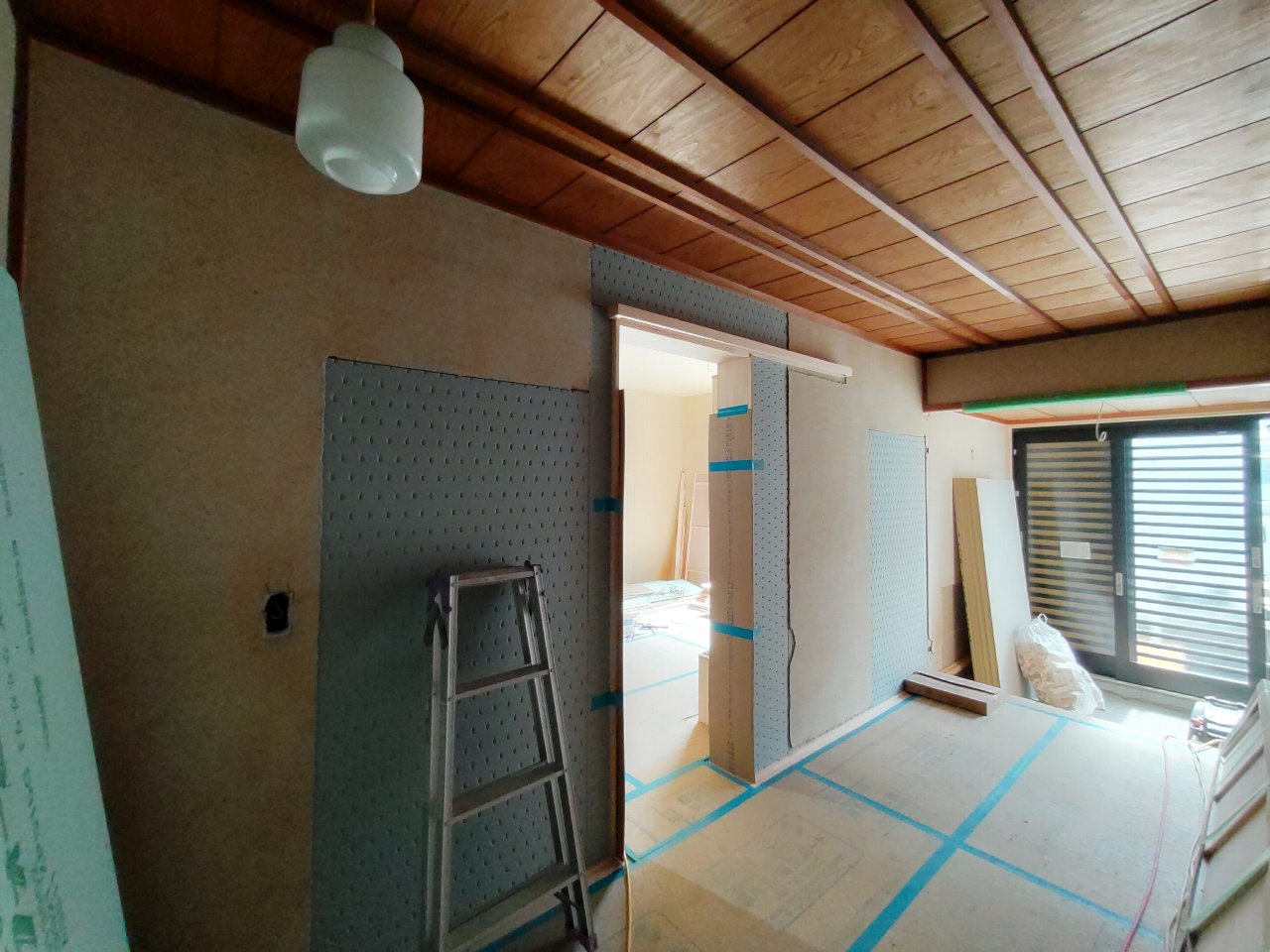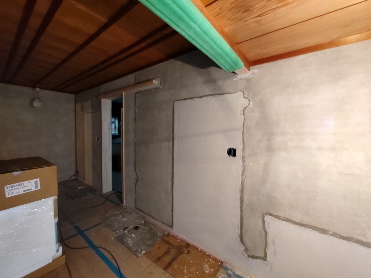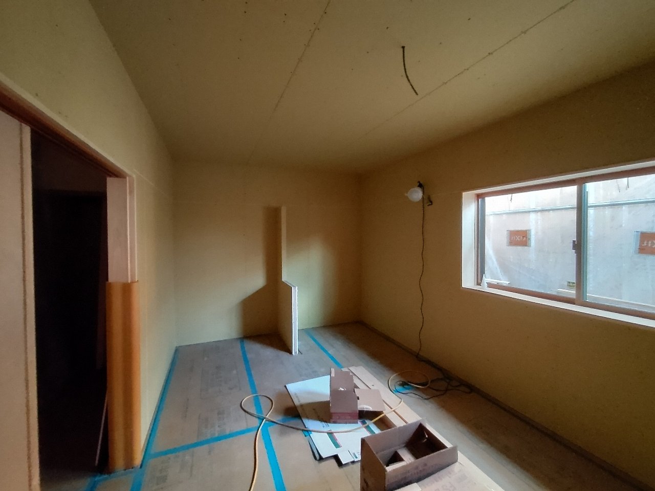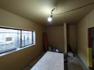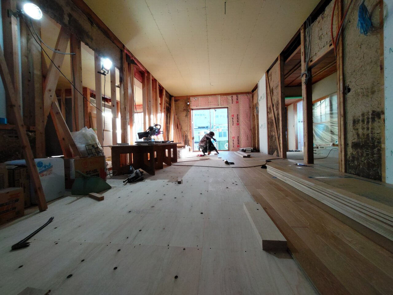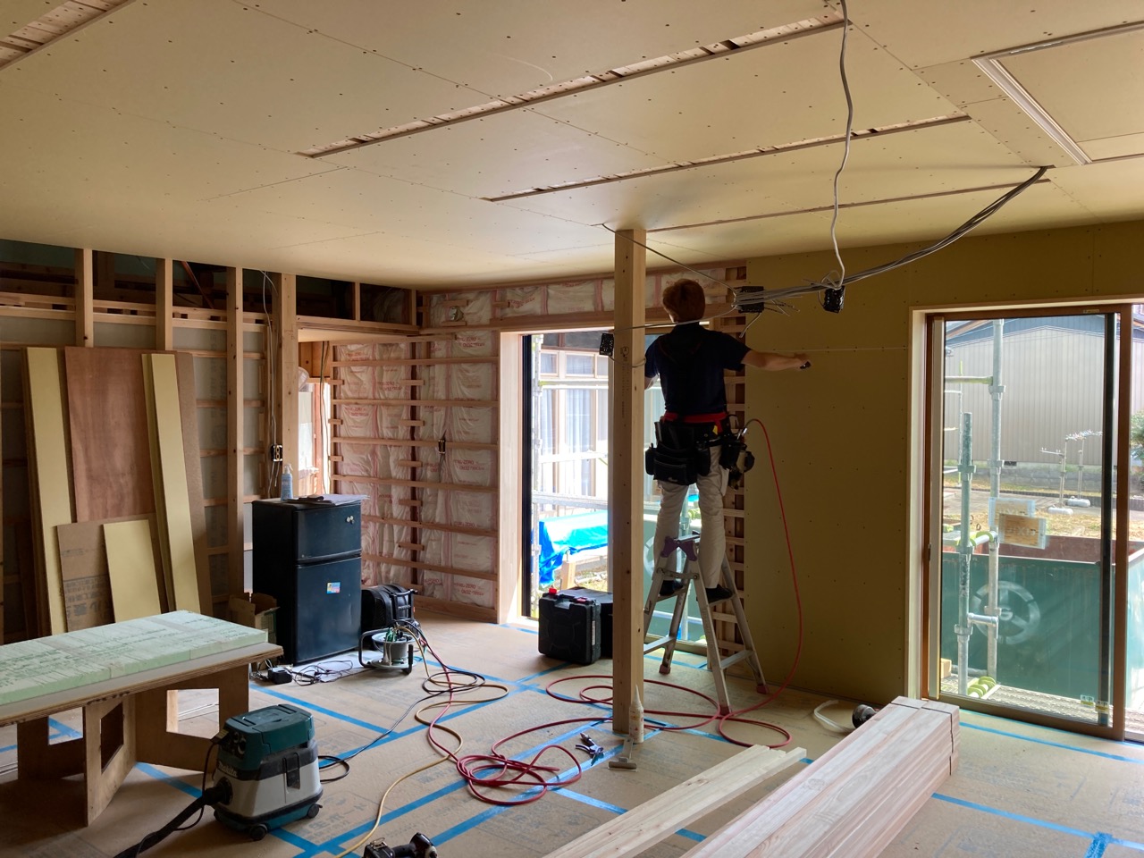 内装下地の上にクロス下地石膏ボードが張られ始めました。この段階まで来ると後の作業は新築工事とだいたい同じとなってきます。やっとこちらの土俵に乗ってきたという感覚です。