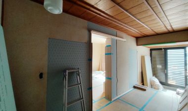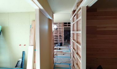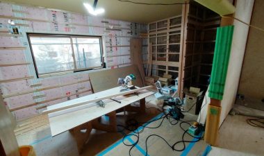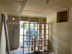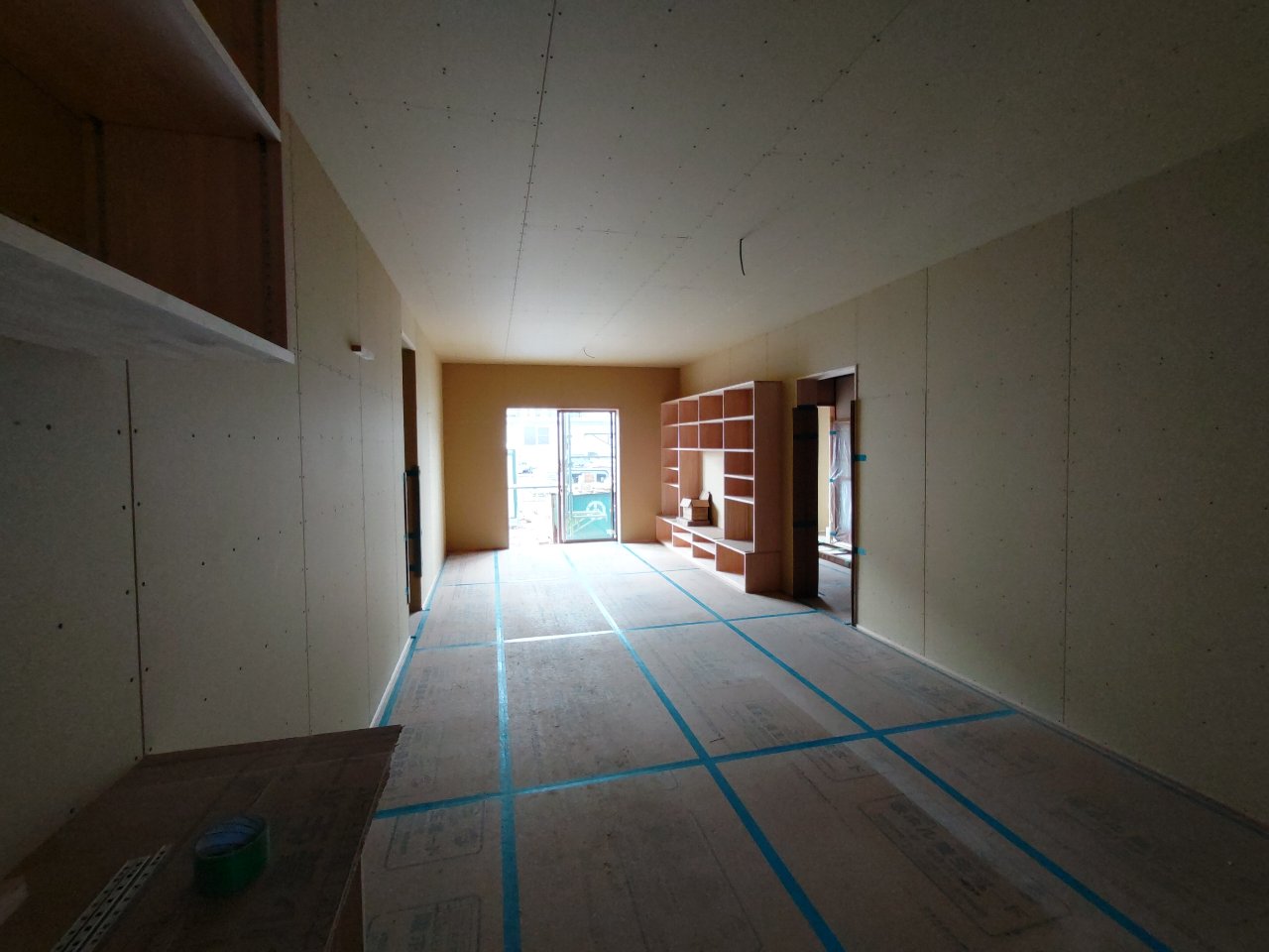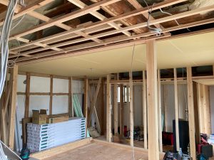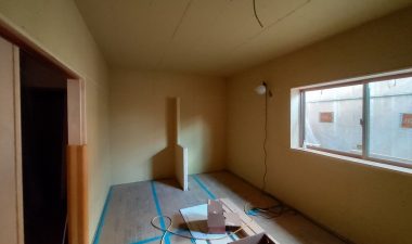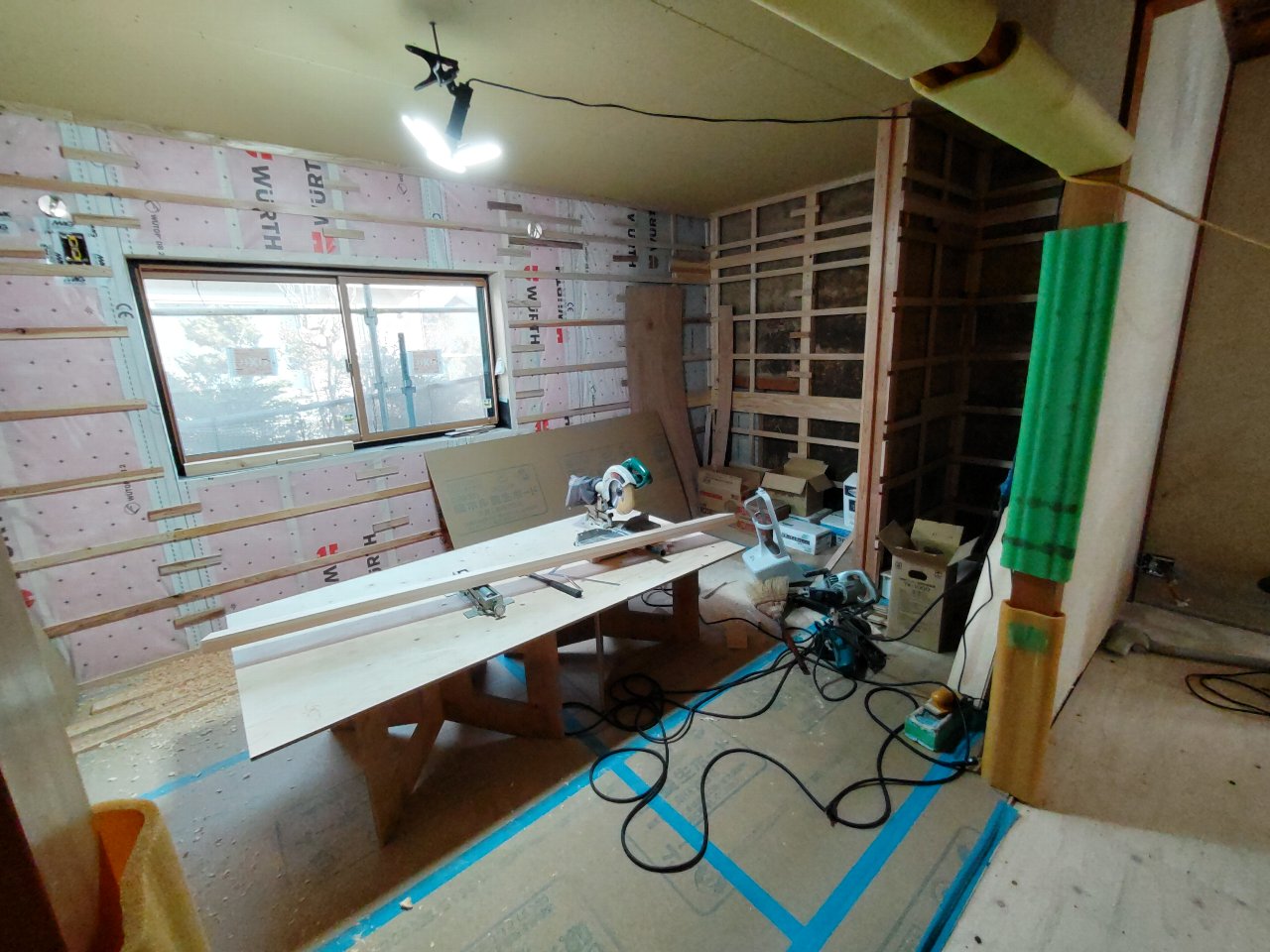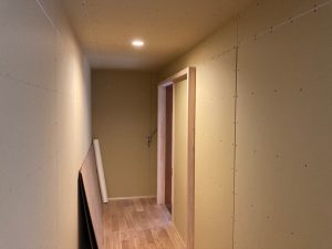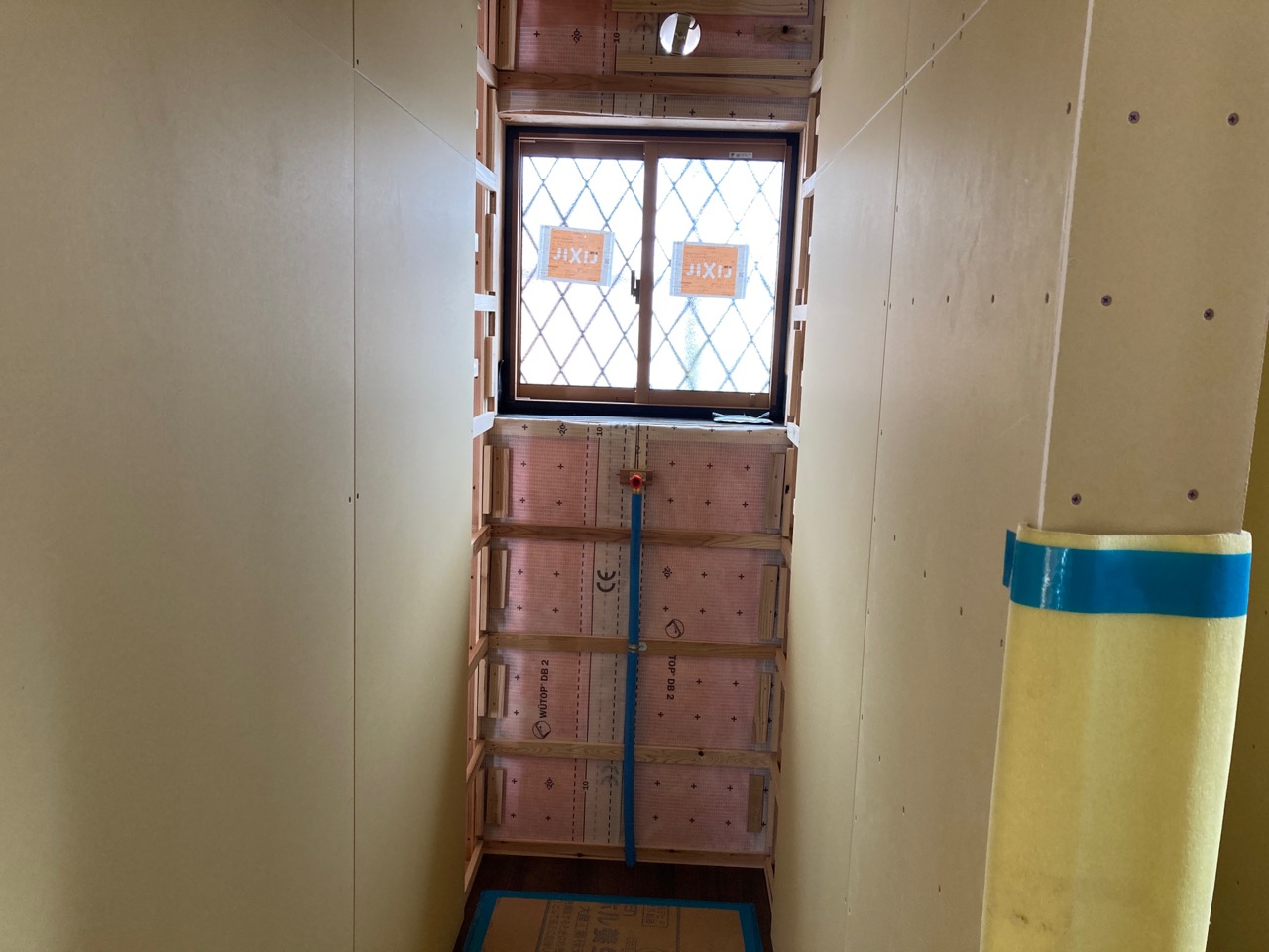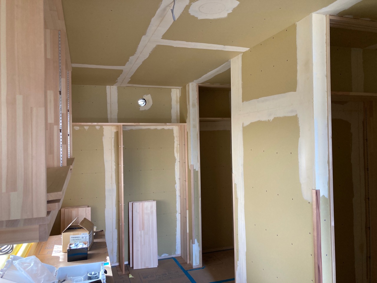 内装下地の上にクロス下地石膏ボードが張られ始めました。この段階まで来ると後の作業は新築工事とだいたい同じとなってきます。やっとこちらの土俵に乗ってきたという感覚です。