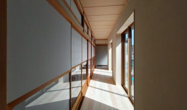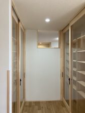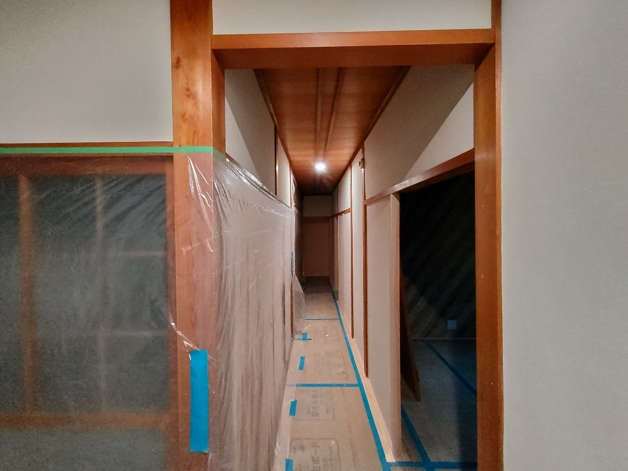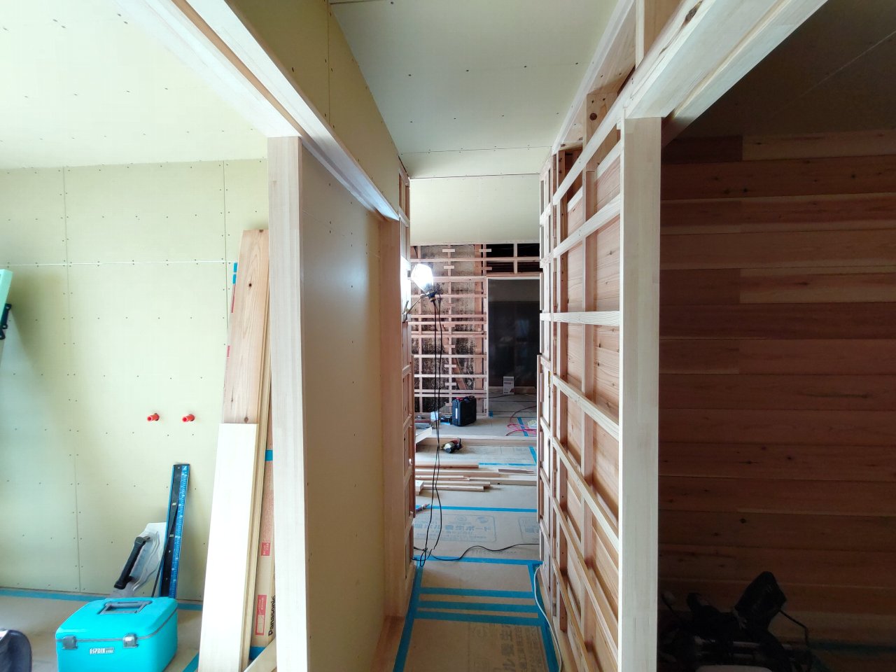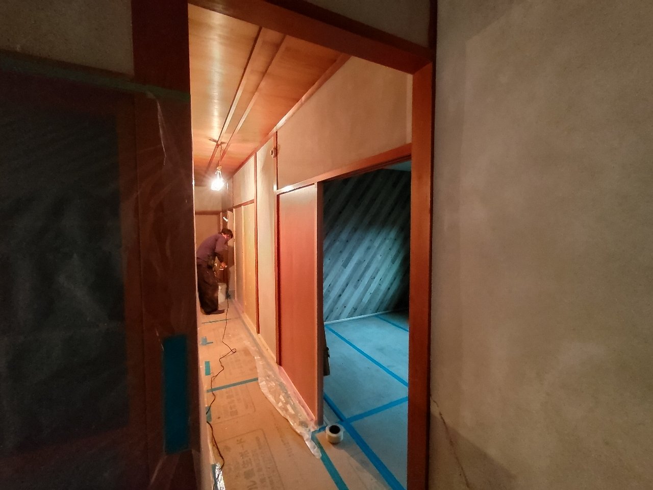 そしてついに広縁の奥から離れの部屋へとつながる開かずの扉が開きました。(構造用合板で留めていた間仕切です)主屋の仕事にi様がお仕事で不在でも入れるように、離れへは入れないようにと封印していましたが、主屋の内装工事が終了しましたので、いよいよ最後に渡り廊下の内装工事に入ります。思えばここまで長かった。
