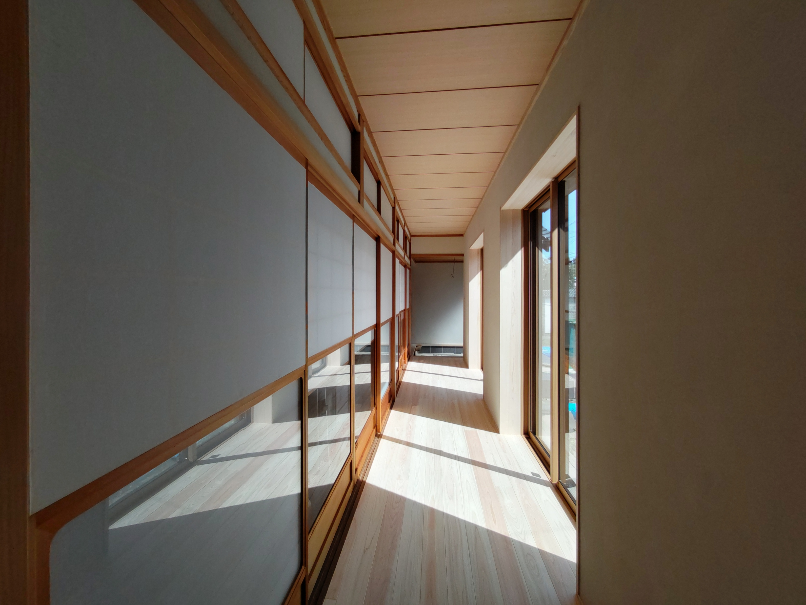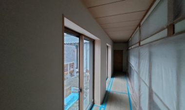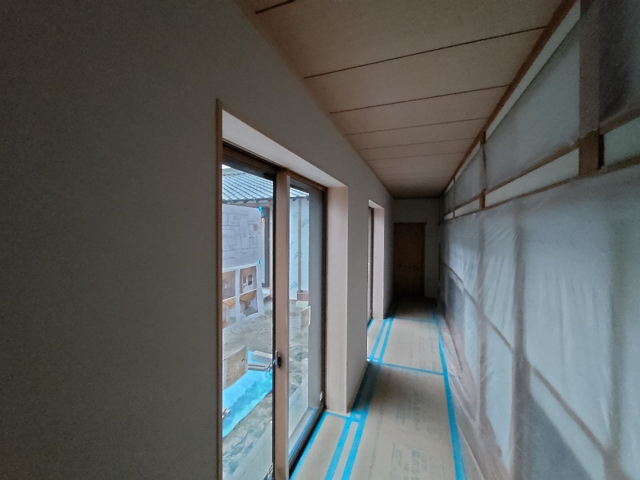 離れ部分と主屋は渡り廊下でつながっています。この離れが完成し、実際に生活できるようになってから主屋の工事に移りますが、仕上工事は途中で止めておく必要があります、どのあたりで境界を引くかが難しいところです。