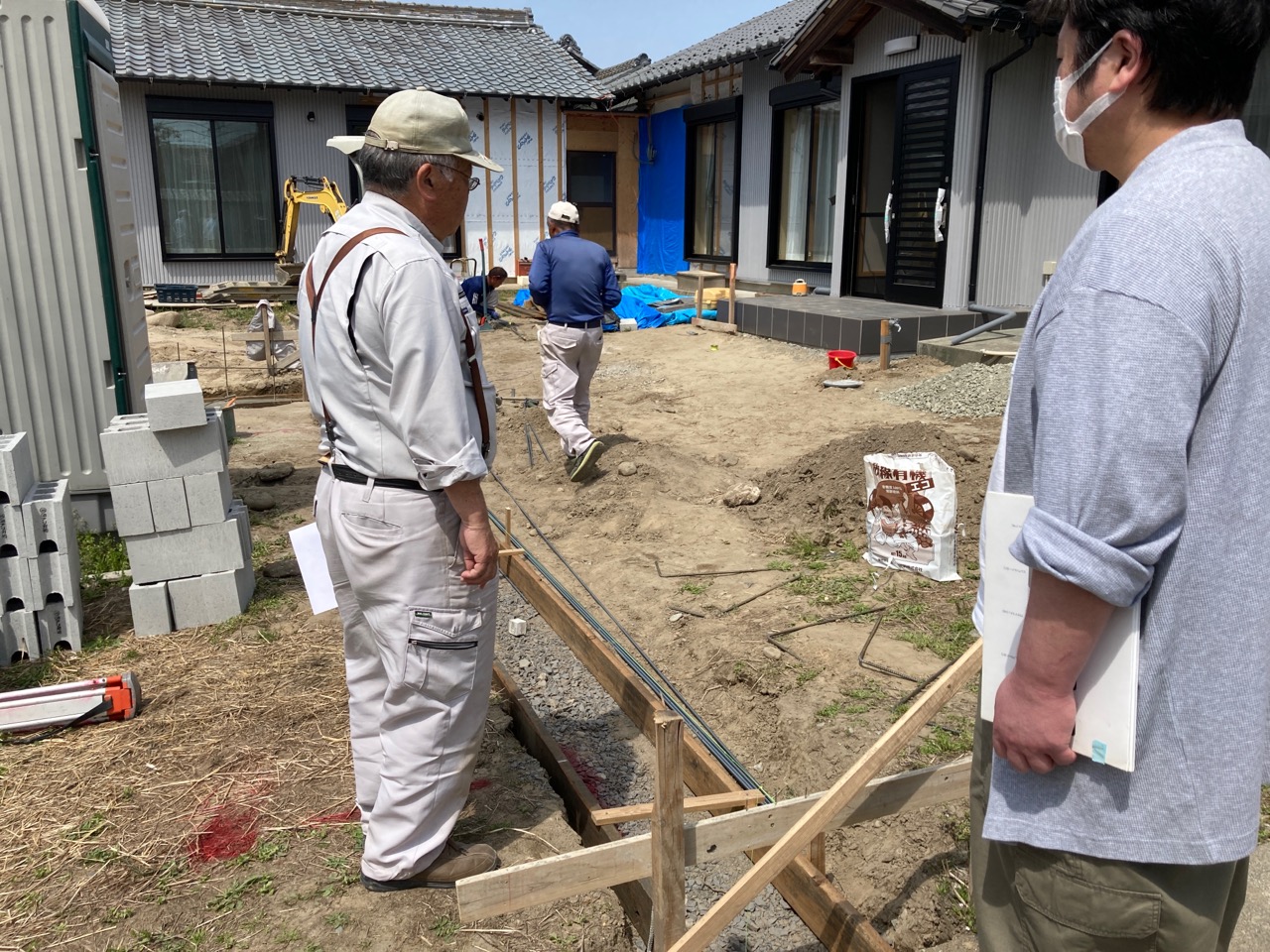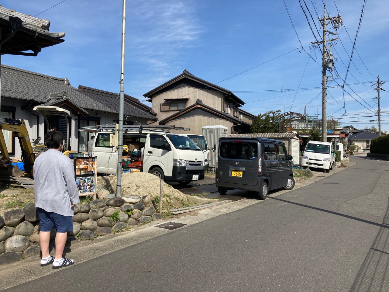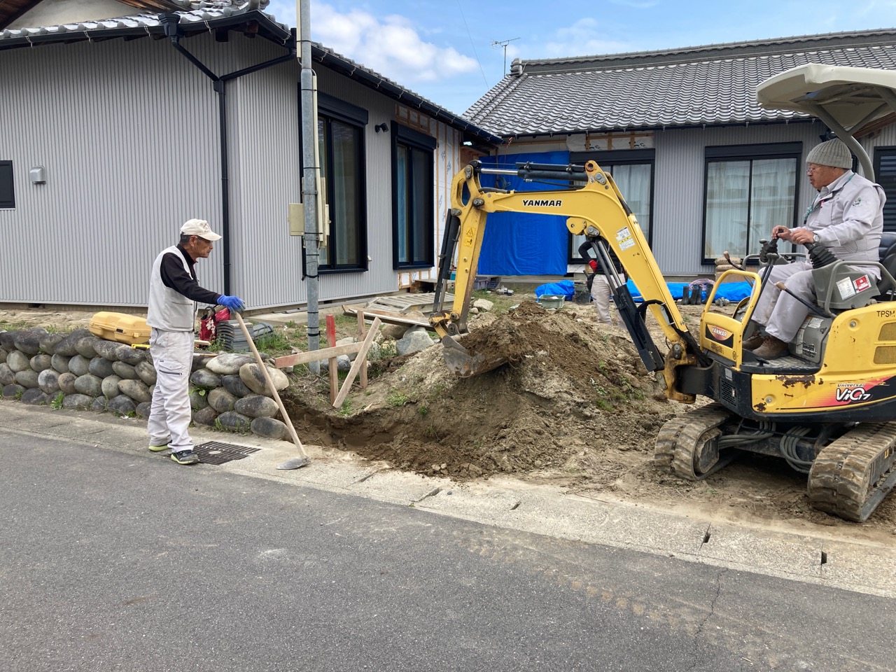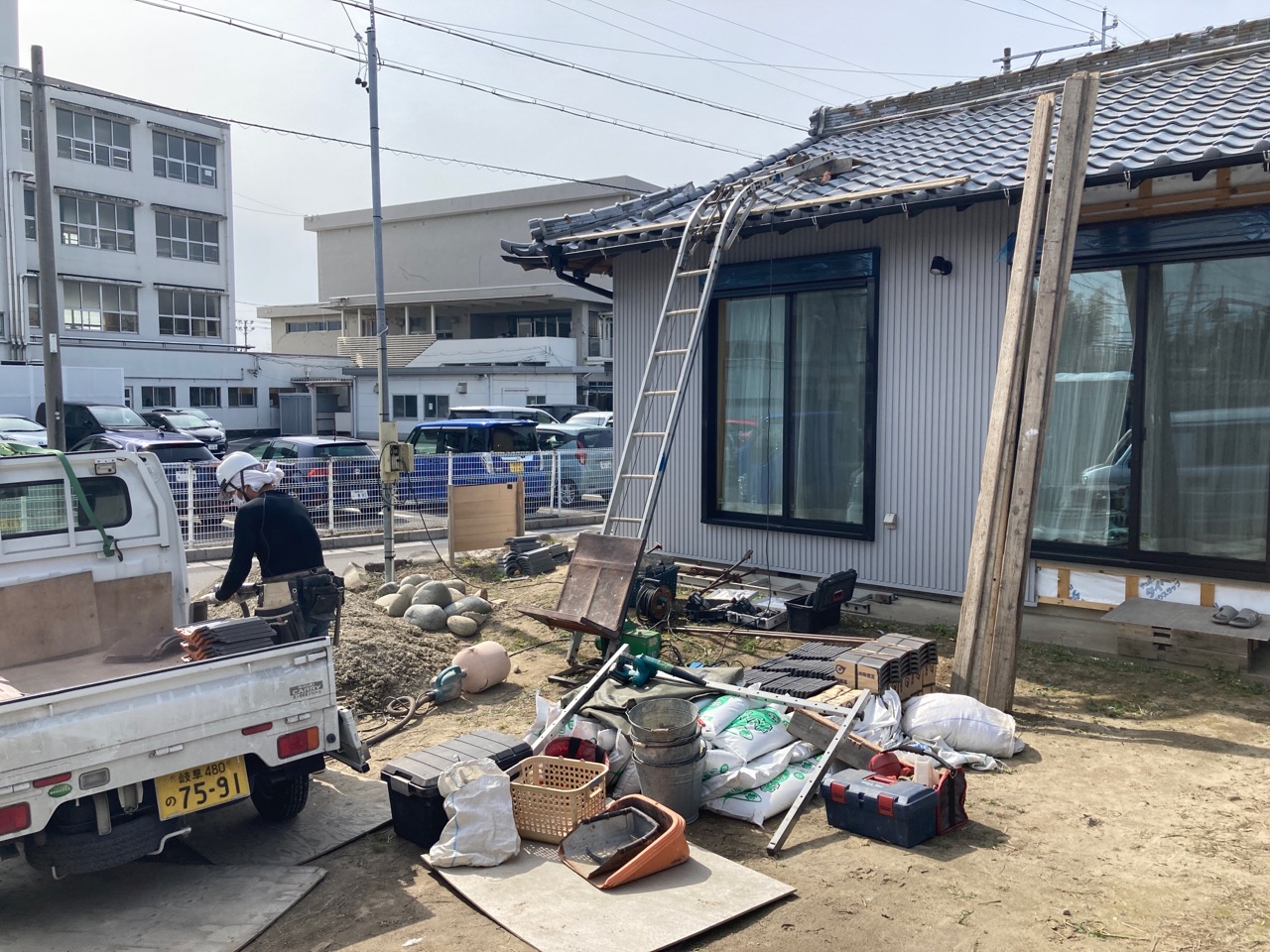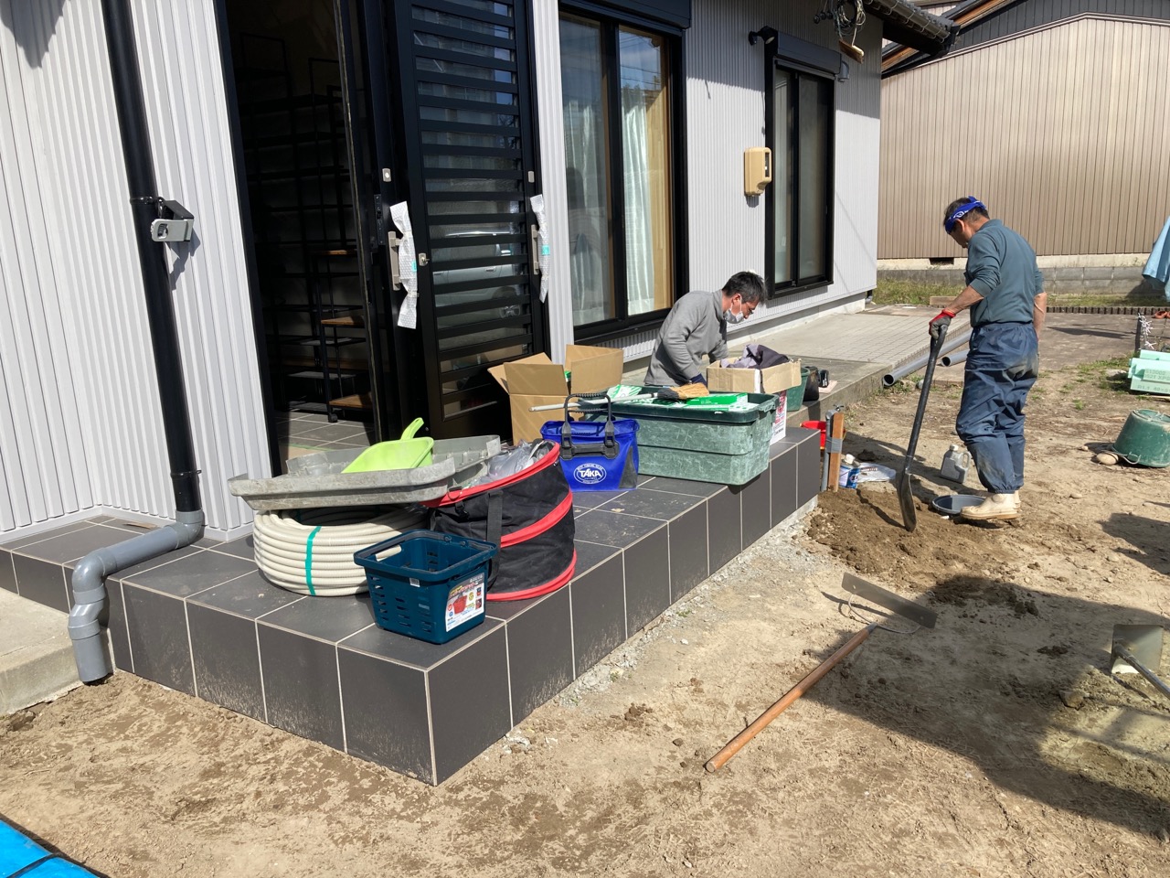 外構業者さんの姿が見えないと思ったら裏庭で作業中でした。主屋と離れが鍵の字状につながるためその背後の土地は余ってしまっています。この地域は豪雨になると土の浸透が少なく、プール上になってしまうとの事。また、木曽川流域の中州上の土地にあって水道(みずみち)ができるためか、ところどころ鬆(す)になってしまうようです。敷地排水の状態を改善したい、というのがそもそもの一連のリフォーム計画の始まりでした。