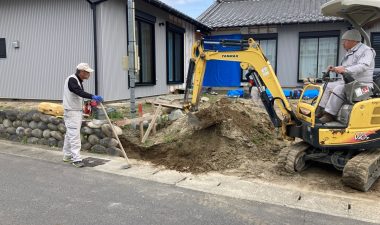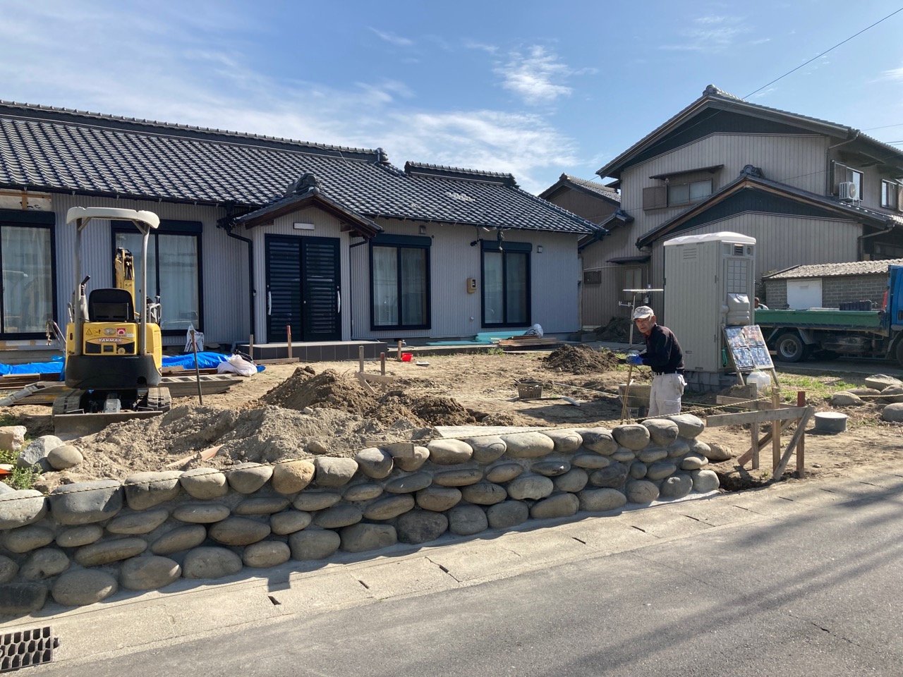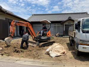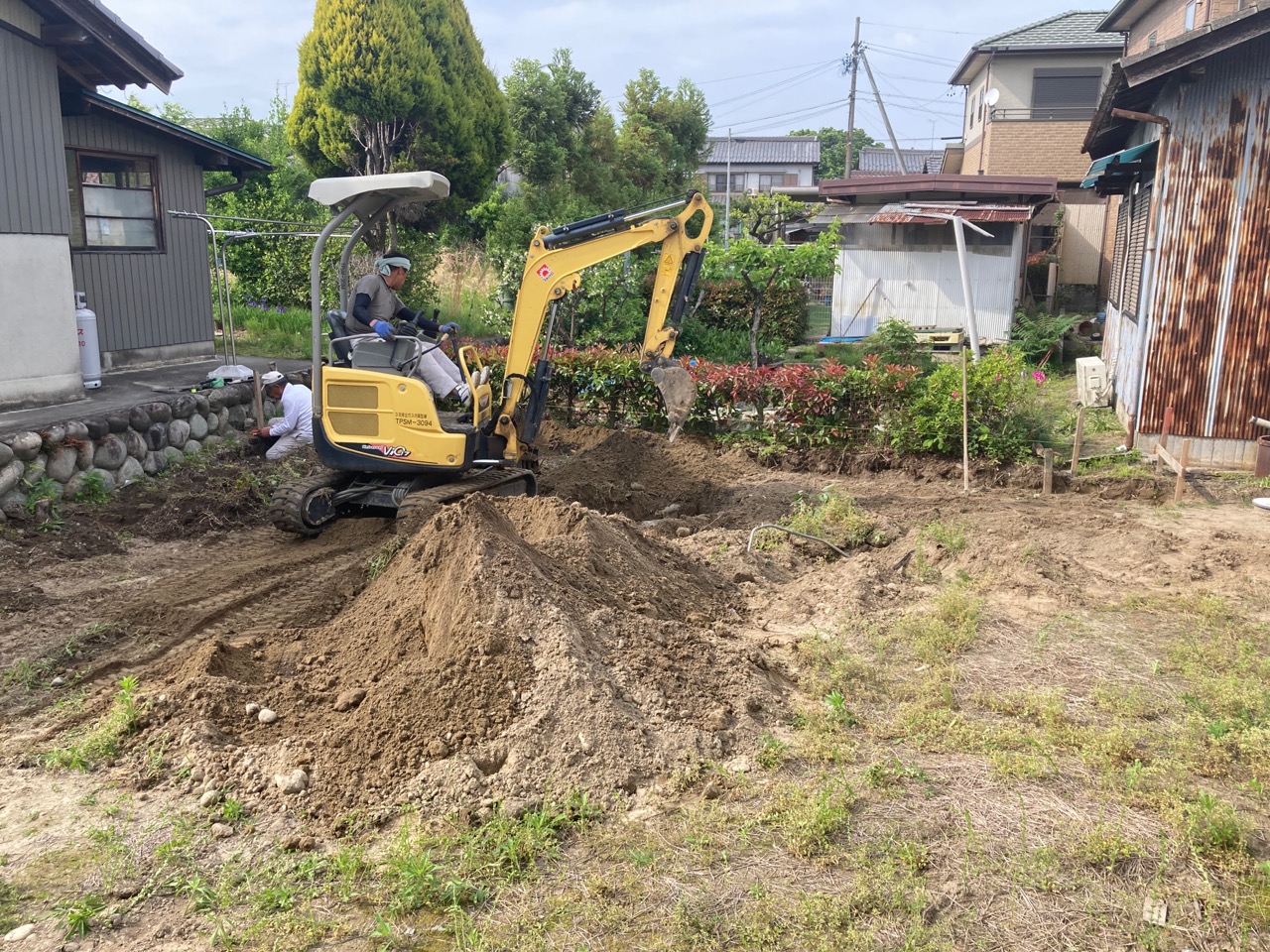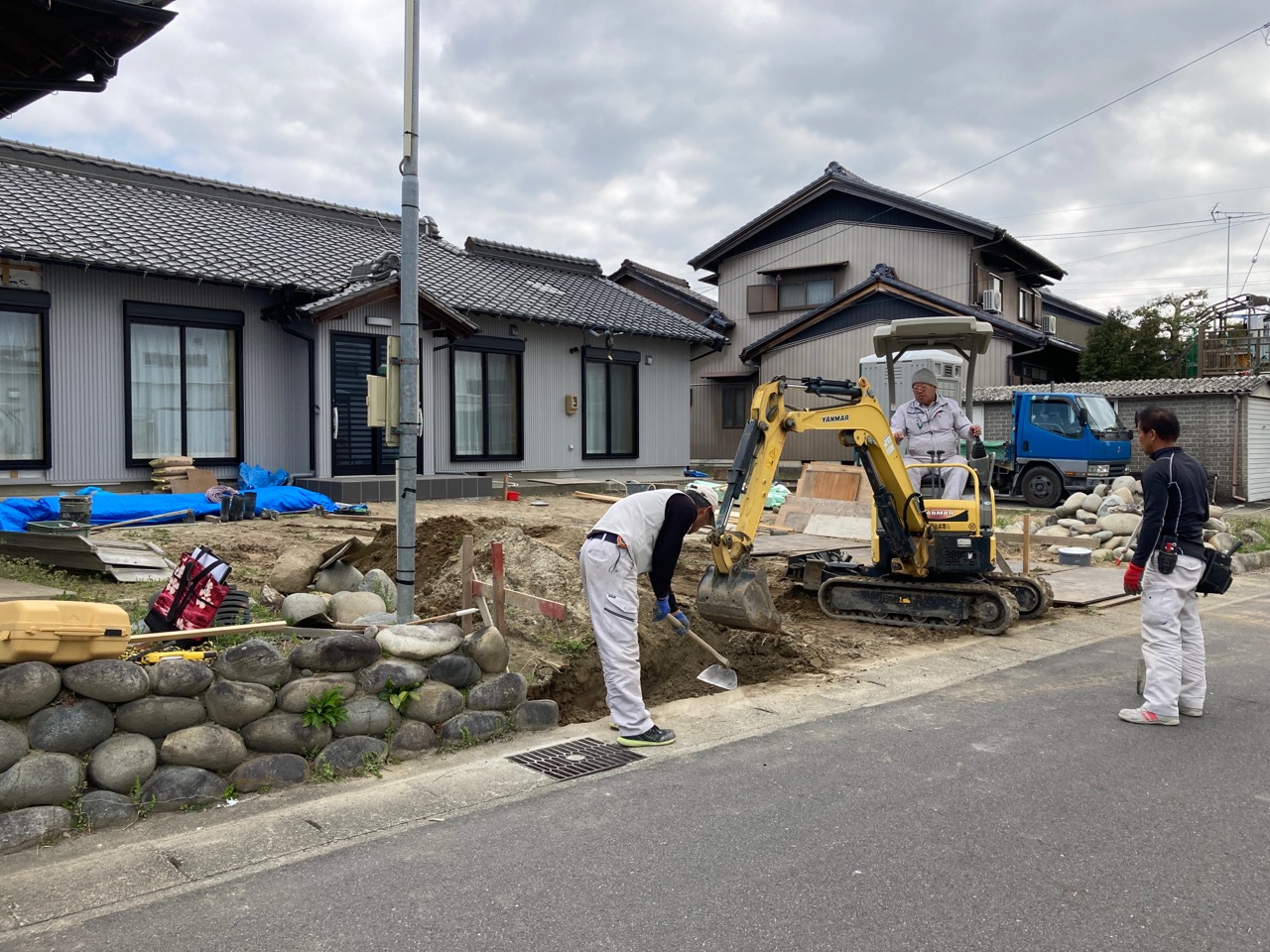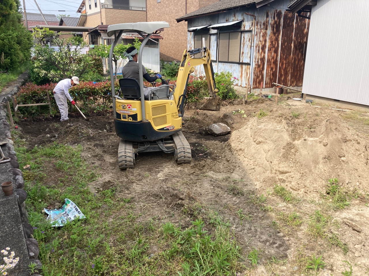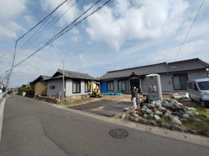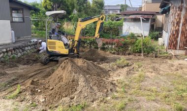 外構業者さんの姿が見えないと思ったら裏庭で作業中でした。主屋と離れが鍵の字状につながるためその背後の土地は余ってしまっています。この地域は豪雨になると土の浸透が少なく、プール上になってしまうとの事。また、木曽川流域の中州上の土地にあって水道(みずみち)ができるためか、ところどころ鬆(す)になってしまうようです。敷地排水の状態を改善したい、というのがそもそもの一連のリフォーム計画の始まりでした。