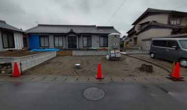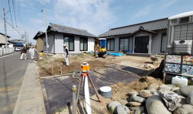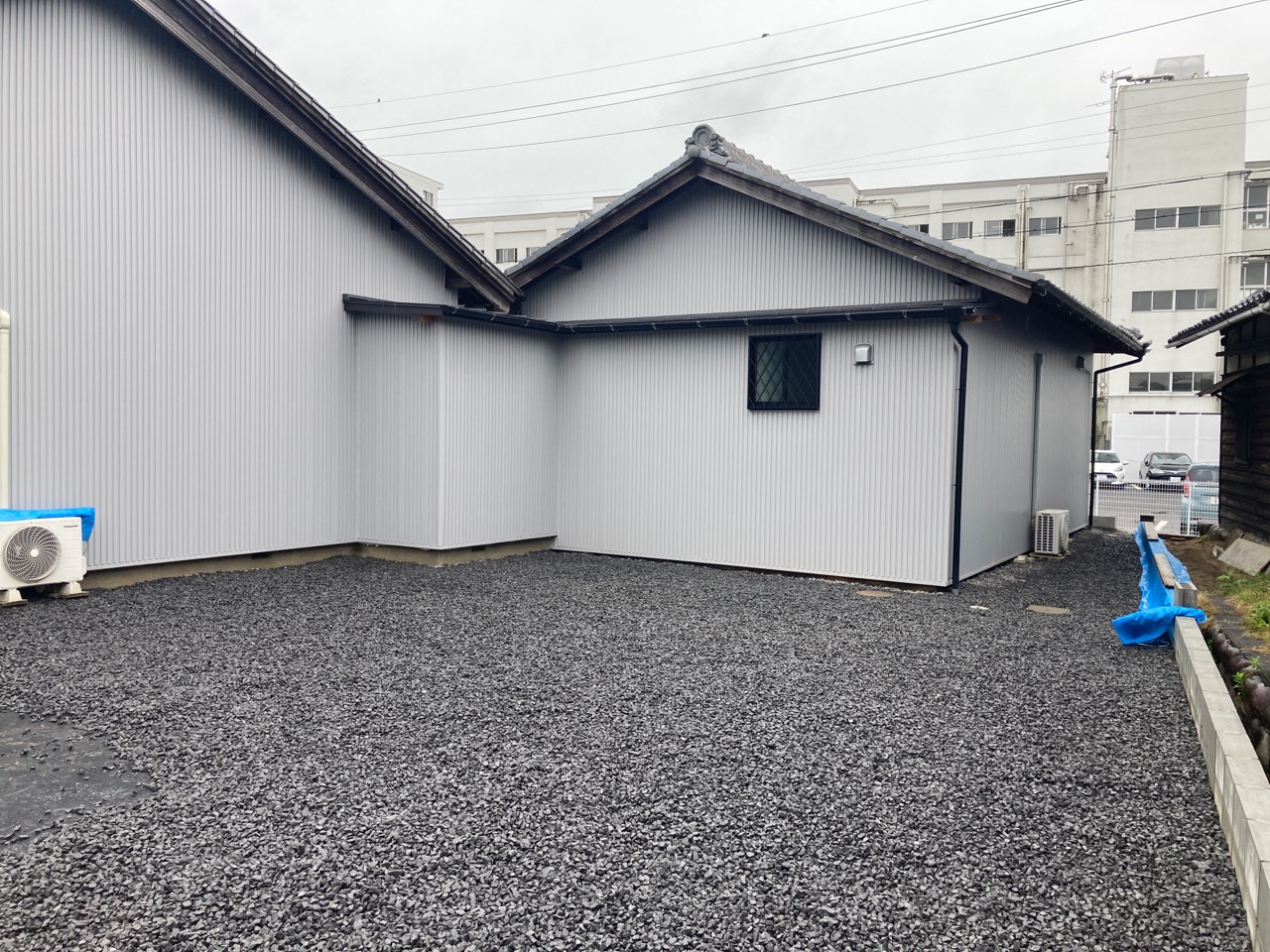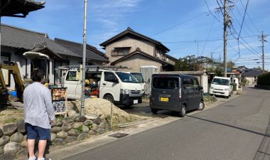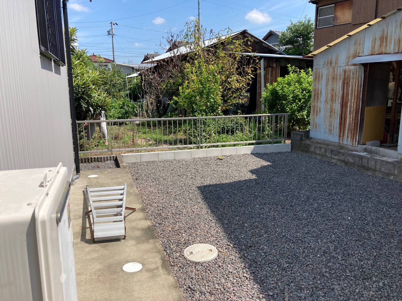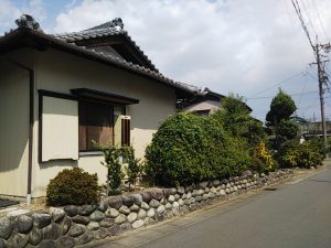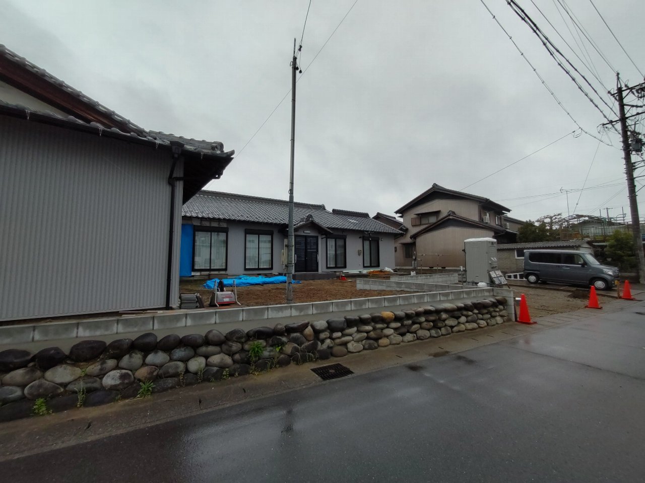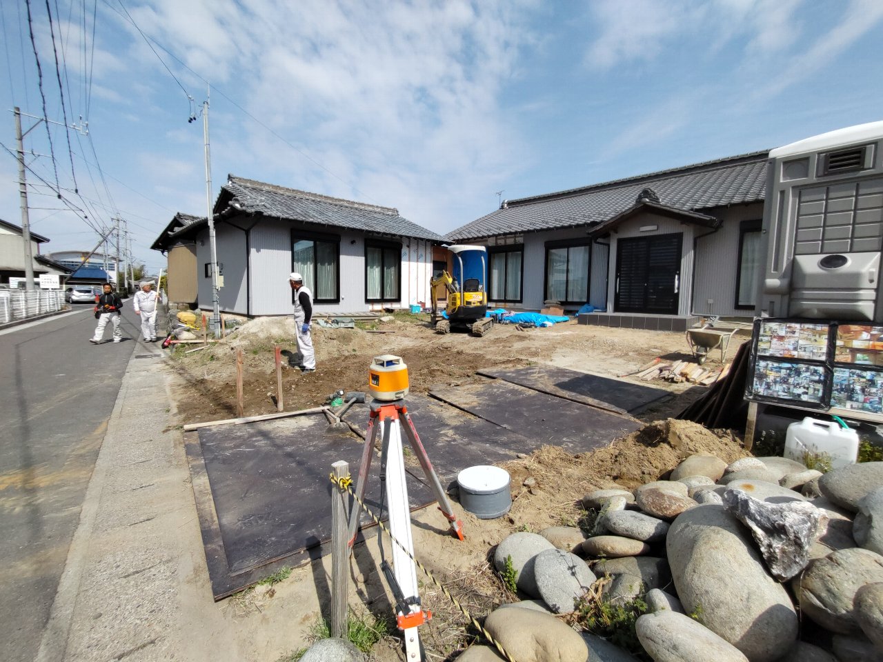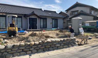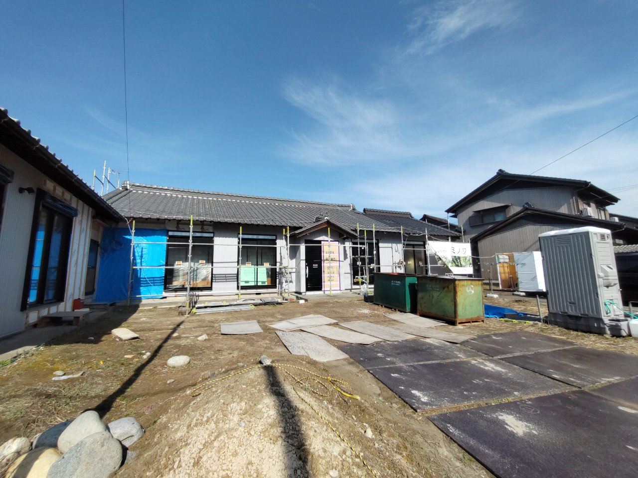 外構業者さんの姿が見えないと思ったら裏庭で作業中でした。主屋と離れが鍵の字状につながるためその背後の土地は余ってしまっています。この地域は豪雨になると土の浸透が少なく、プール上になってしまうとの事。また、木曽川流域の中州上の土地にあって水道(みずみち)ができるためか、ところどころ鬆(す)になってしまうようです。敷地排水の状態を改善したい、というのがそもそもの一連のリフォーム計画の始まりでした。