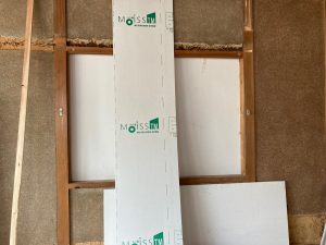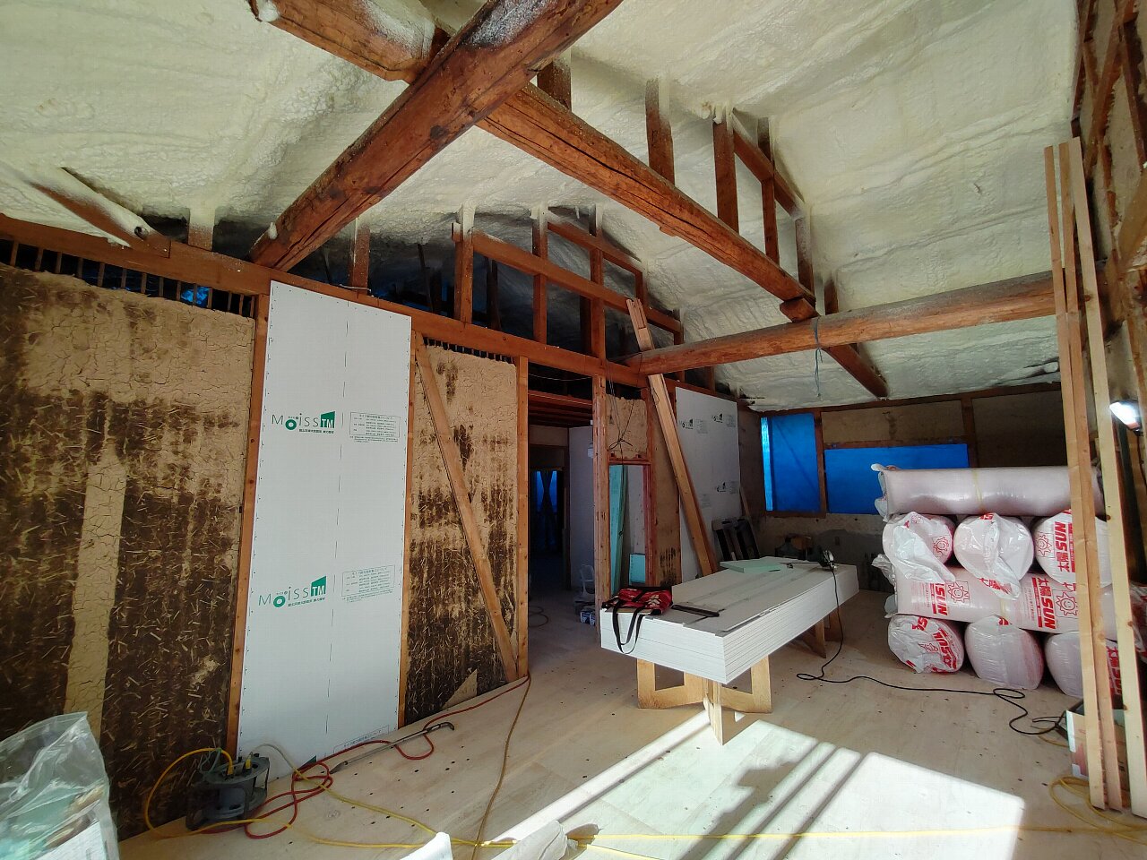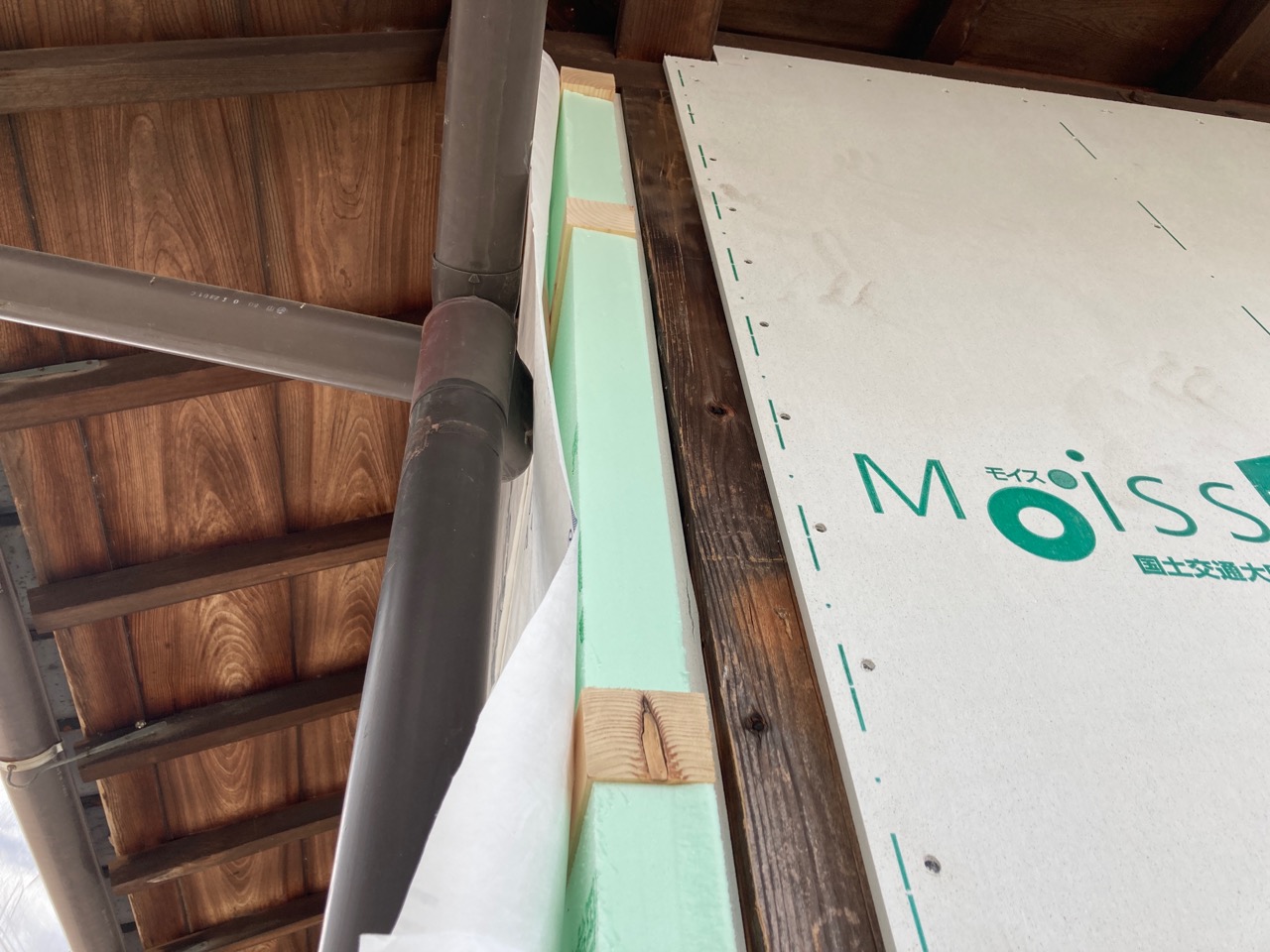 渡り廊下と言えども内外断熱を施しています。内部はグラスウールとし、付加断熱にポリスチレンフォームを敷設していきます。旧い住宅ですので、柱間に土壁がありグラスウール充填できない壁はポリスチレンフォームだけとなりますが、新たに壁を直したりした部分にはグラスウールも補強として充填しておきます。