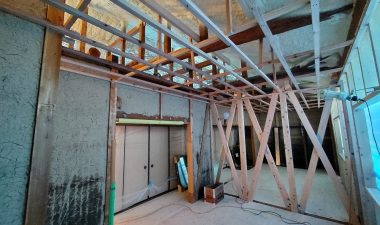 現場に戻ると棟梁が筋違と金物を留め付けているところ。自由に梁の架け方を設計できる新築工事と違い、既存の柱、梁、土台、基礎、希望の間取りを考慮して耐力壁の位置を決定しなければいけません。工事を進めていくと思いもよらない変更を余儀なくされることが多々あります。その際に迅速な判断が下せるかどうかがリフォーム工事における経験が問われるところです。