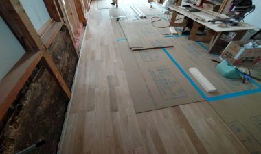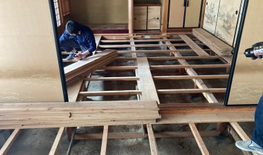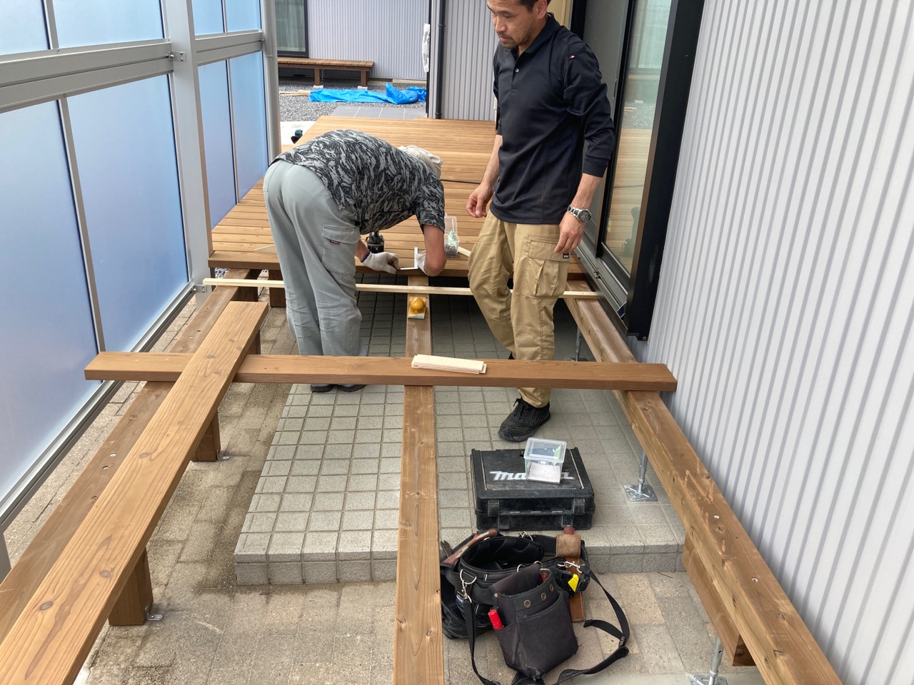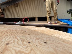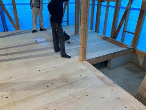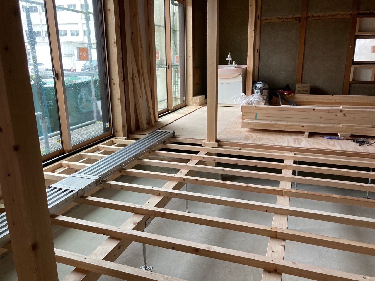 昨日の大引据え付けに引き続き床板の留め付け工事です。前日に長さは切り揃えておいたので今日はただひたすら張っていくのみです。