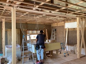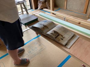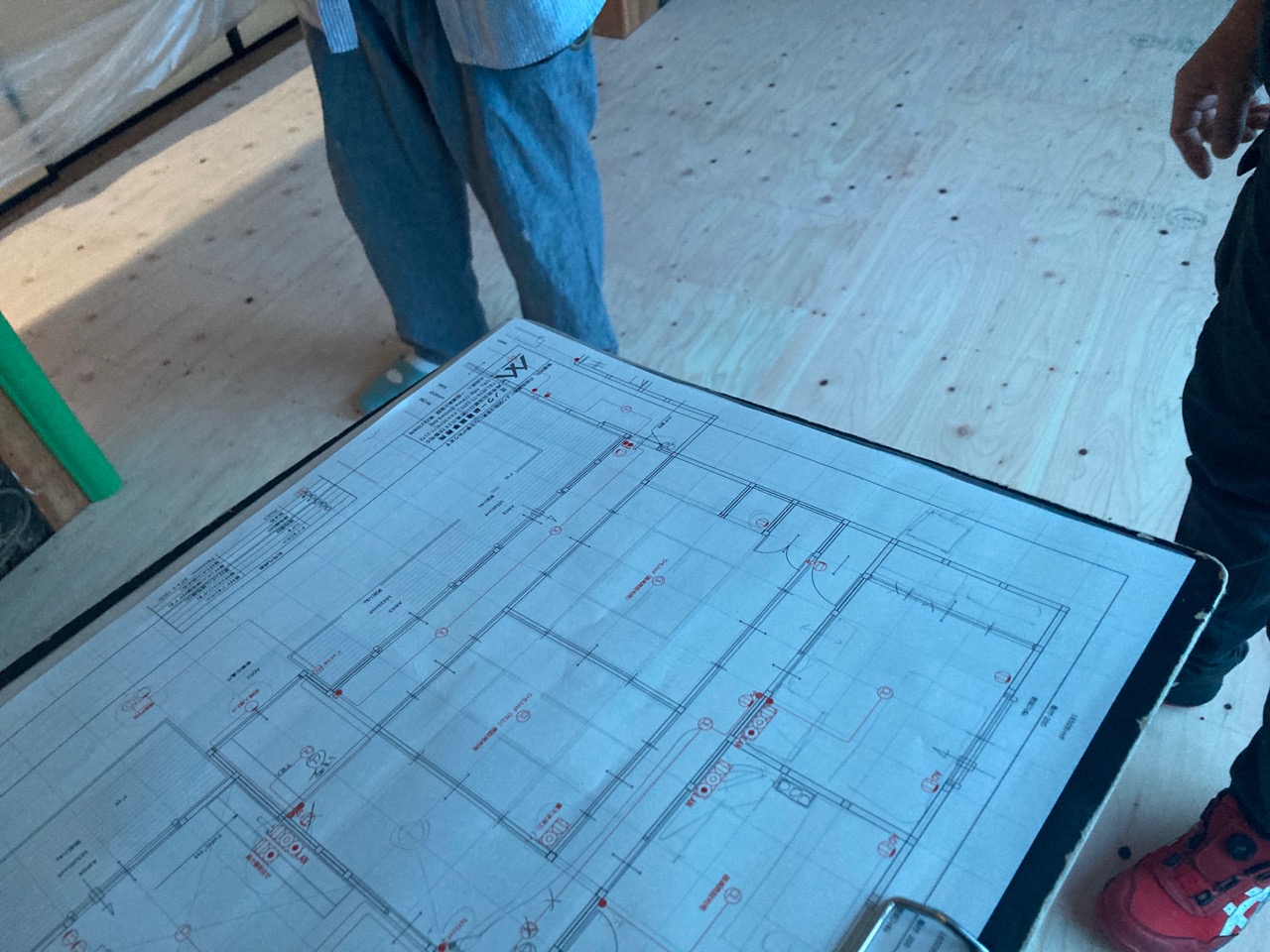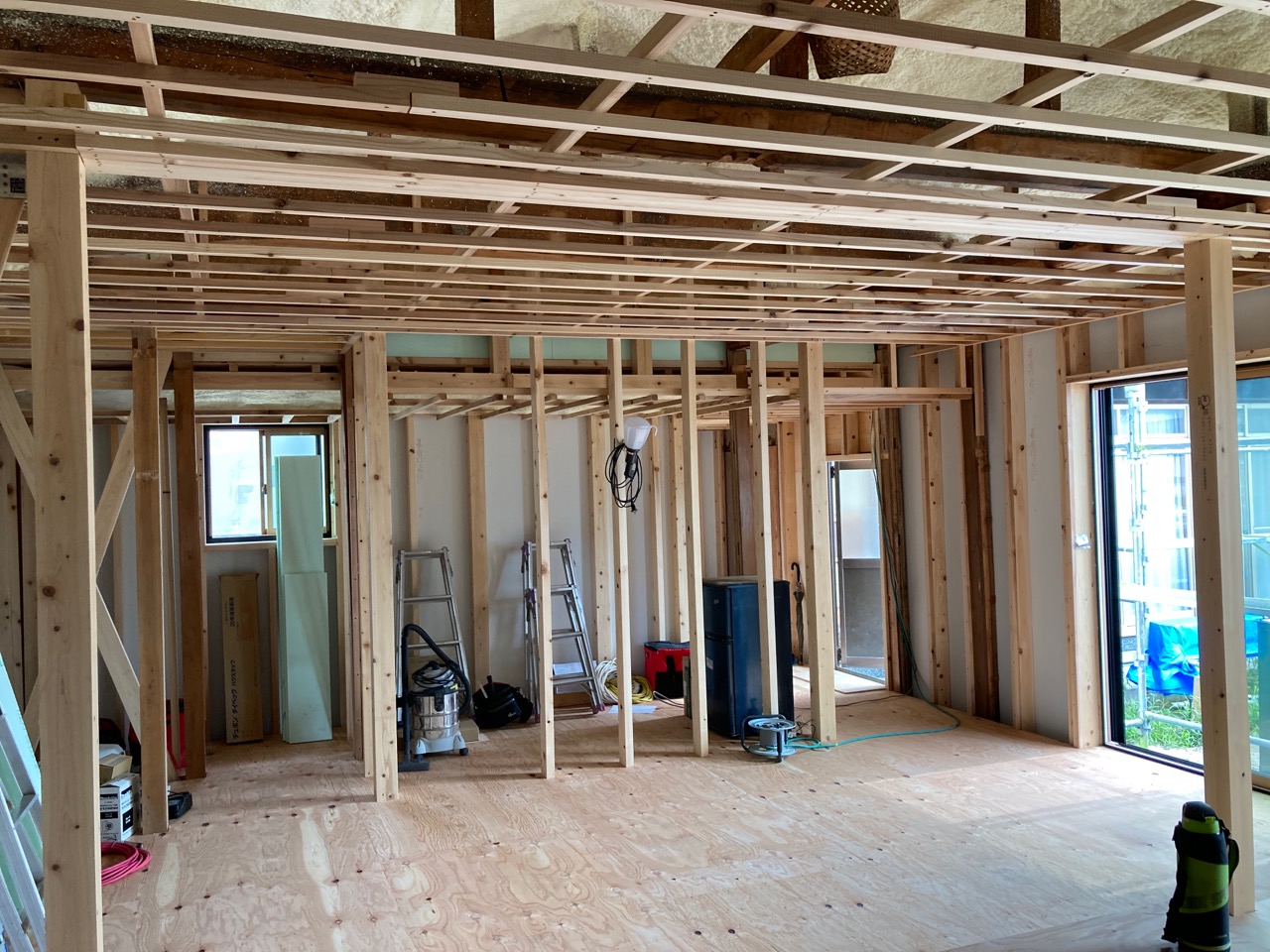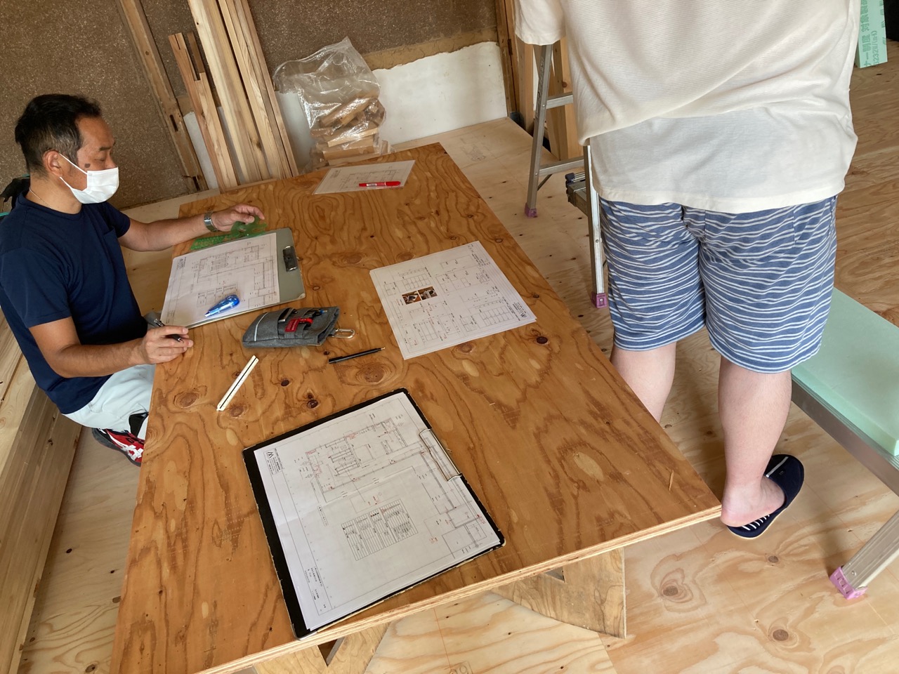 すっかり床下地、天井下地の終わっている現場で電気配線と収納棚のお打合せを行いました。先日までの長雨の名残か、お彼岸を過ぎたためか8月末といえど現場の中は思いの外暑くなく(それでも少し汗ばみますが)お打合せもスムーズに行われました。