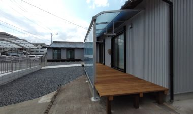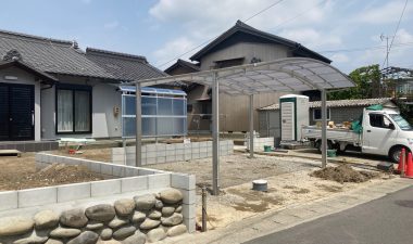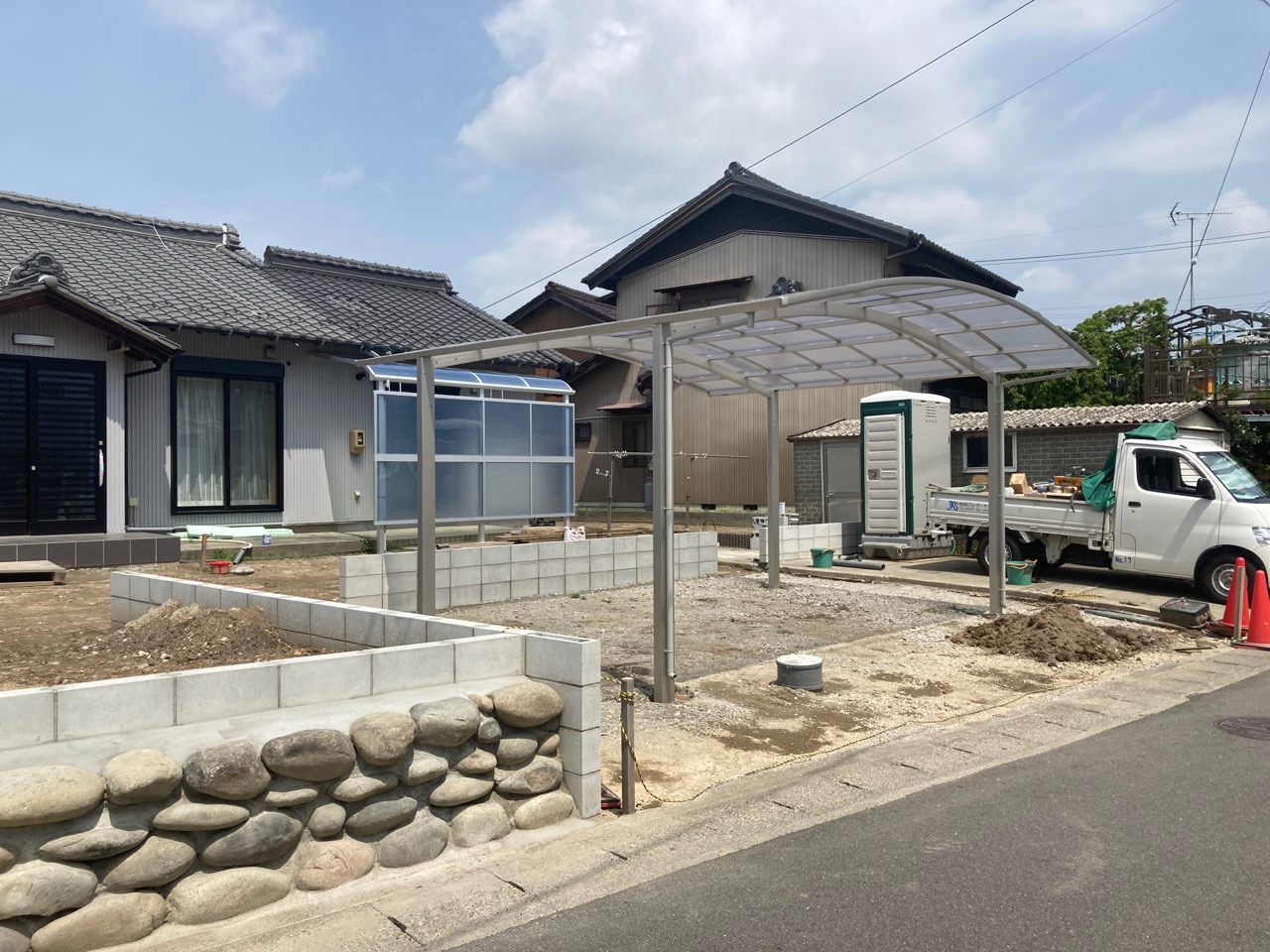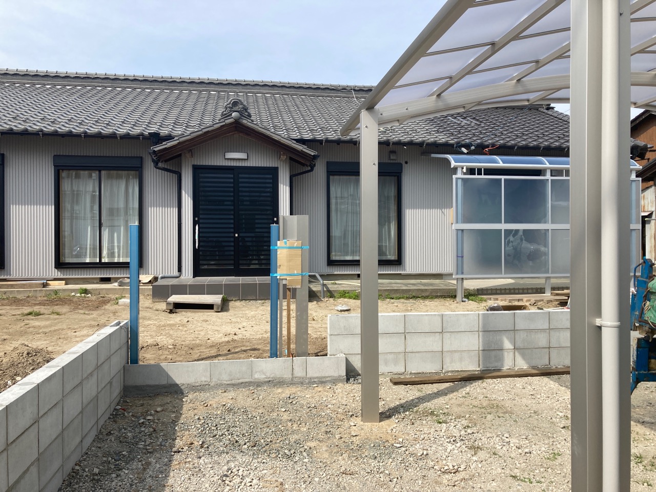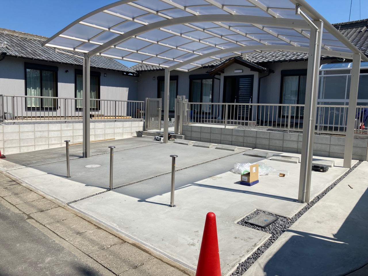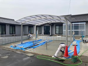 車庫にカーポートを設置しました。きわめて広大なi様邸の敷地、駐車場も取り放題ですが、このカーポートに2台、車庫に1台、青空で1台と合計4台駐車できる計画としています。後年、メンテナンスに訪れる我々としてはカーポートがあるとありがたいです。