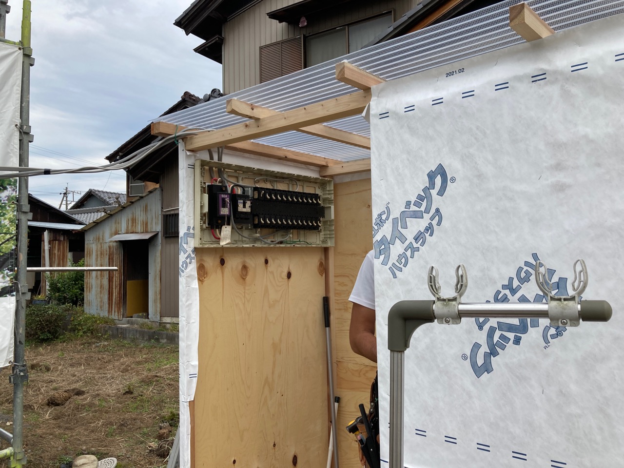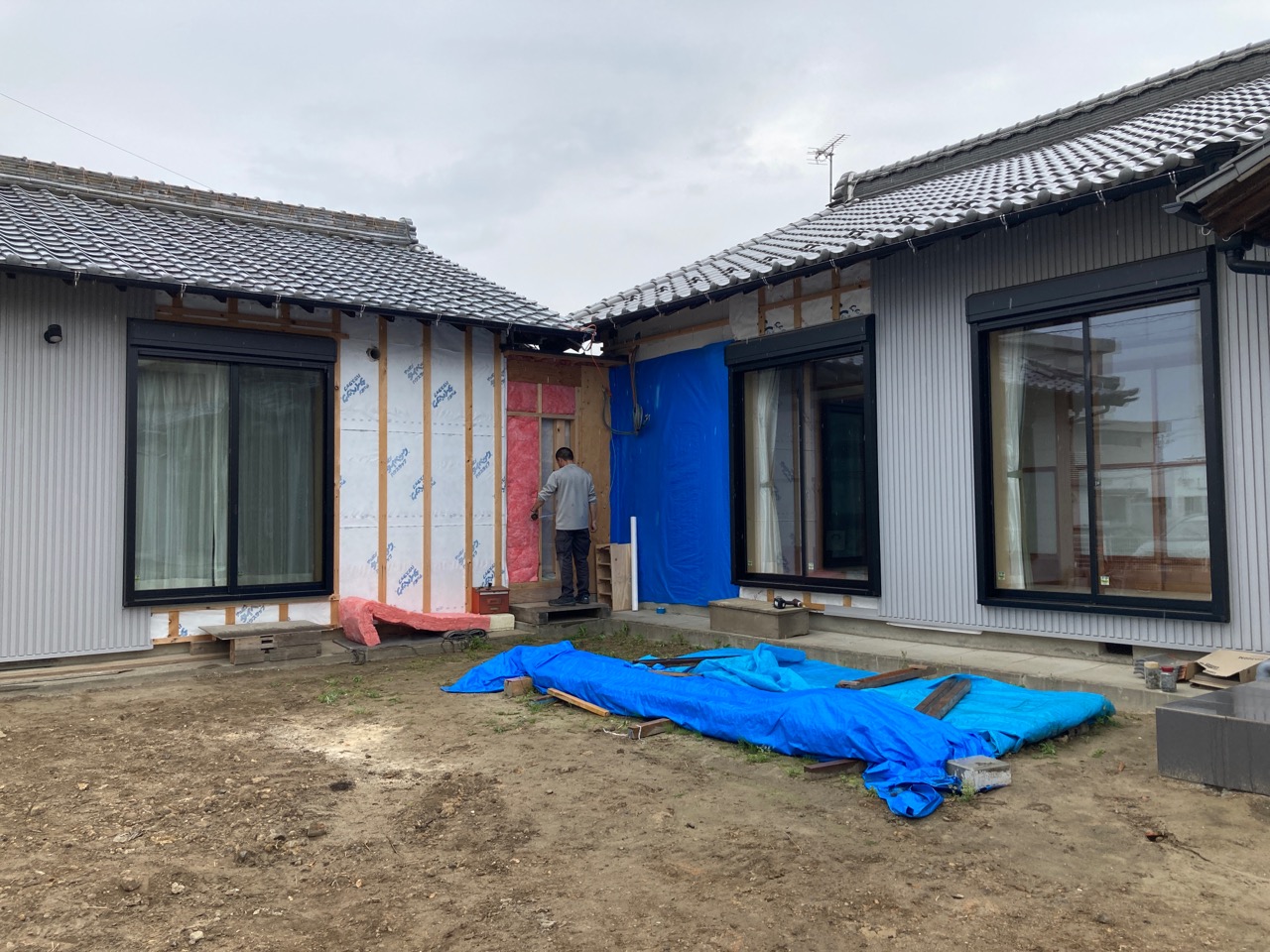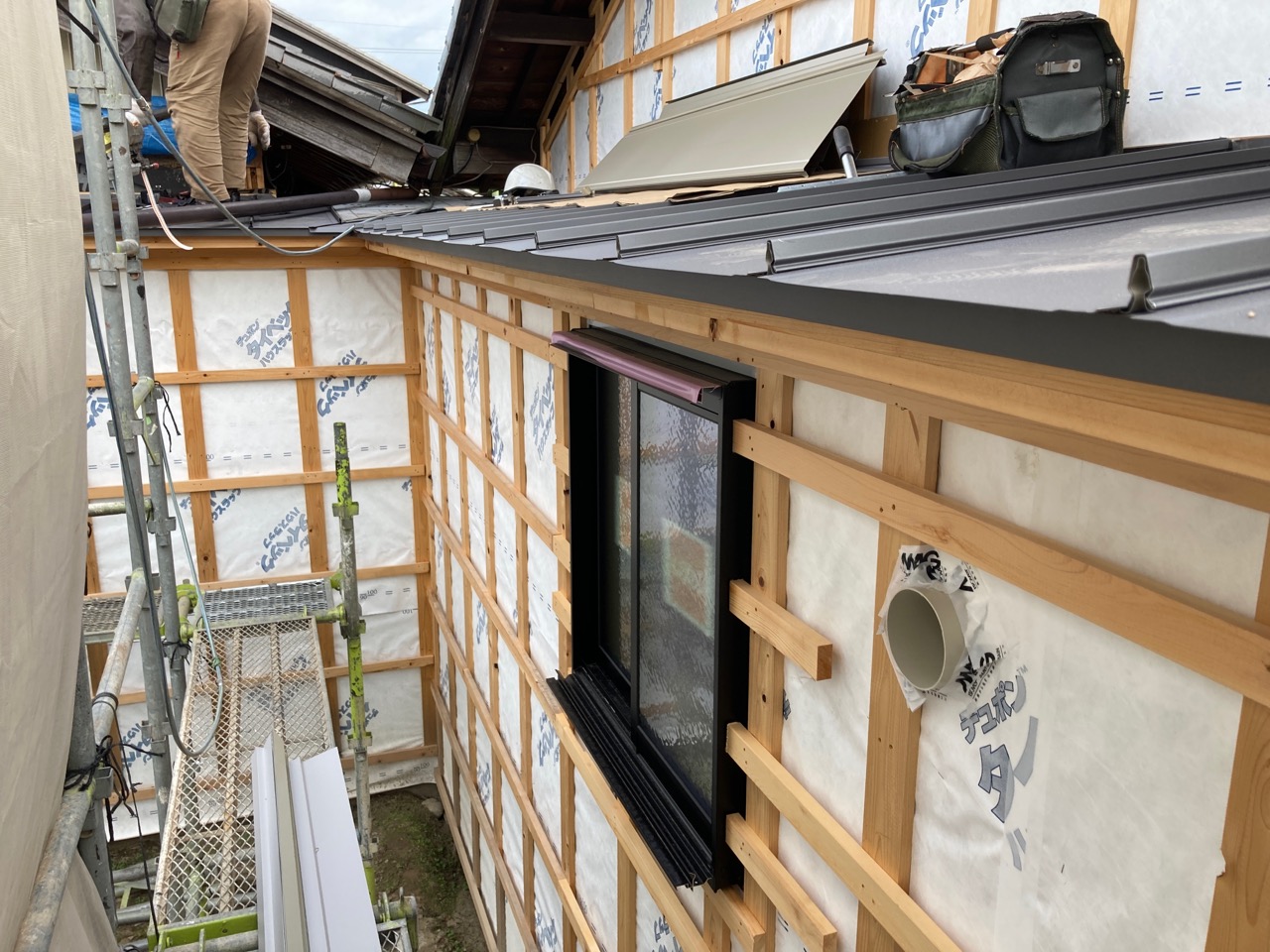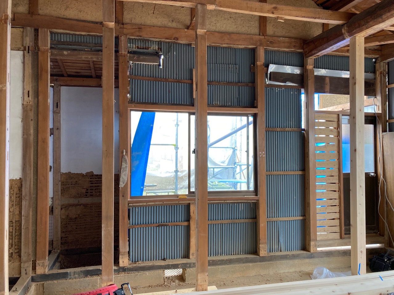 下地が完了しました。本日は初夏の日差しが照り付け、だいぶ日に焼けてきました。 これで後は外壁ガルバリウム鋼板を敷設すれば住宅のリフォーム工事も完成です。