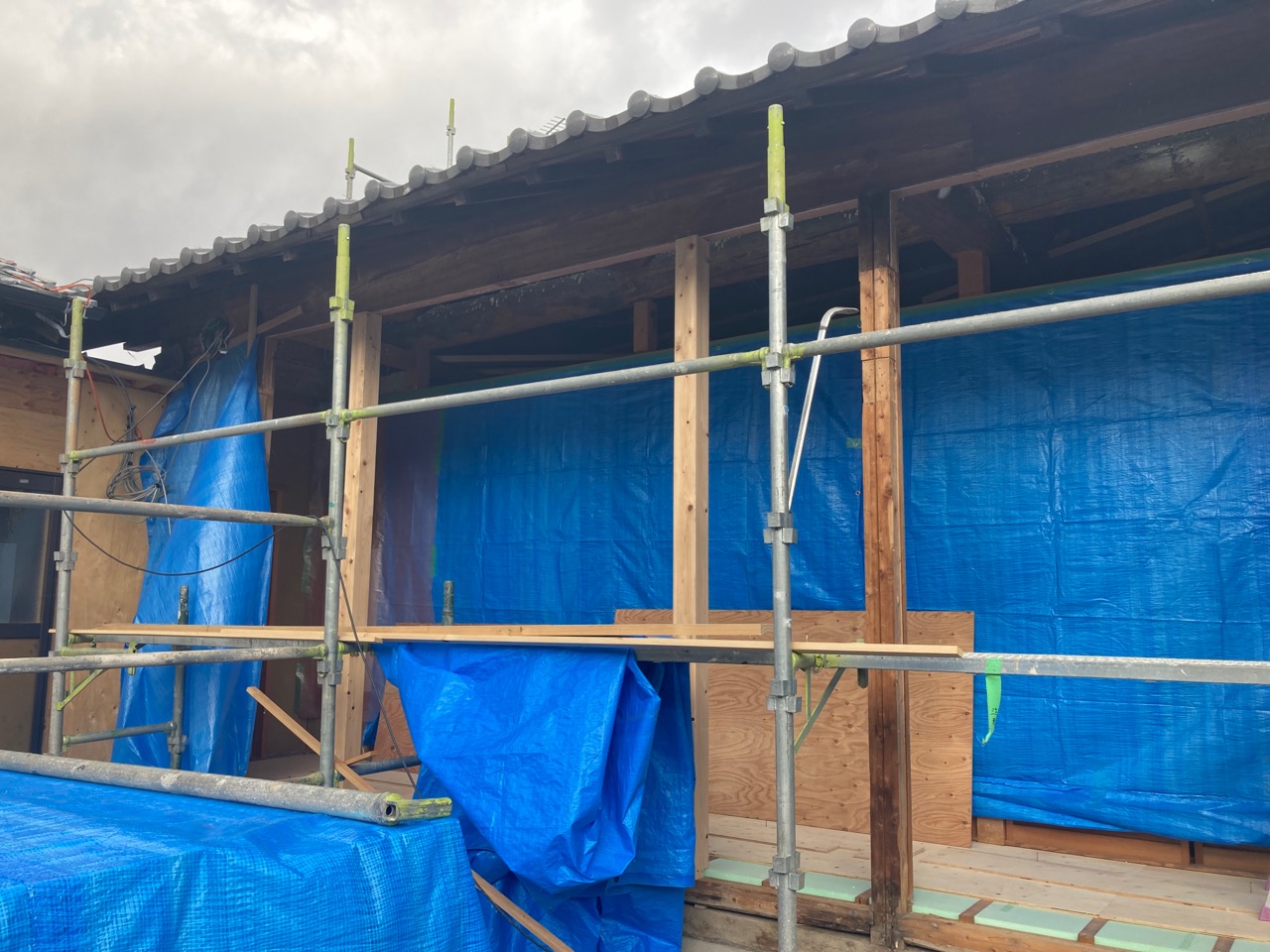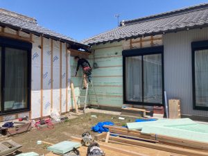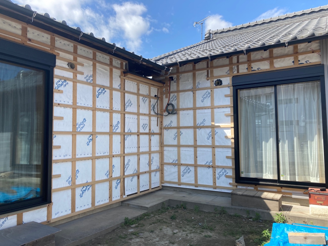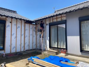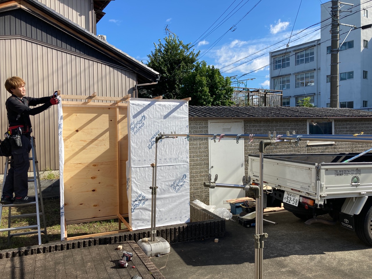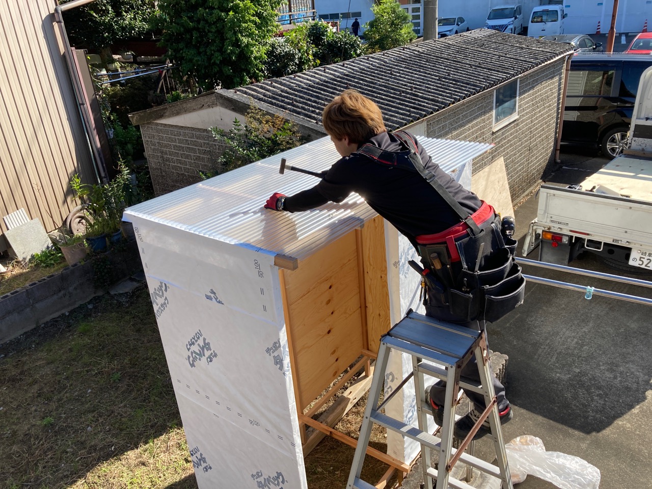 下地が完了しました。本日は初夏の日差しが照り付け、だいぶ日に焼けてきました。 これで後は外壁ガルバリウム鋼板を敷設すれば住宅のリフォーム工事も完成です。