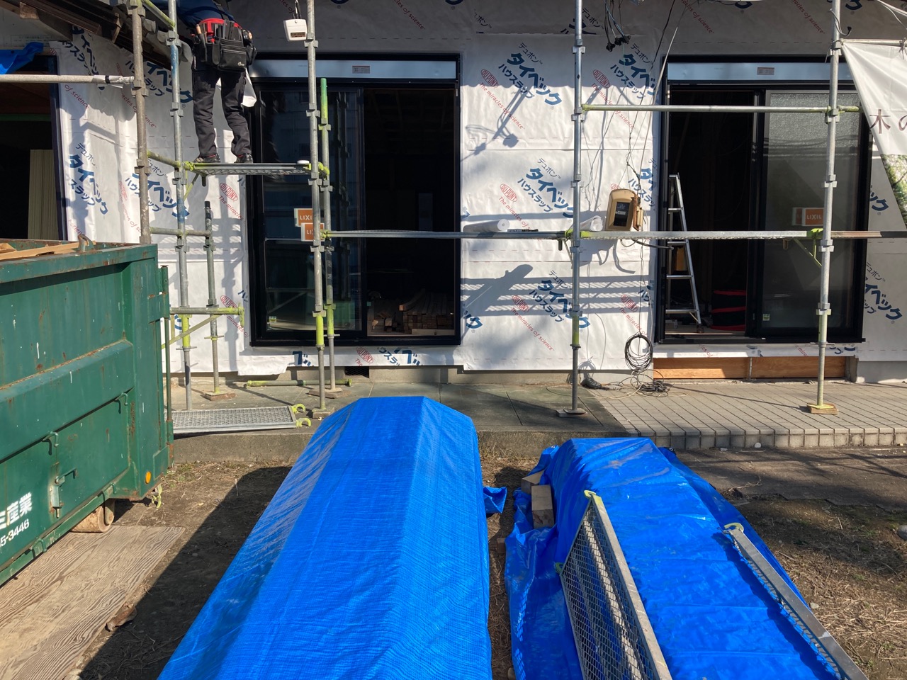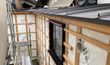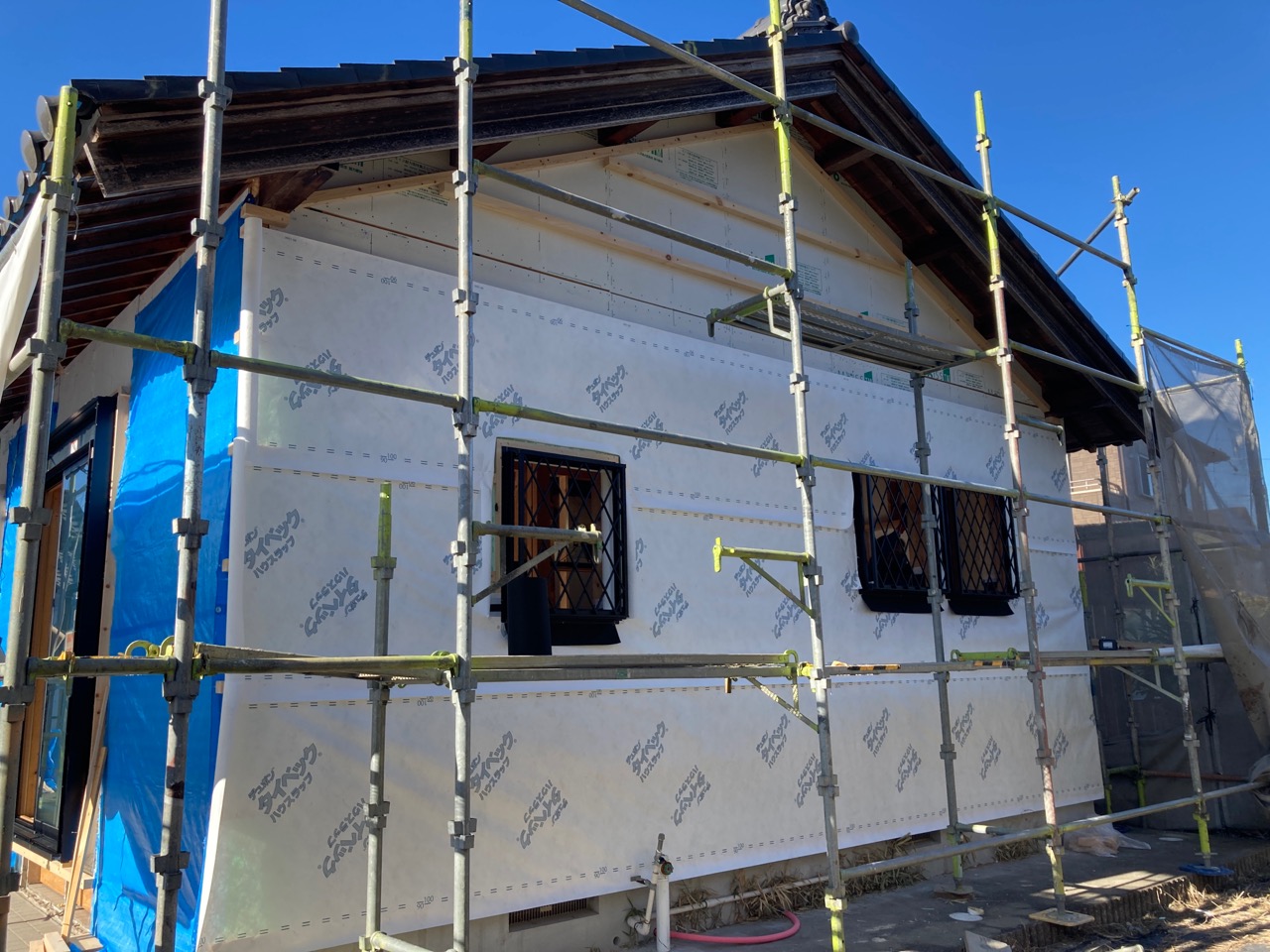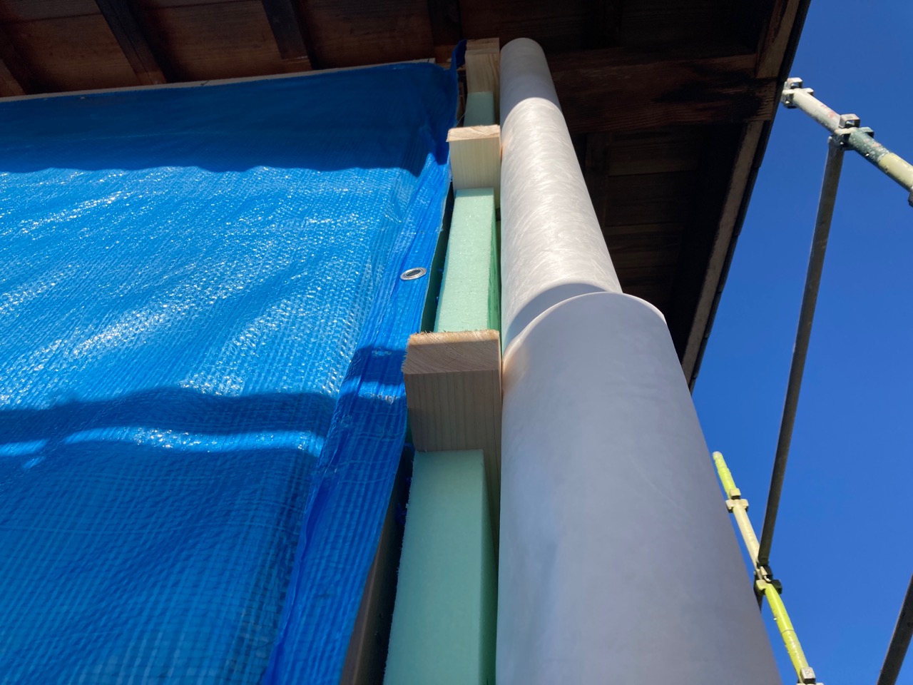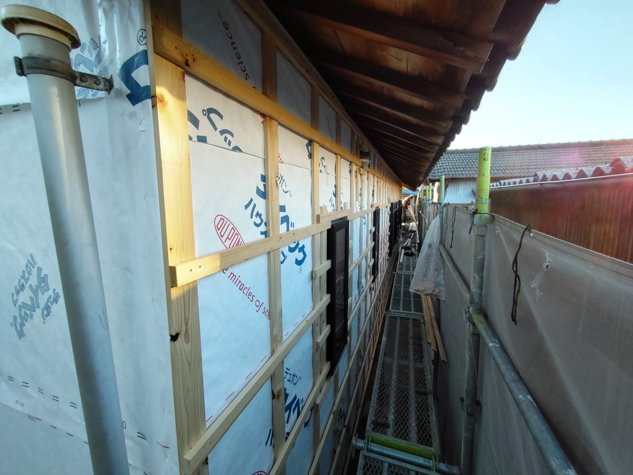 下地が完了しました。本日は初夏の日差しが照り付け、だいぶ日に焼けてきました。 これで後は外壁ガルバリウム鋼板を敷設すれば住宅のリフォーム工事も完成です。
