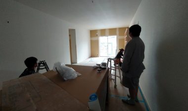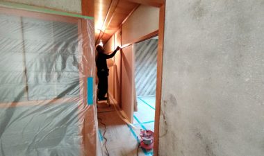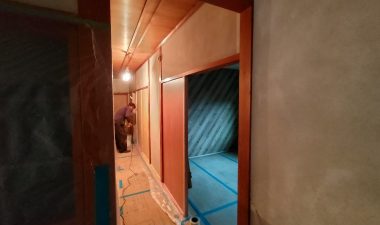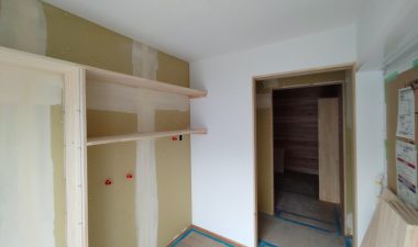 クロス業者さんがパテ処理に入りました。作業室は陳列収納棚を造作壁で起していますので、床面積に対してクロスの壁面積が多く、入り組んだ造りをしているためクロス業者さんも思いの外パテの量が必要になってきます。