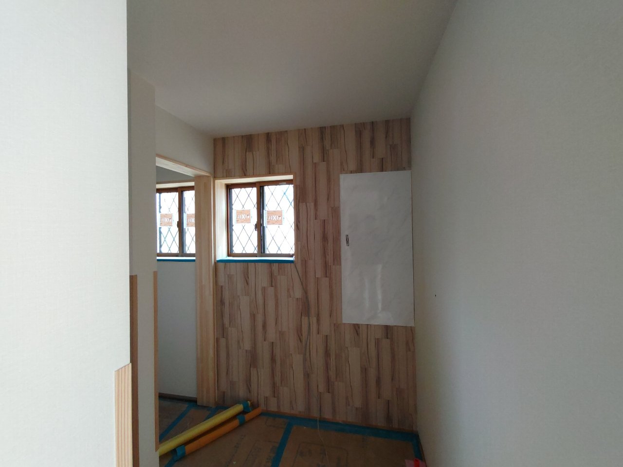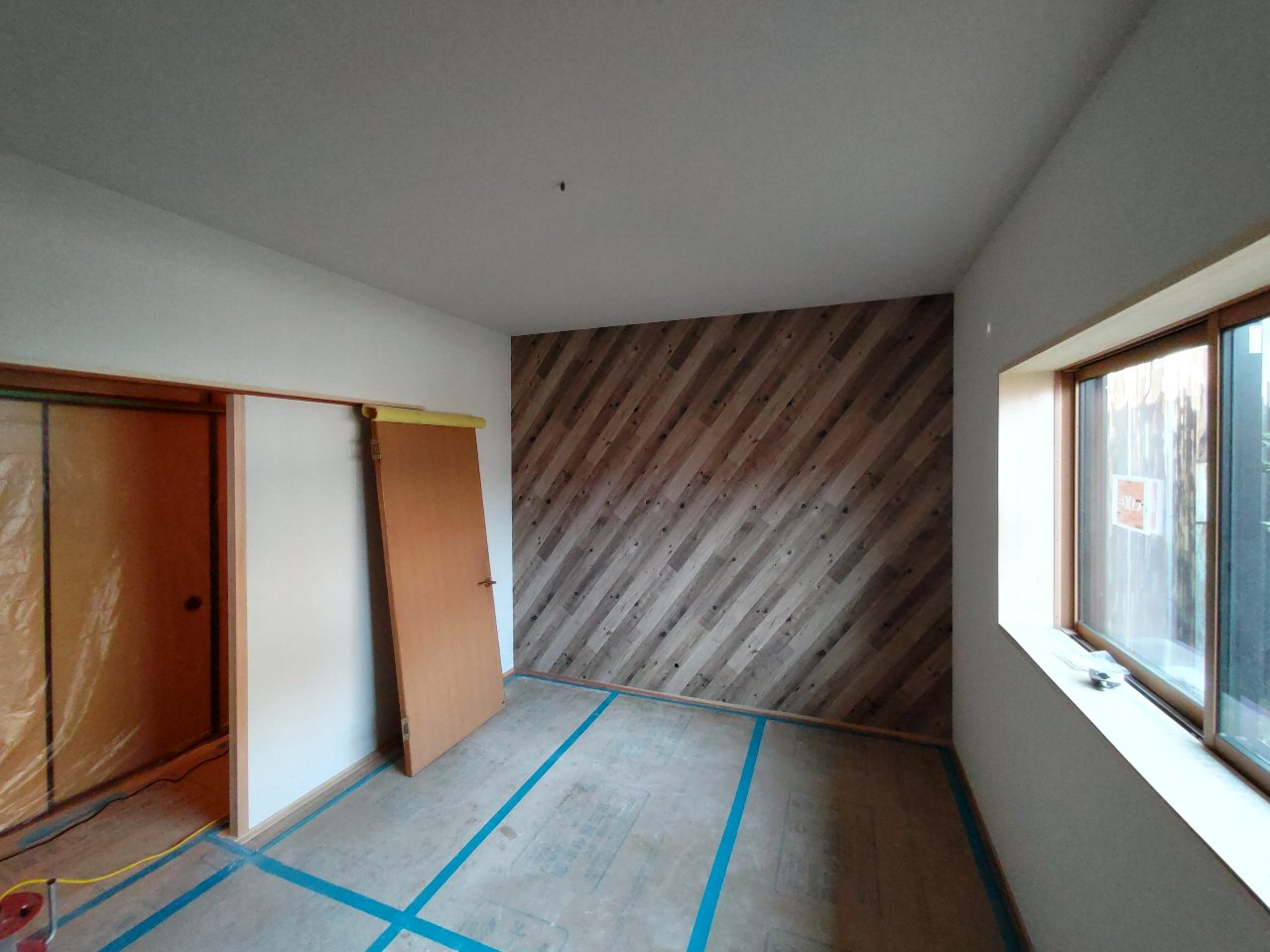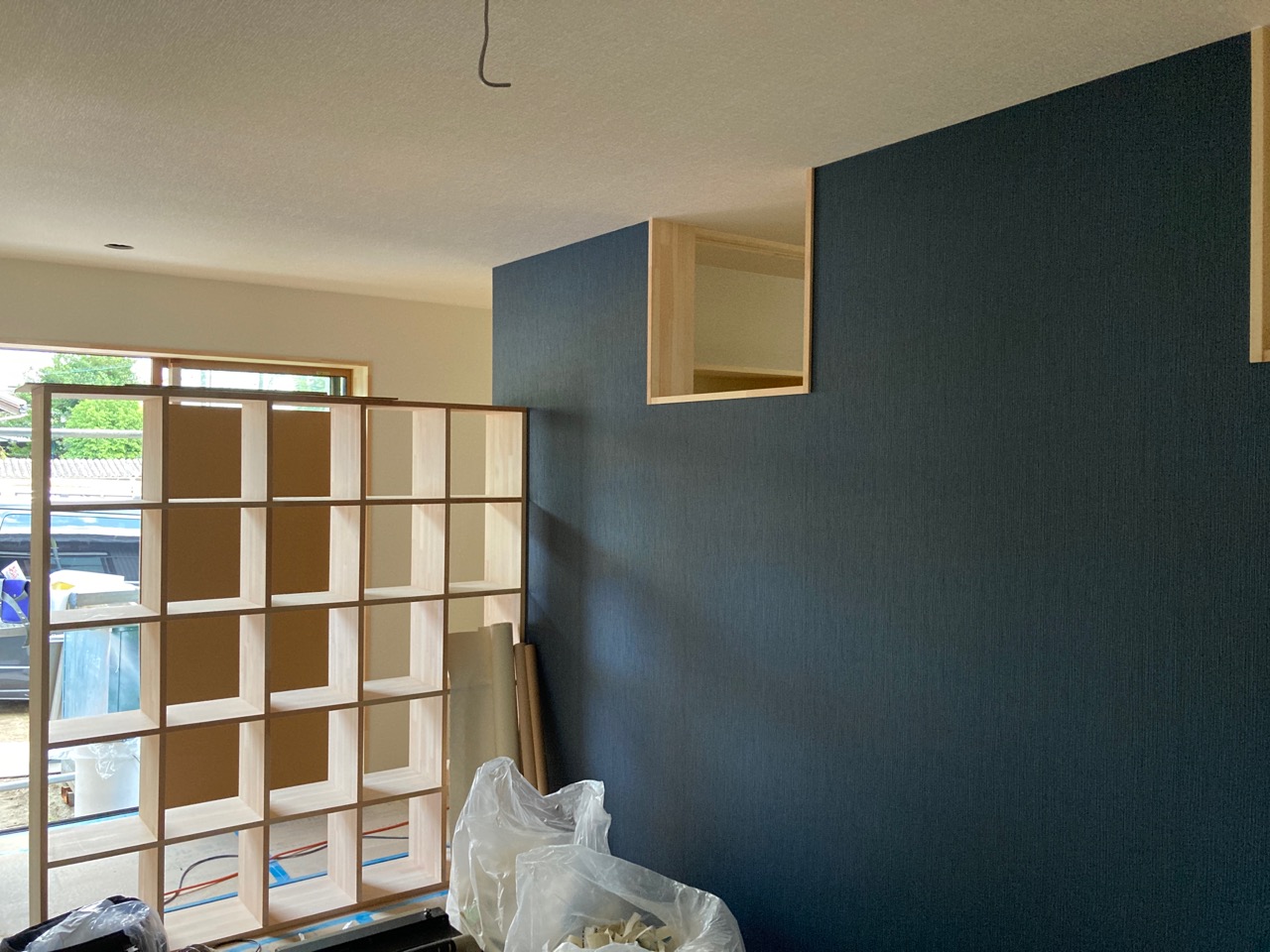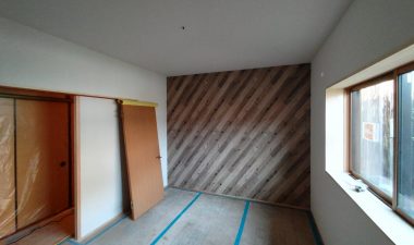 部屋数としては2室、面積的にはそこまで多くないので意外に素早くクロス工事が終わりました。メインのホワイトに各アクセントクロスが映えています。
