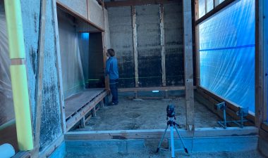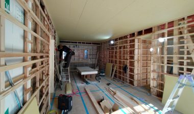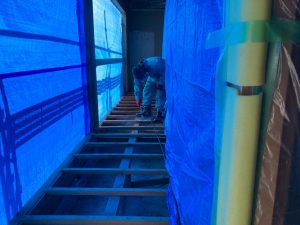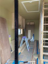 現場内は内装下地が着々と出来上がってきています。既設解体前は肉眼でそれほど感じませんでしたが、やはり若干柱の垂直が保てていないようですのでそれらを下地で調整しながらボードを張っていくため、新築と違って少々手こずるようです。