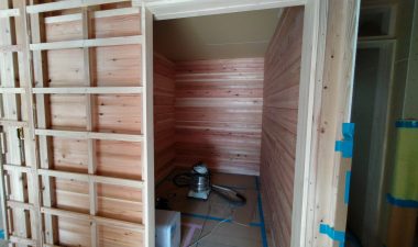 離れの二室を分ける間仕切壁が造られ始めました。間仕切りと言っても二室は通路でつながっており、完全な個室同士ではありません。むしろ離れ全体が大きなプライベートスペースとなります。その離れの中で就寝スペースと、趣味室を隔てる間仕切ですので冷暖房や換気がスムーズに行えるように壁の一部には開口を設けています。