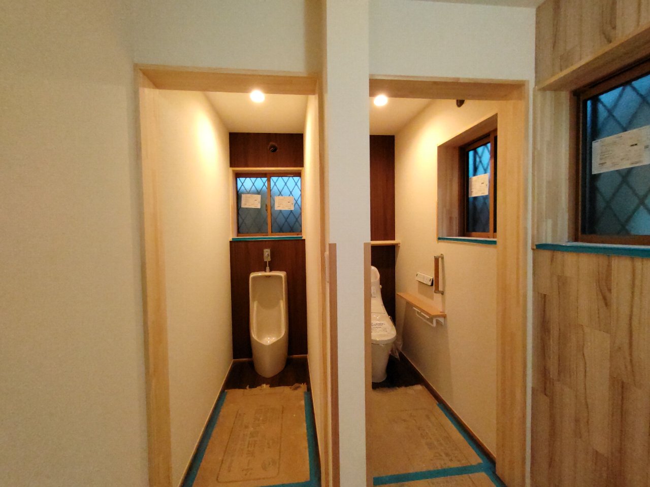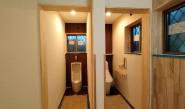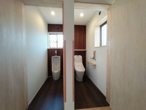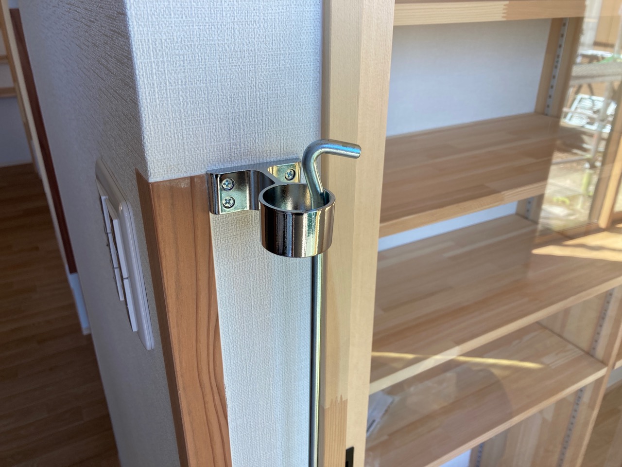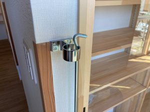 個室の収納前は当初は扉でしたがロールスクリーンを下す事で目隠しとする事としました。