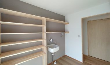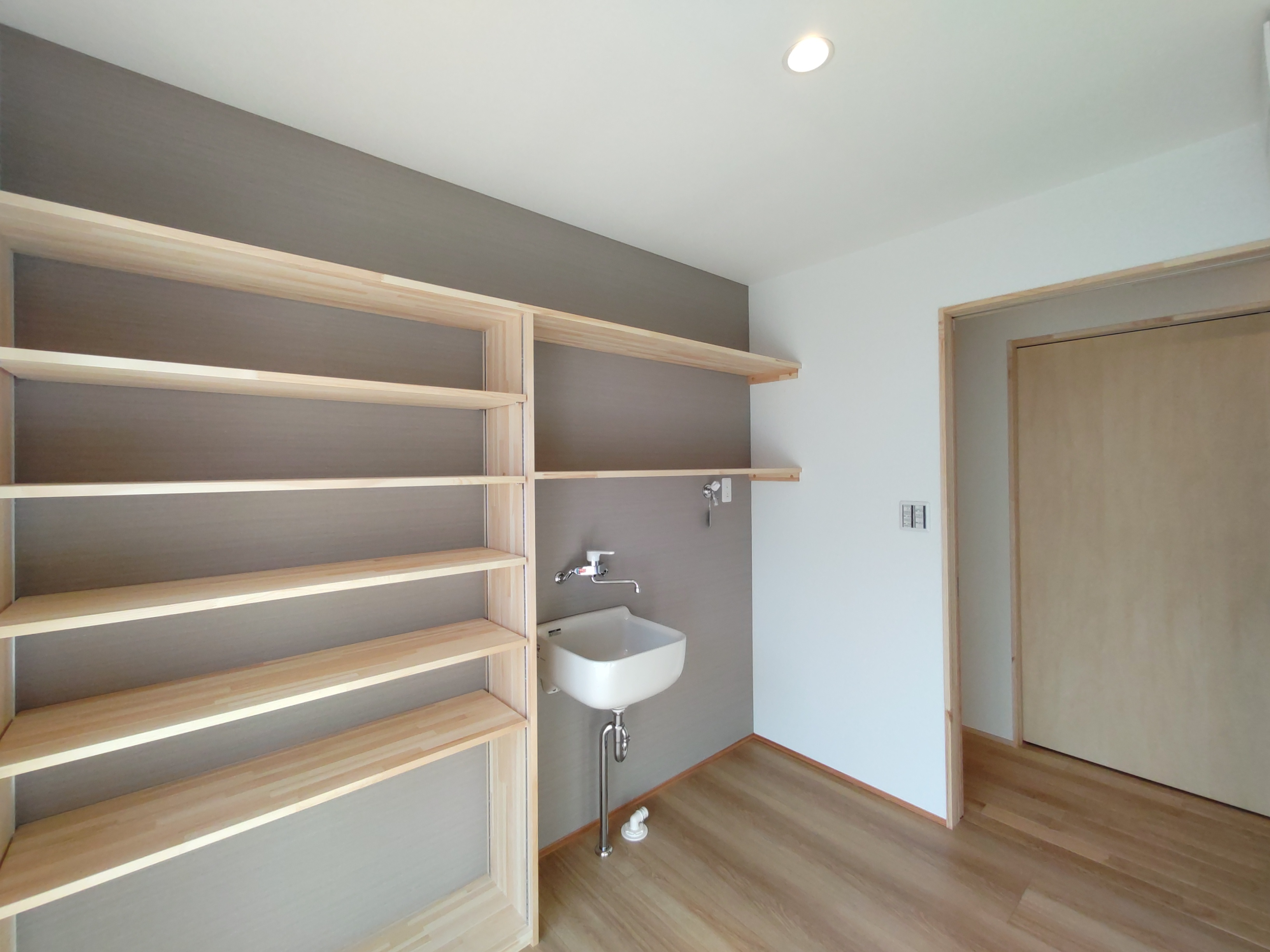 洗濯室からすぐに外へ出て屋根下で洗濯物を干す事ができ、急な荒天でも安心です。