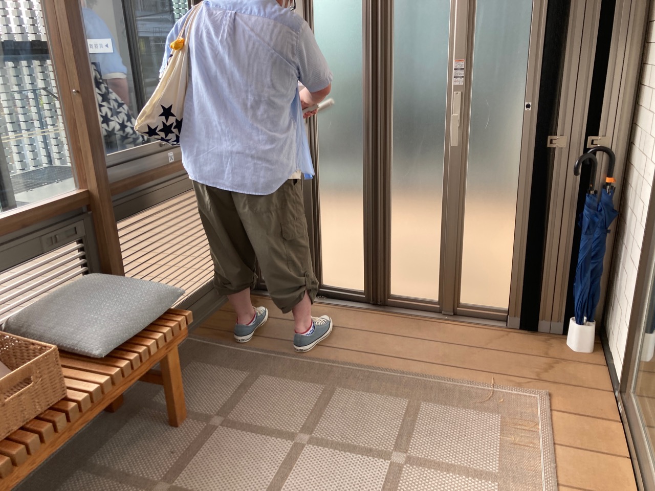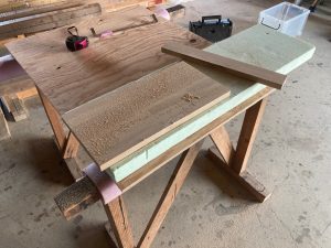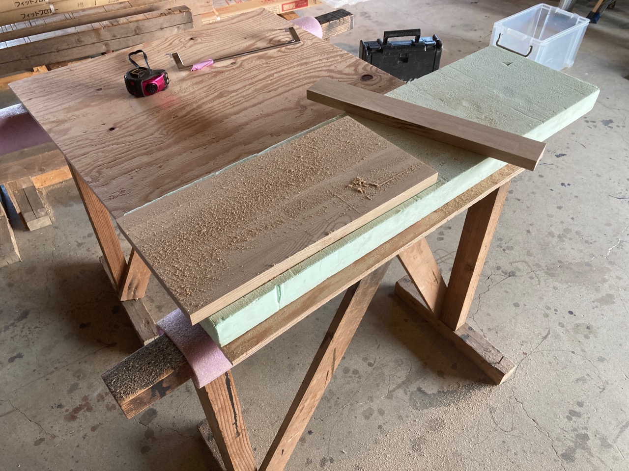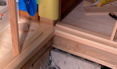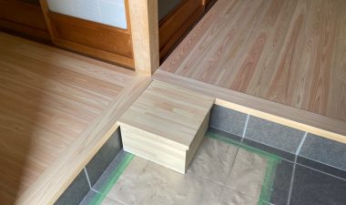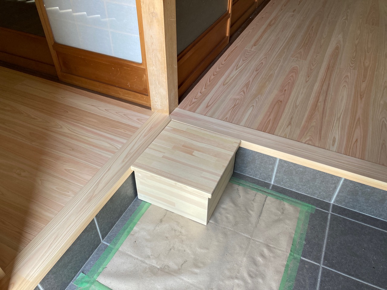 写真向かって右はホール(廊下)、左は和室の広縁ですが、双方には行き来できる床はありません。解体前には式台がありそれを渡って行けたのですが、玄関高さの都合上式台は取り外しました。和室の中を通っていけば行き来はできますが、通らなくてもできるように一つ踏み台が欲しいとの事で制作してみました。滑り止めを付けて置くだけの簡単な台なので比較的容易にできます。