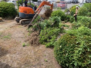 本格的に工事がスタートしました。住宅のリフォームに際し、庭も改造しますのでまずは庭木の撤去作業から入ります。工事期間中は工事車両を駐車するためのスペースともなります。