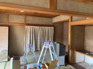 元は八畳間の座敷と六畳間の続きであったこの離れの建物、間仕切りには欄間が設えられていました。まずはその周りに塗られた土壁を落とすところから始めています。