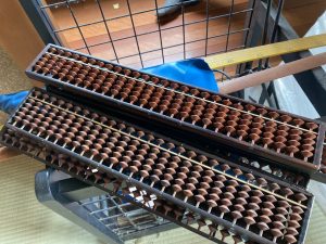 i様宅の座敷の片隅にあった算盤。珠が五つの物は私もだいぶ昔に一度見た覚えがあります。