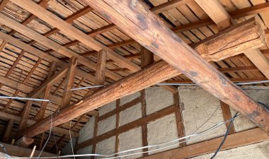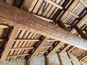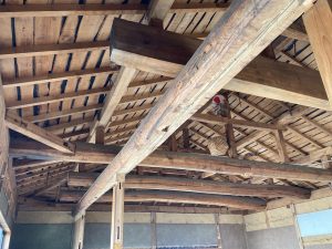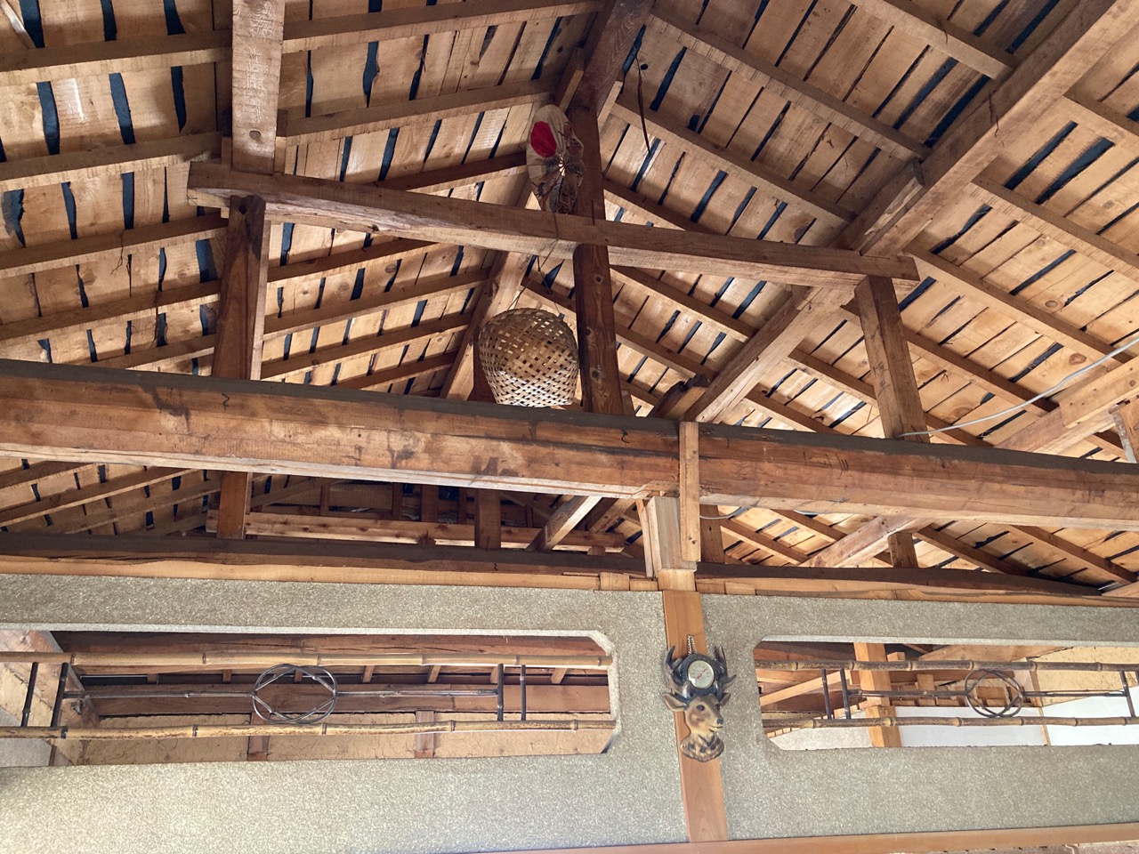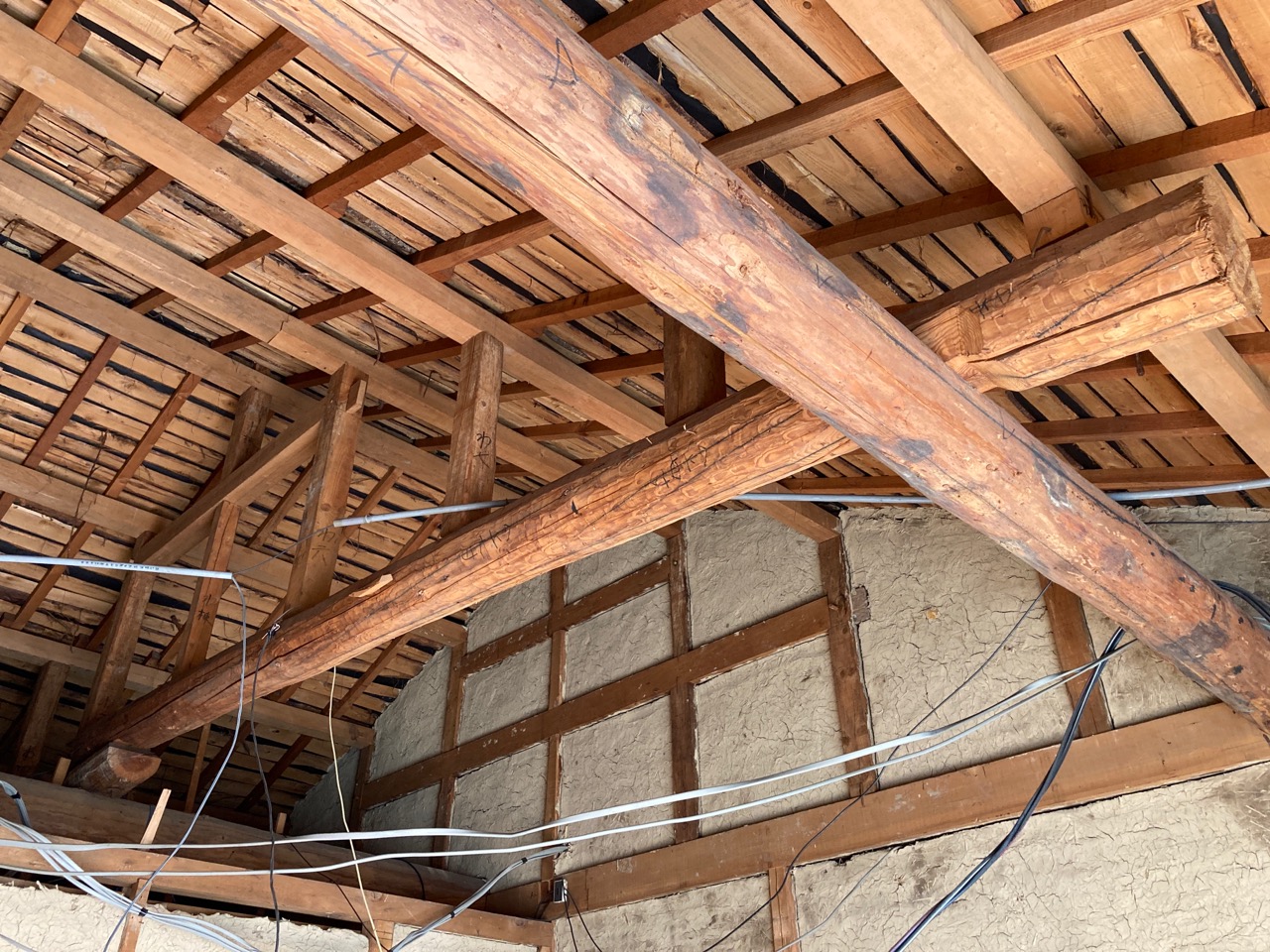 構造を見てみたいため、小屋裏に上ったところ、築年数の割にはしっかりとした架構が見て取れました。立派な地松の梁で組まれています。雨が漏ったような様子もなく、これを解体するのも惜しいなと思われました。